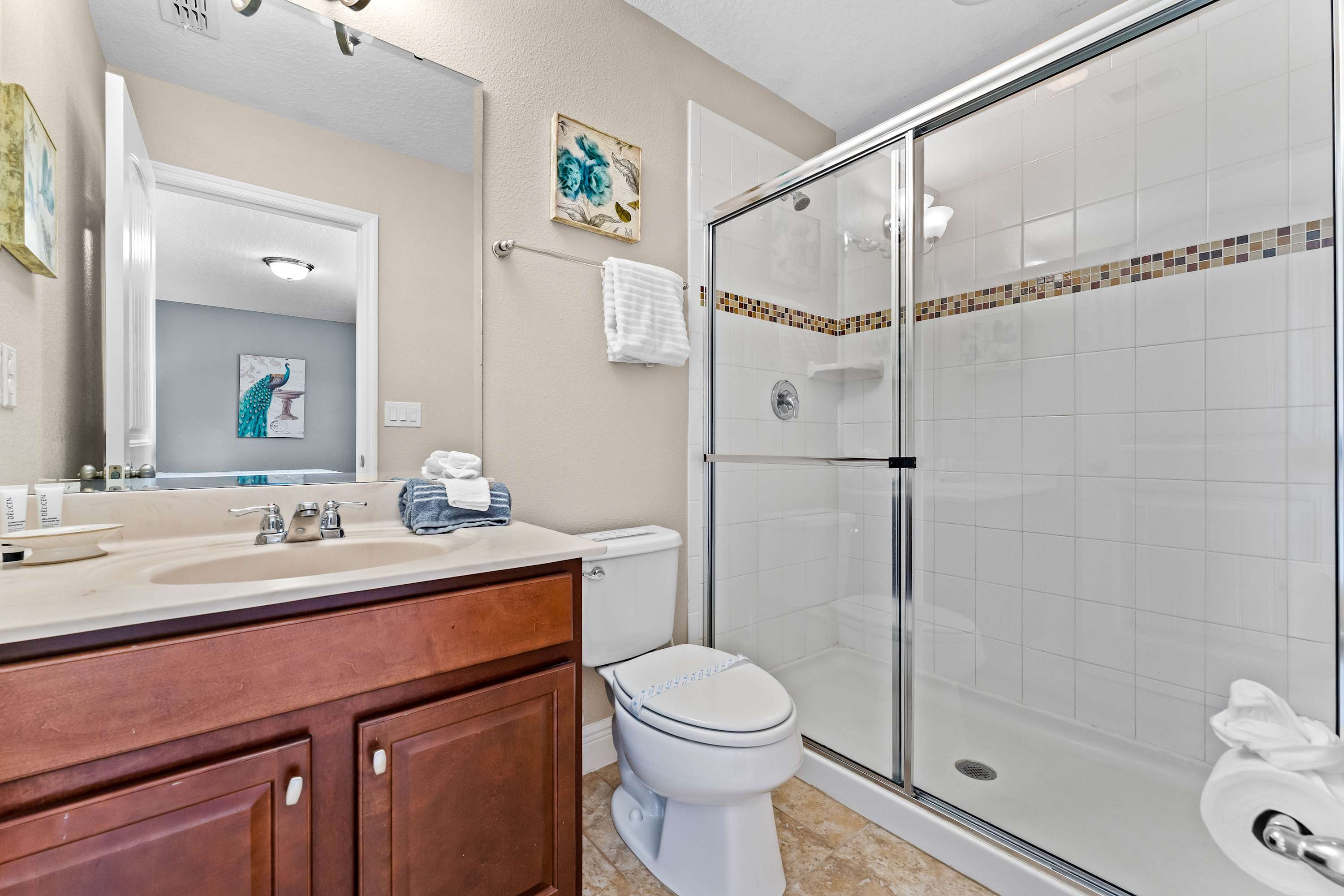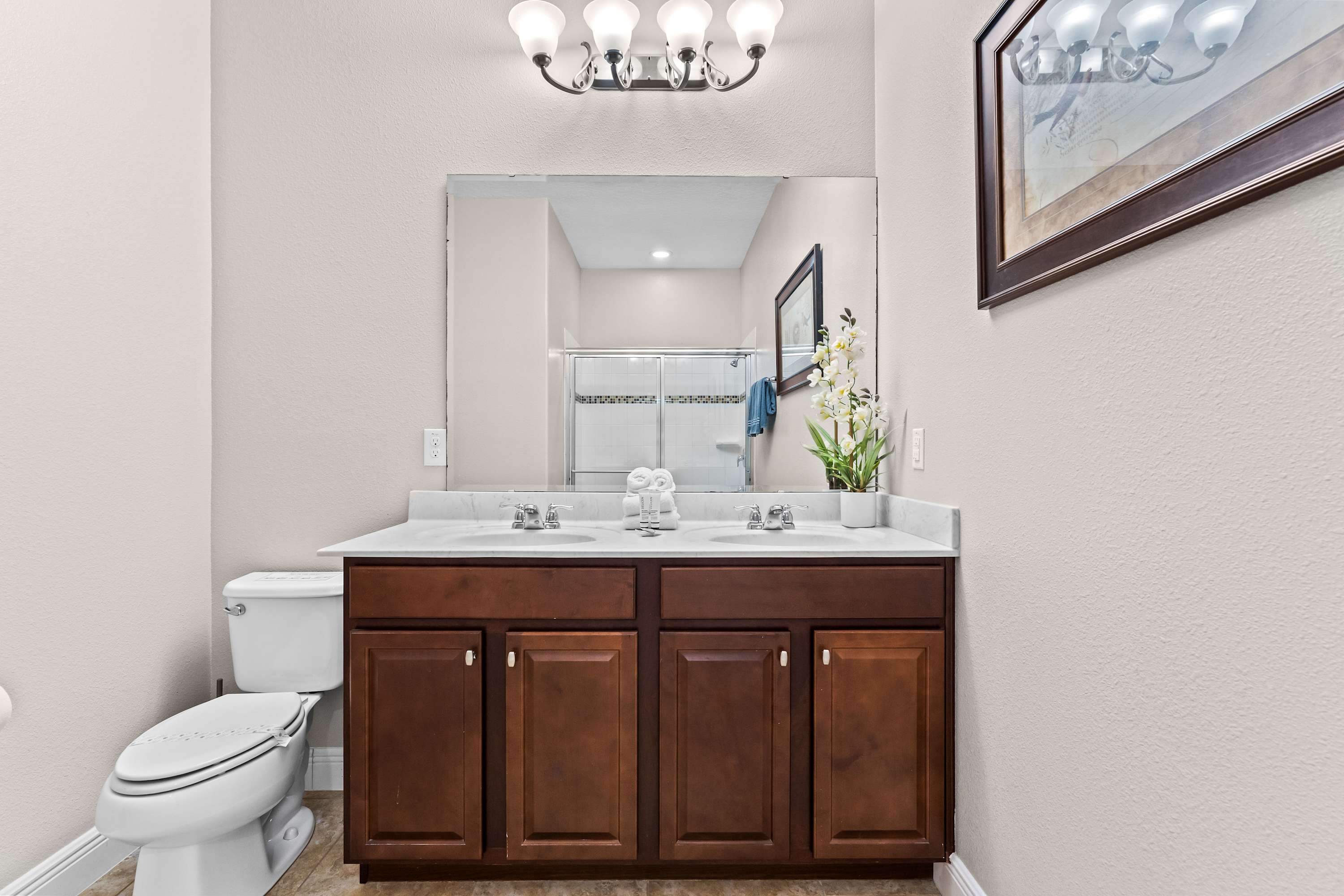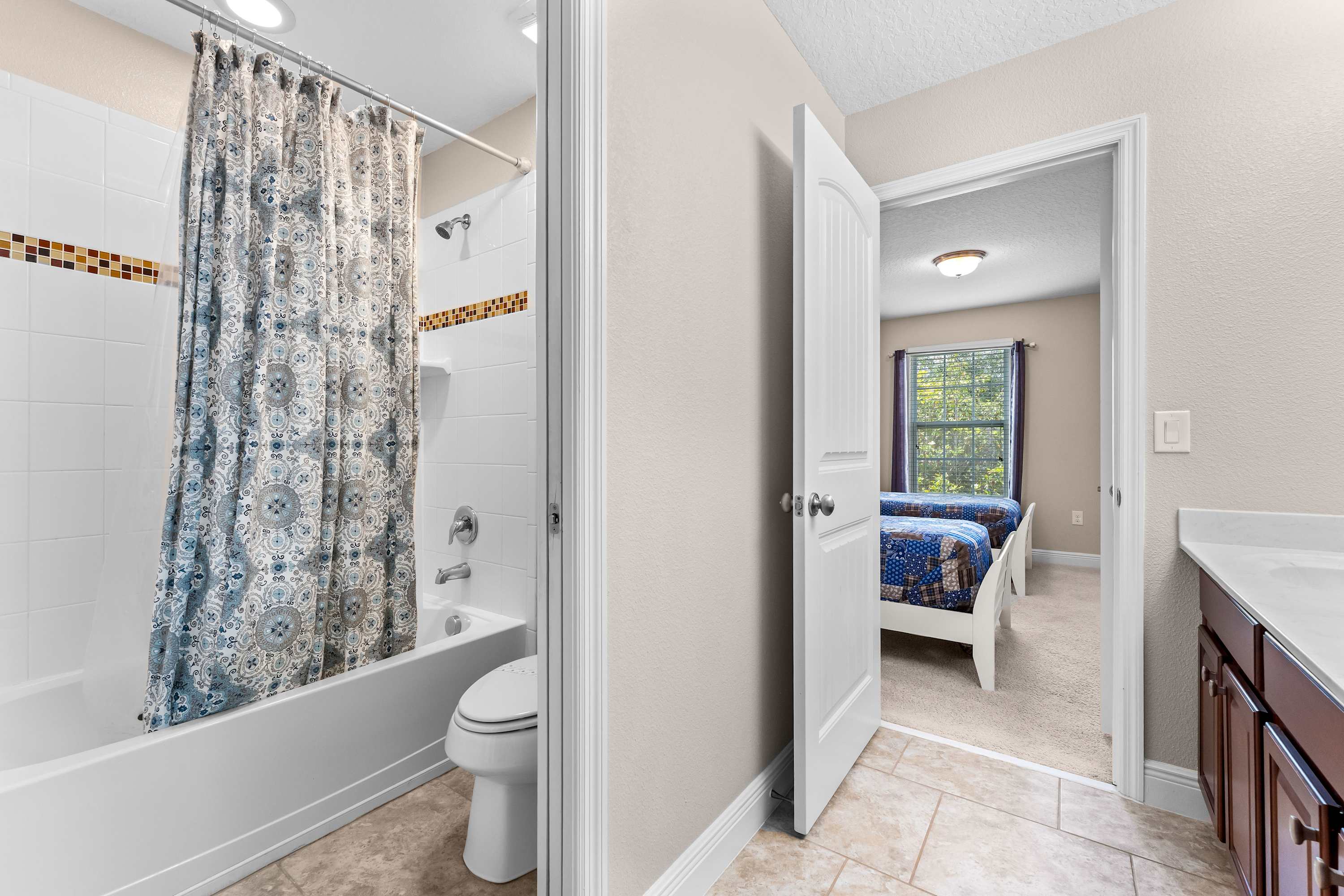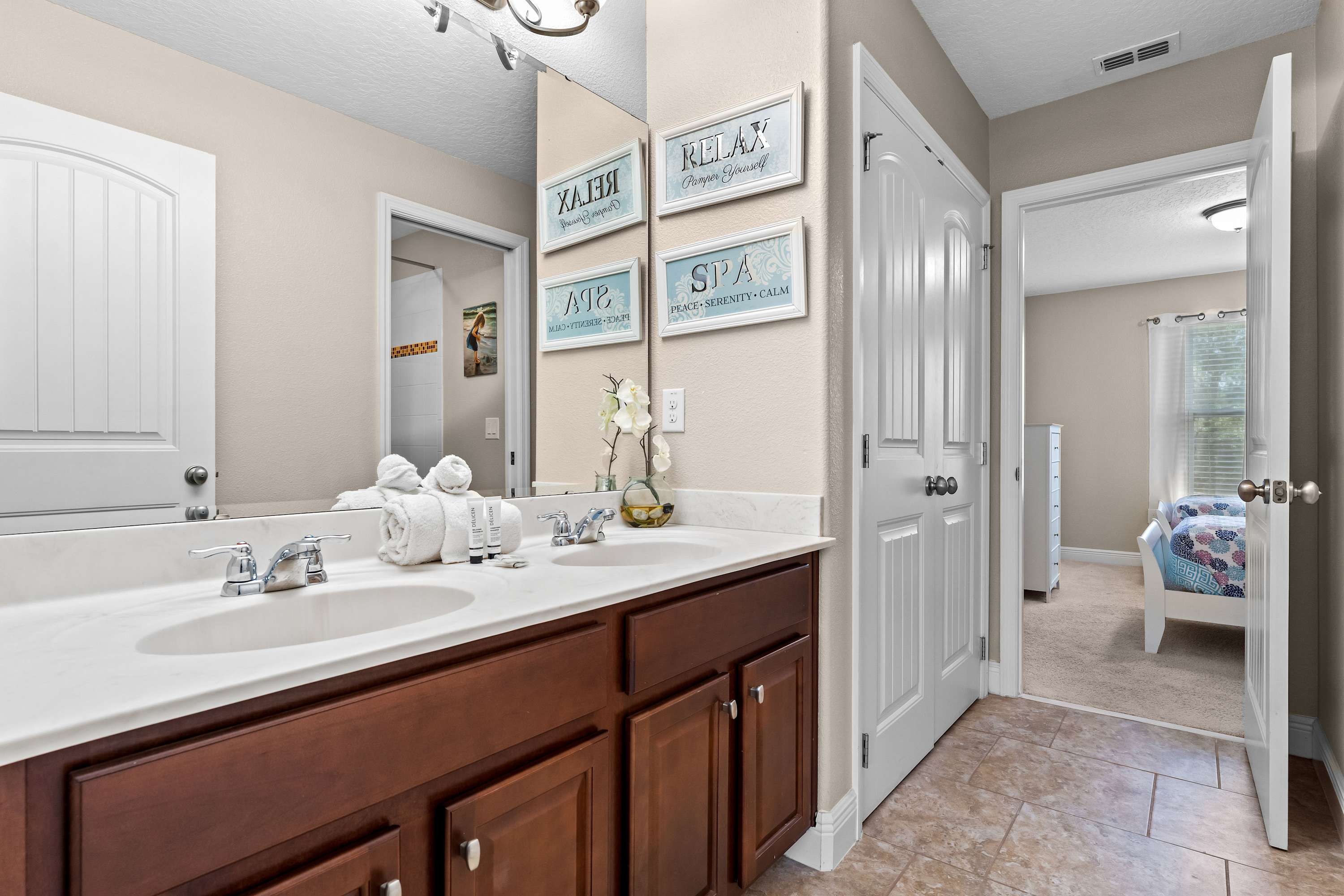 Bedroom #2 includes 2 twin size beds, a smart TV, and a Jack-and-Jill bathroom, shared with bedroom #3, with a dual vanity and a shower/tub combo.