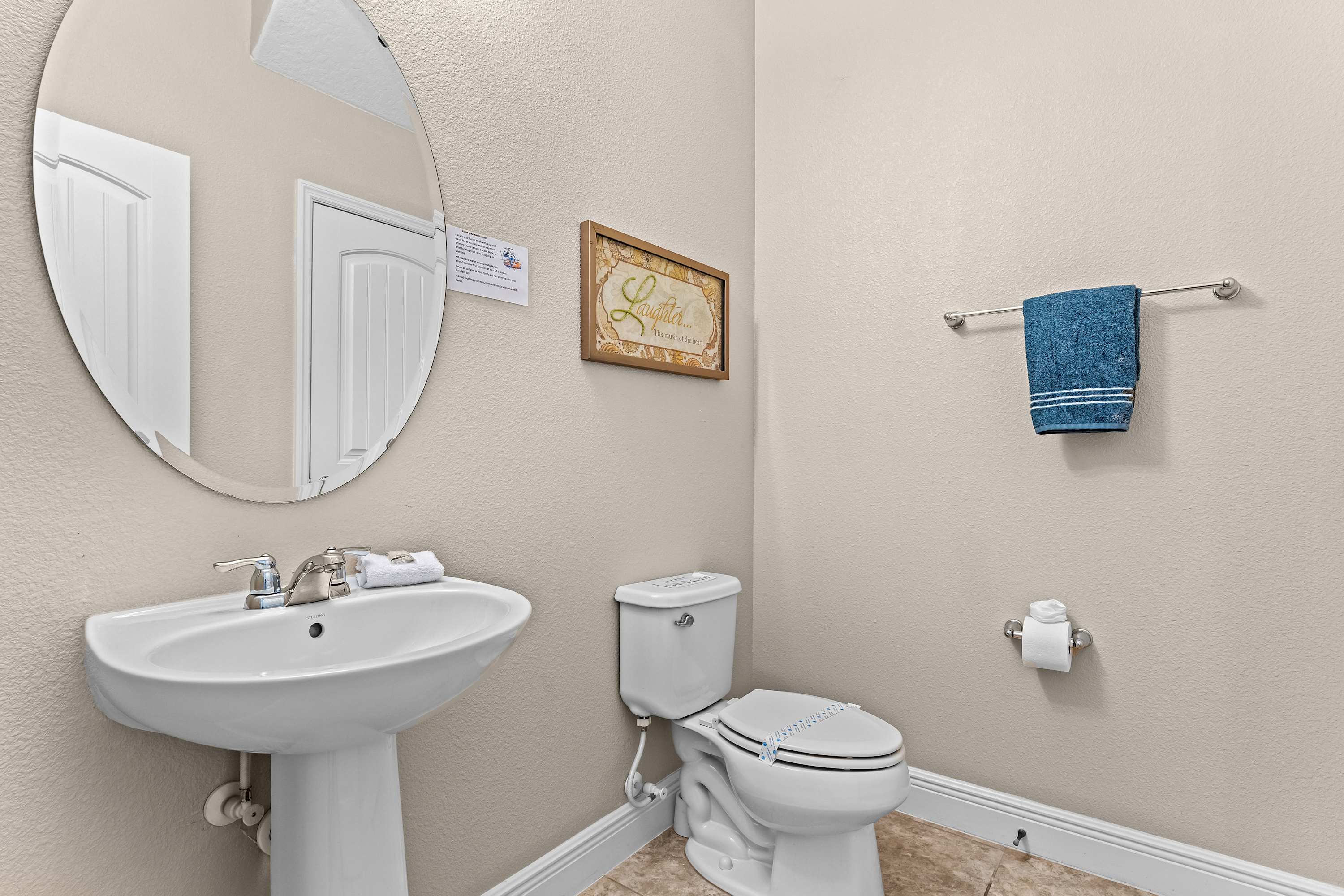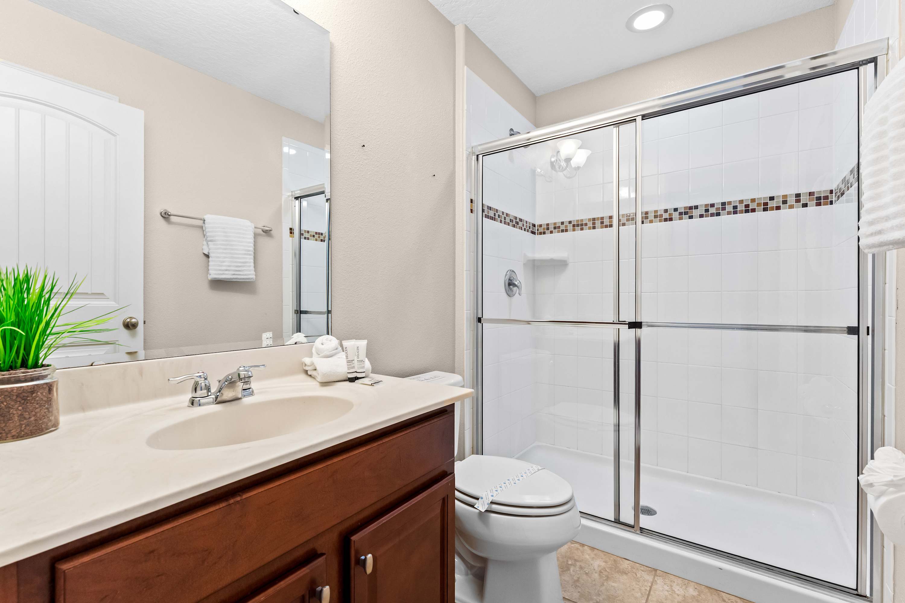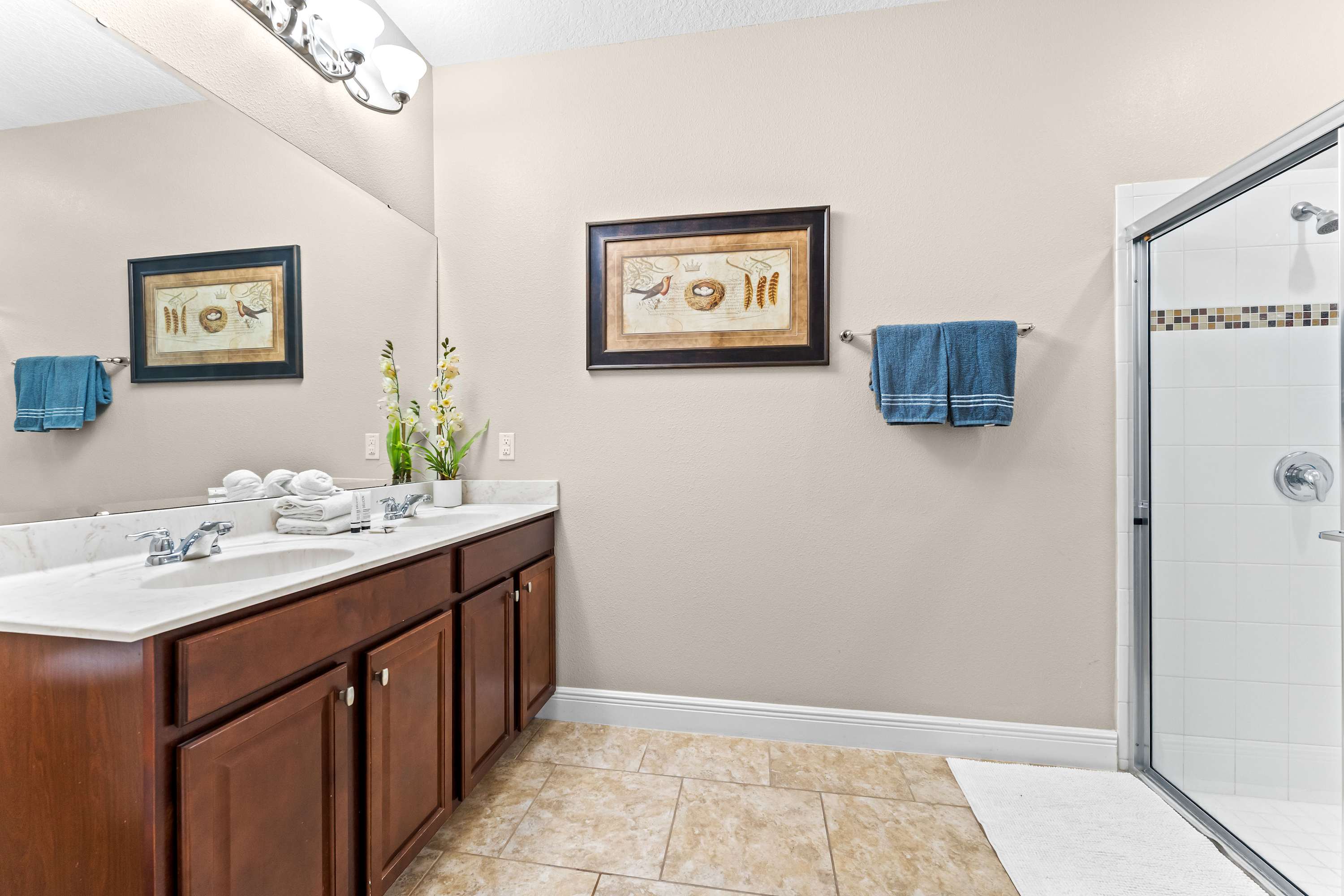 This home also includes a half bathroom with a pedestal sink and an additional full bathroom with a single vanity and a walk-in shower.