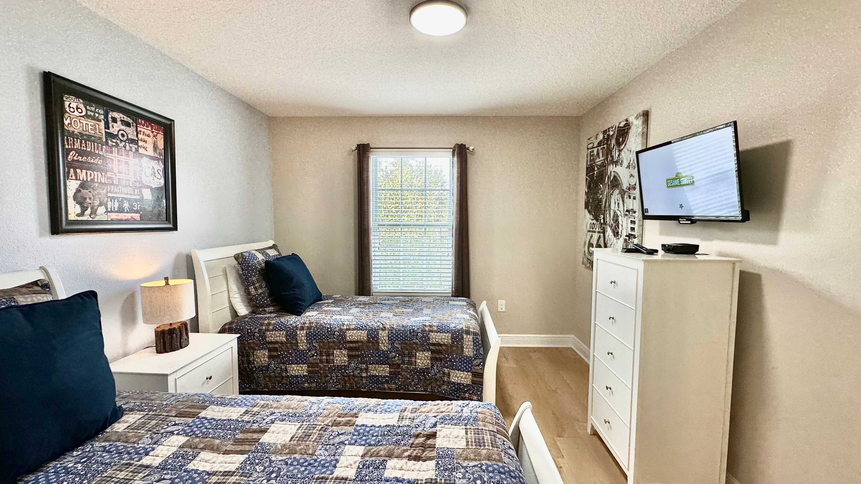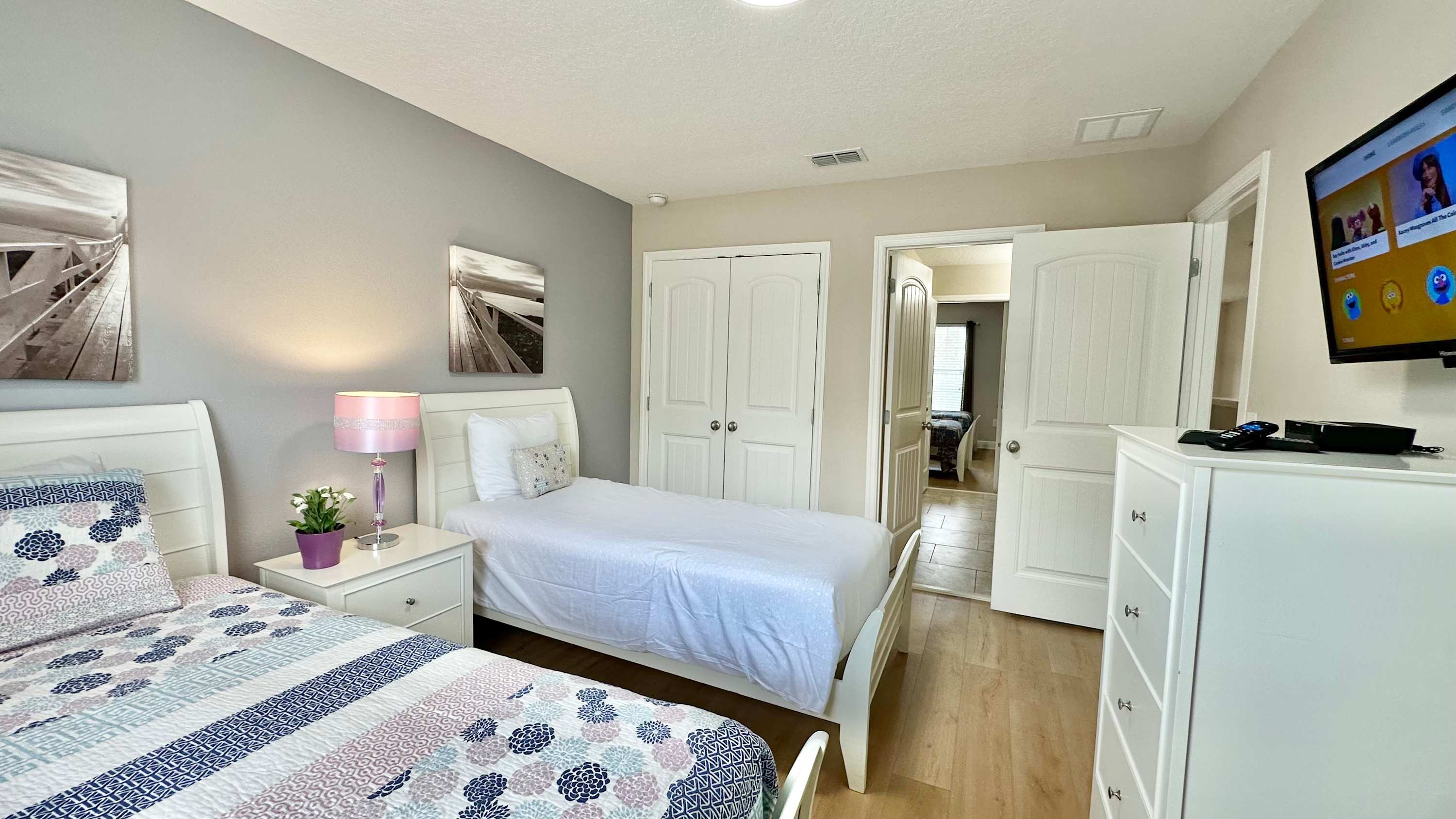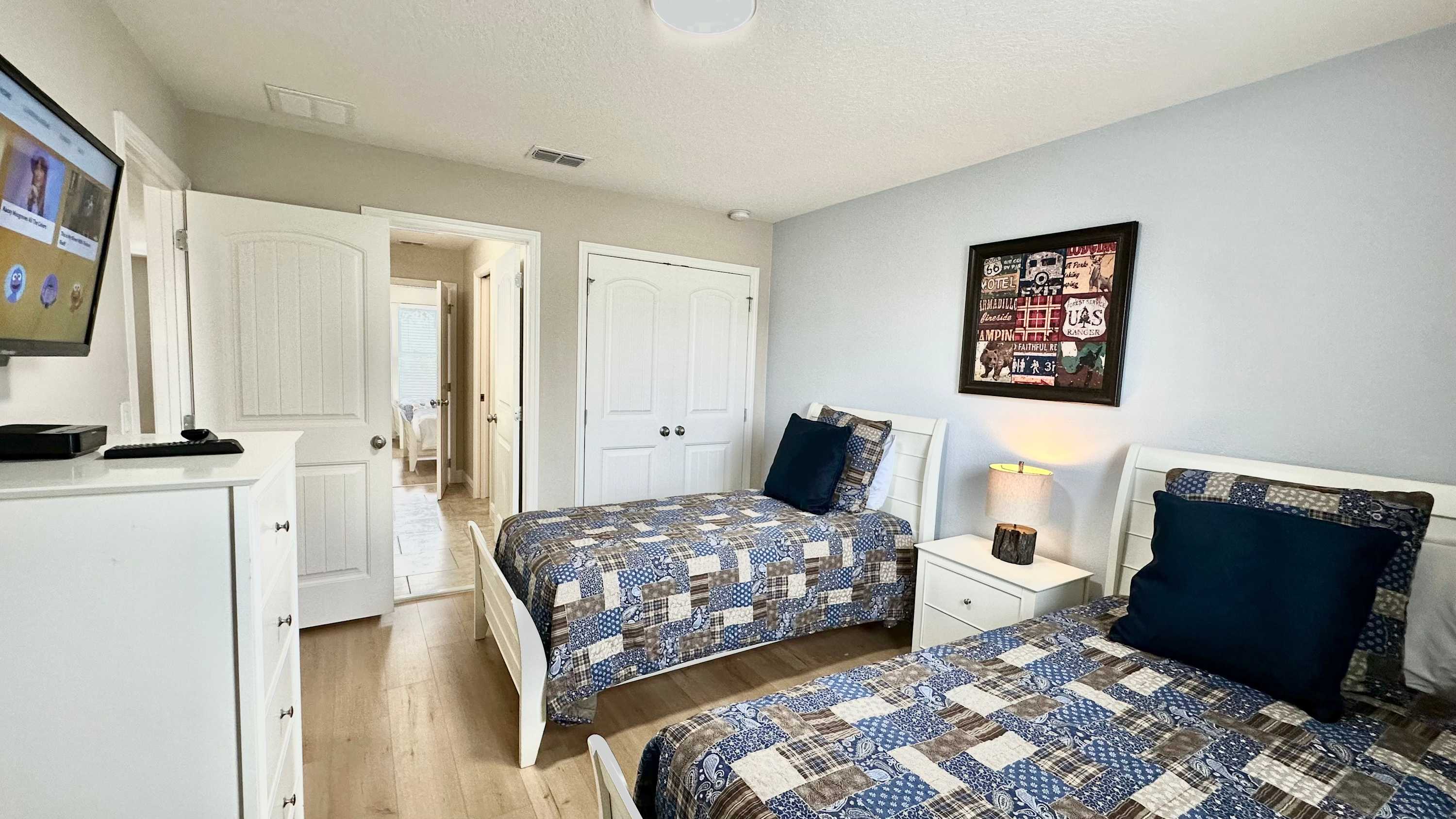 Bedroom #3 includes 2 twin size beds, a smart TV, and a Jack-and-Jill bathroom shared with bedroom #2.