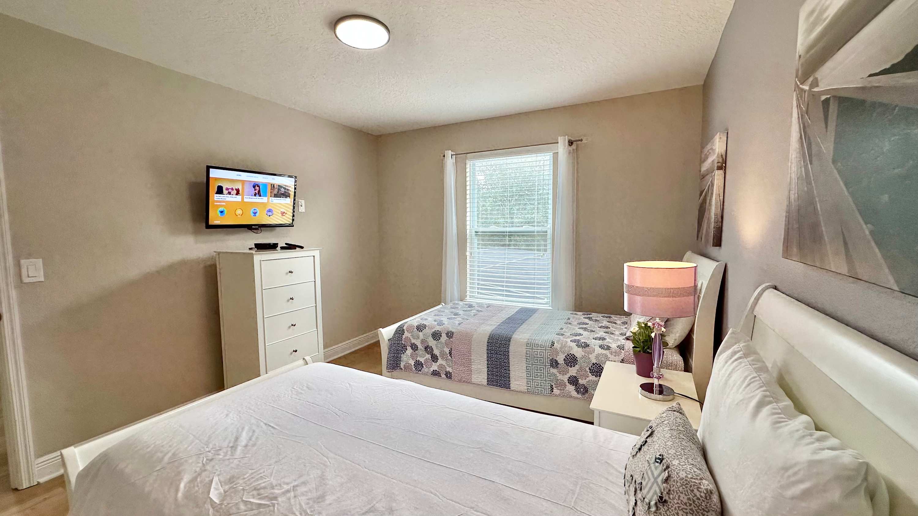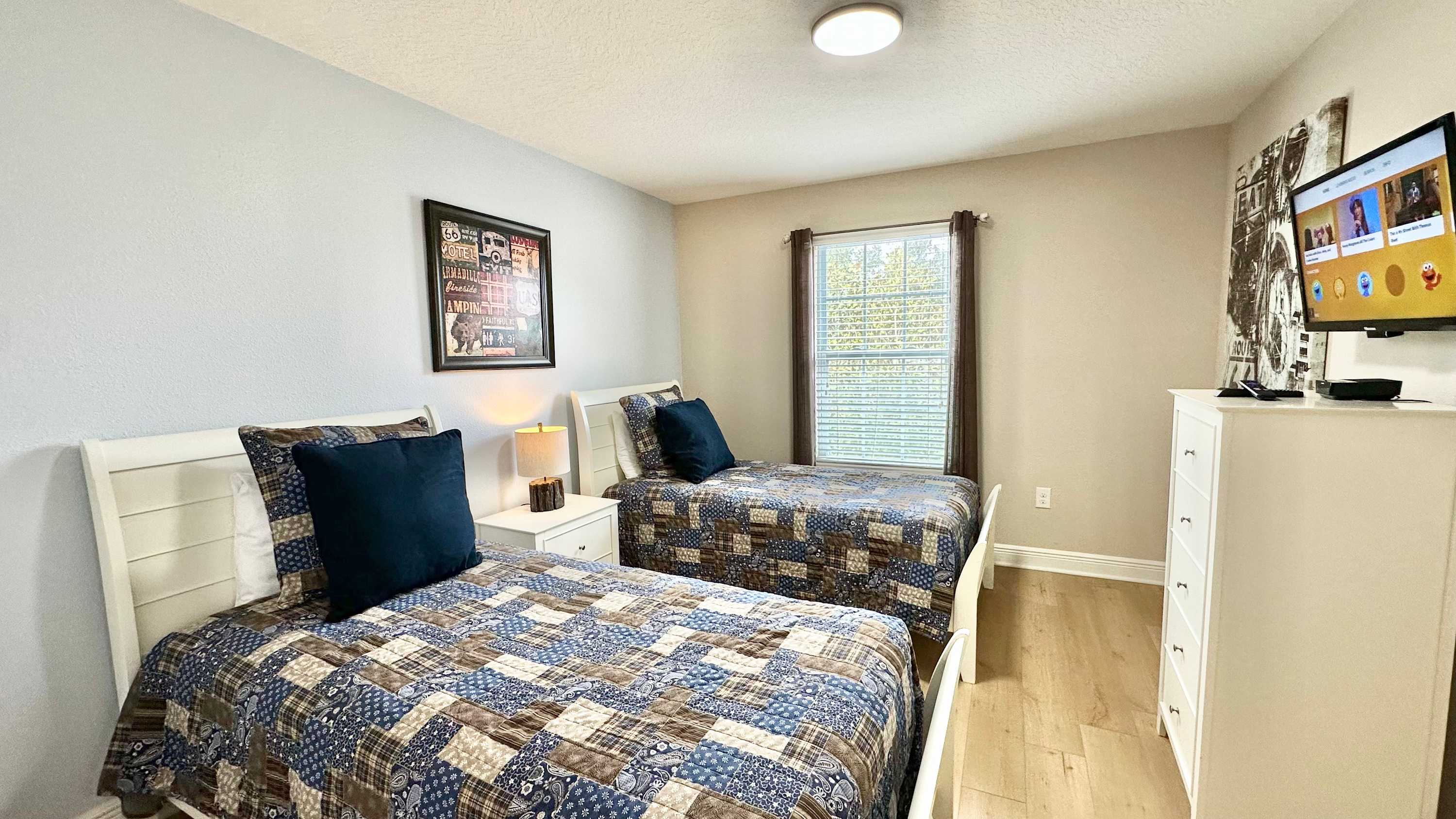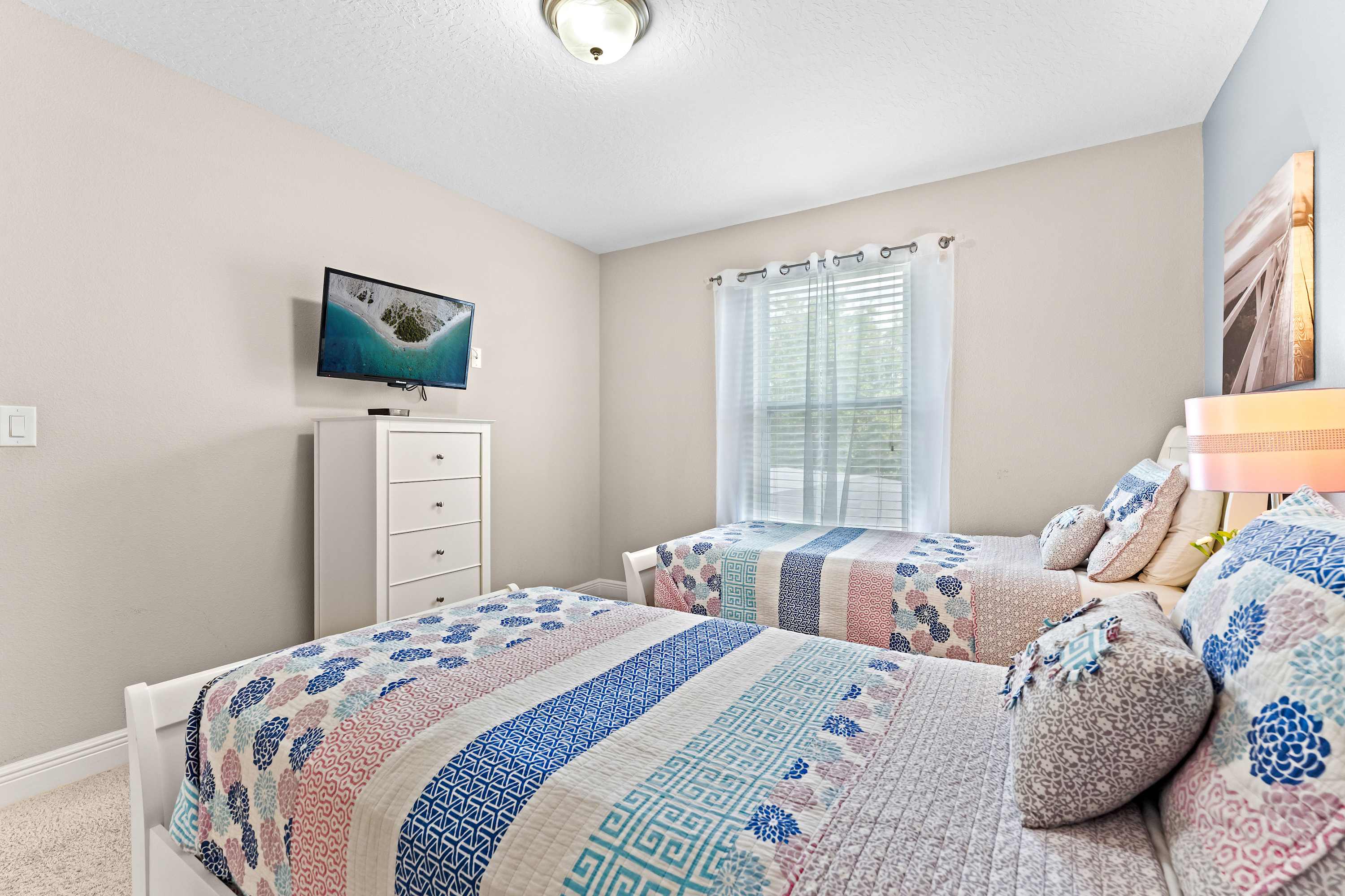 Bedroom #3 includes 2 twin size beds, a smart TV, and a Jack-and-Jill bathroom shared with bedroom #2.
