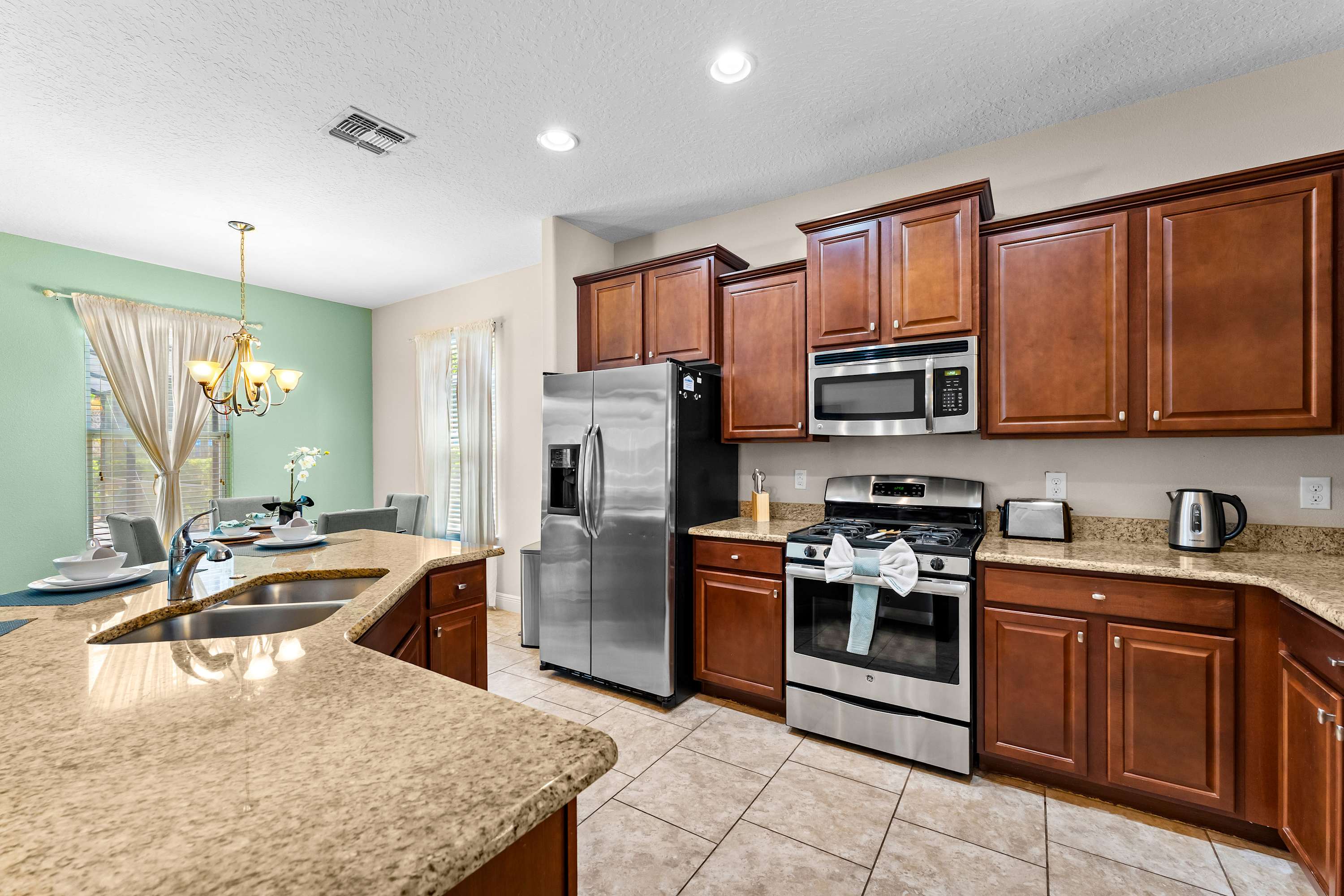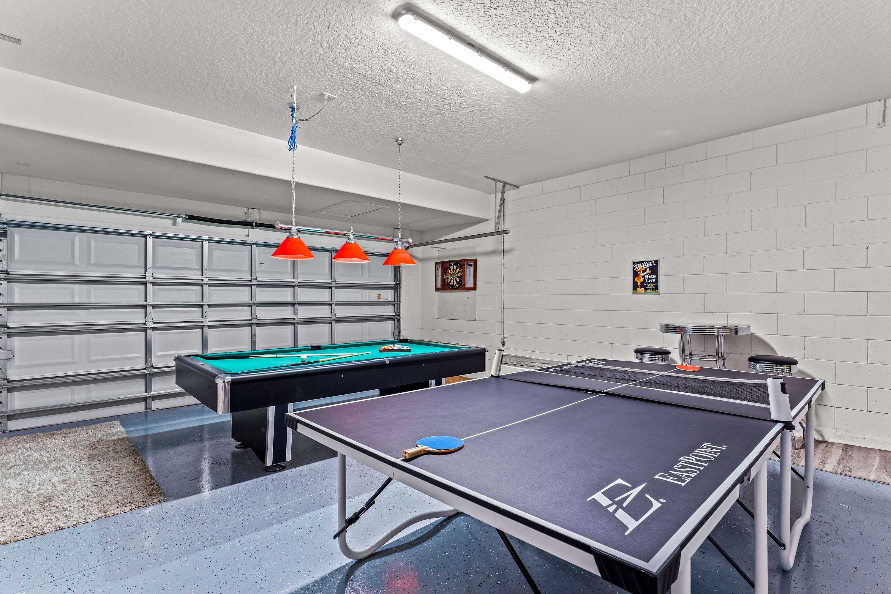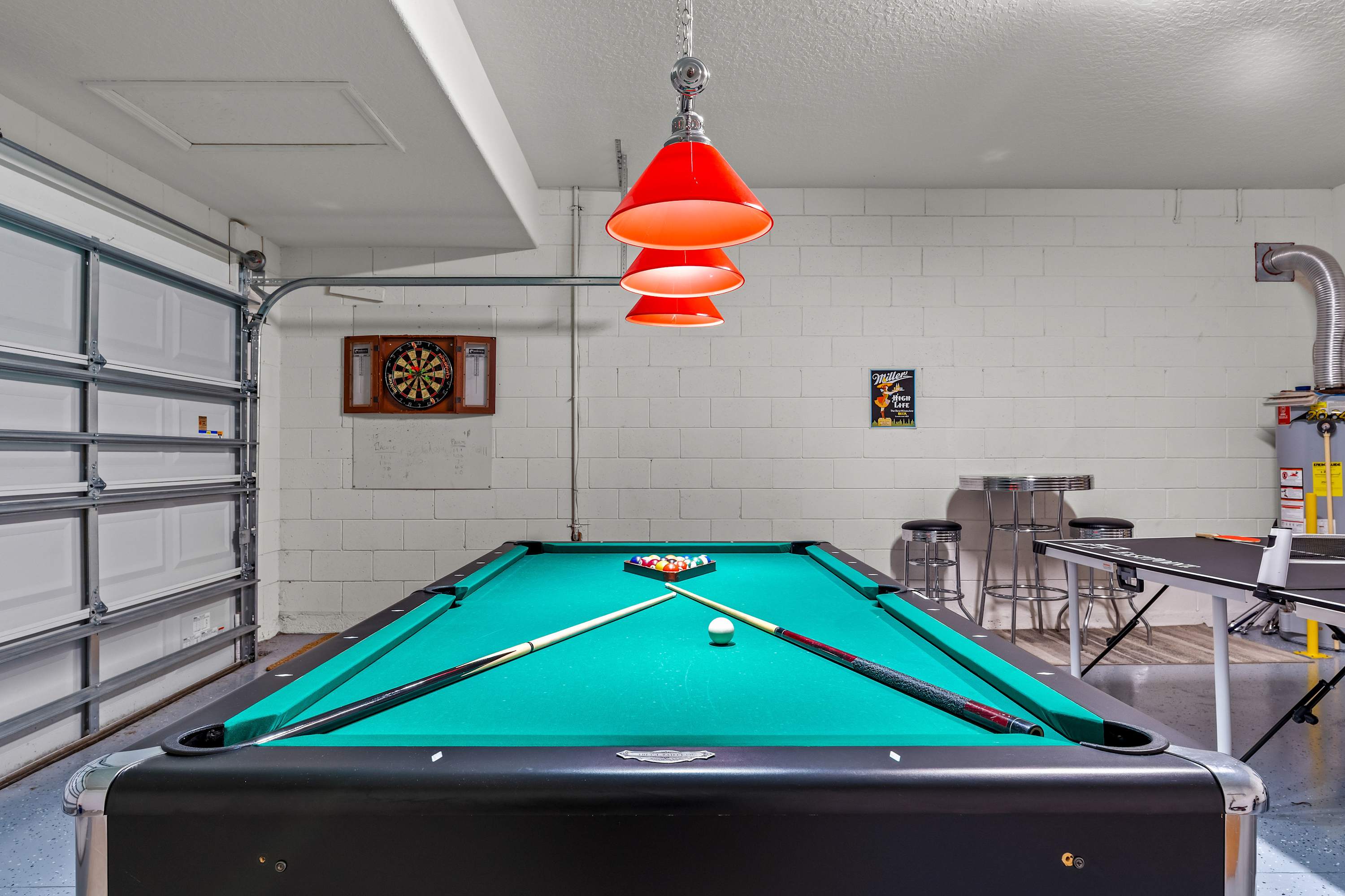 The kitchen is a chef's delight, featuring warm redwood cabinetry, rich granite countertops, and sleek stainless steel appliances. Whether you're cooking a feast or prepping a quick snack, the kitchen nook—with seating for four—is the perfect spot to gather and chat. After dinner, head to the garage-turned-game-room for a round of pool or ping pong, test your aim at the dartboard, or enjoy drinks at the high-top table for two. Upstairs, the spacious loft provides another retreat with a plush sectional and a smart TV, offering a second hangout zone for kids or adults alike.