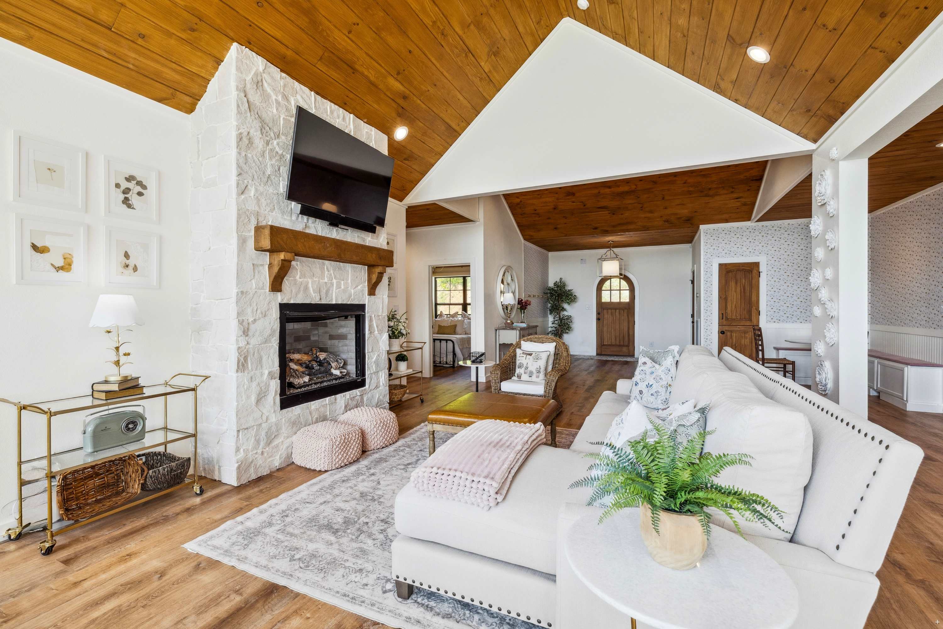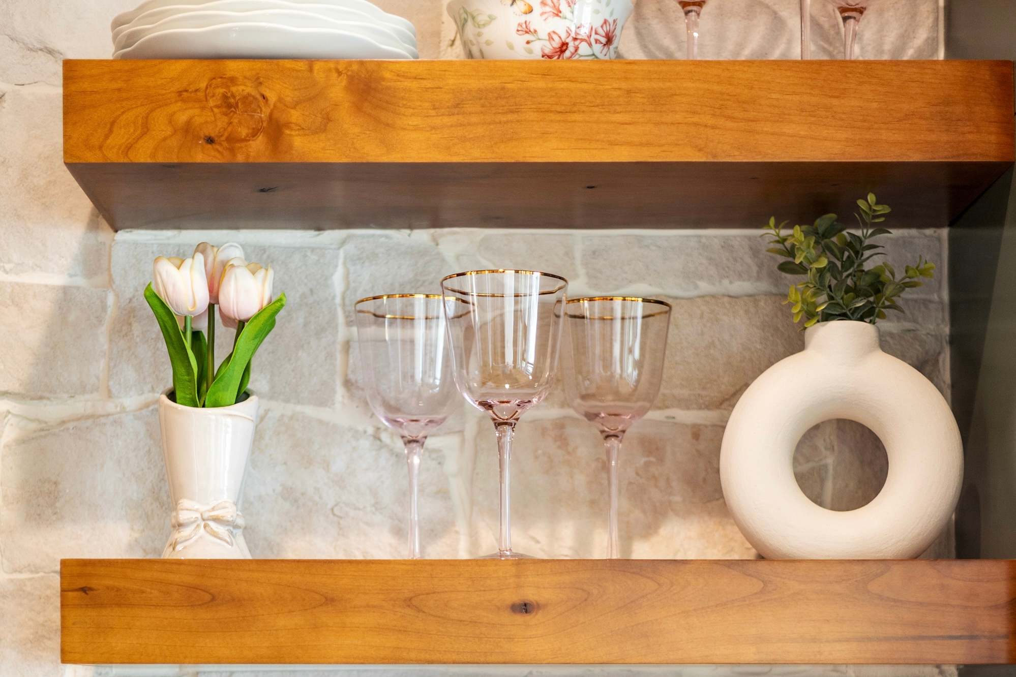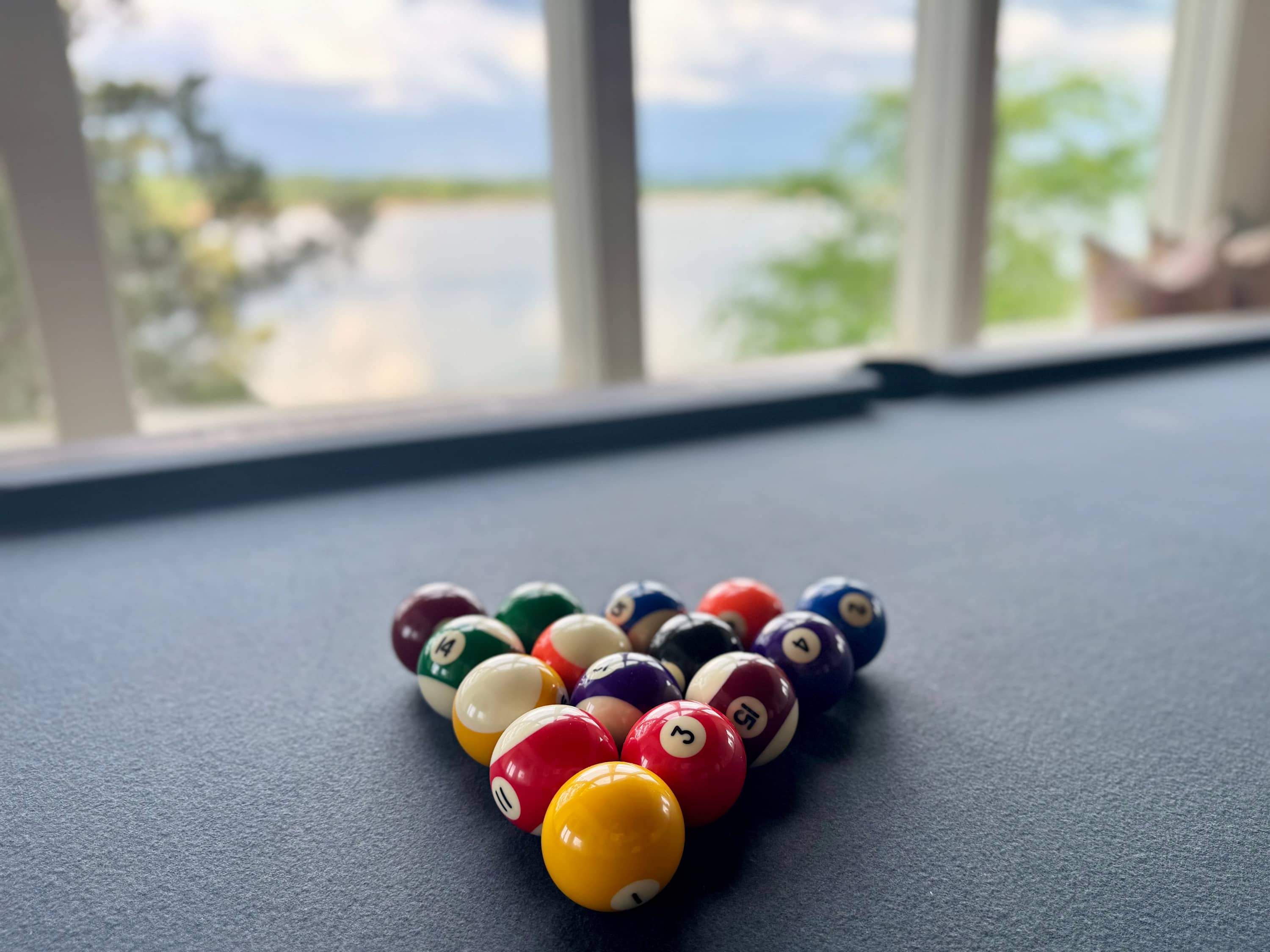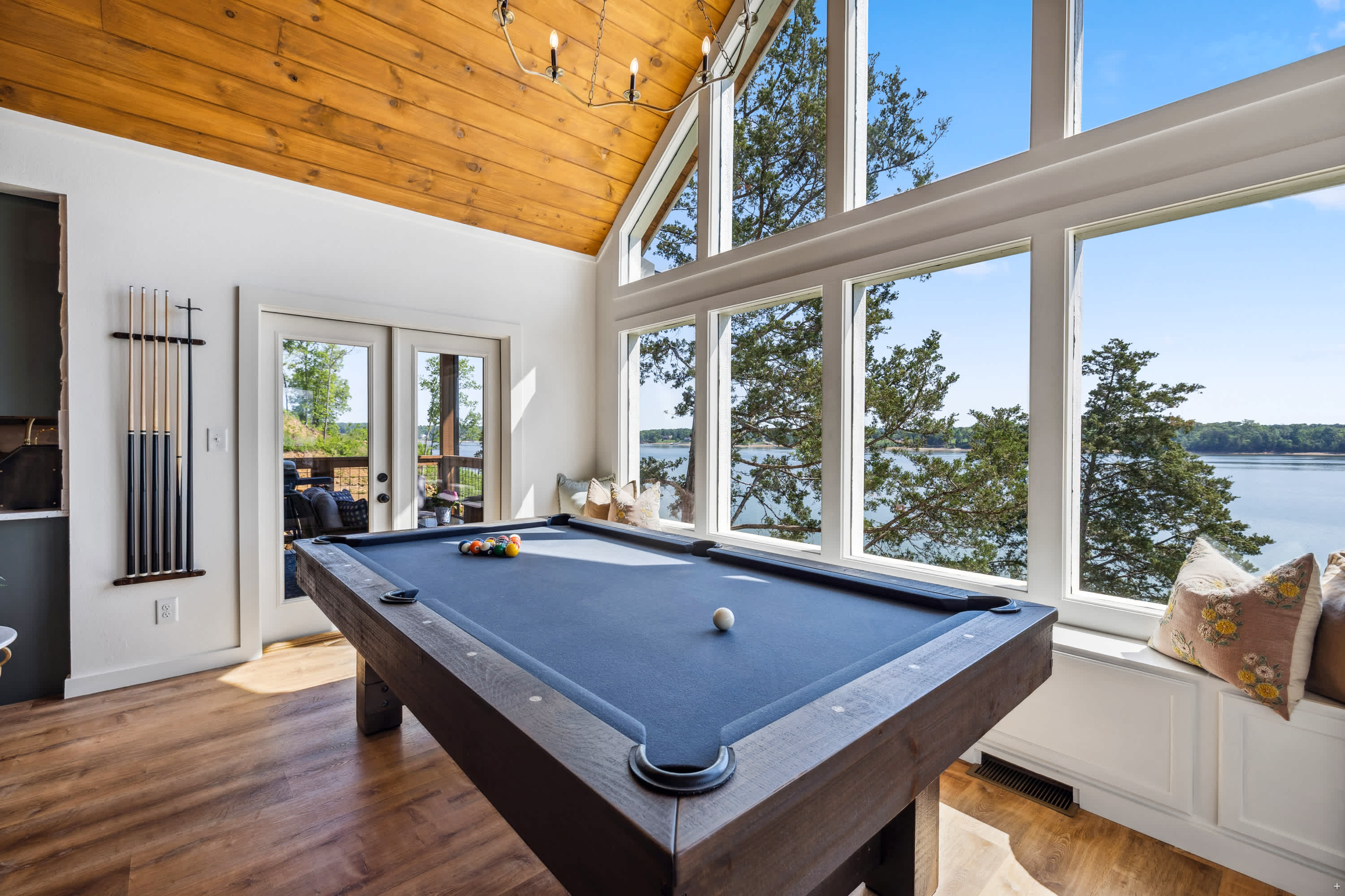 Step inside Someday Cottage and let your cares drift away. The heart of the home is a gourmet kitchen, where stone countertops, eclectic custom cabinetry, and a charming coffee station create a stylish and functional space. The kitchen opens effortlessly to the rest of the living area and features passthrough windows to the balcony, perfect for serving cocktails or snacks with a view. A dining table for six sits nearby—ideal for lakeside breakfasts or candlelit dinners after a day on the water. The open-concept design flows into a stunning main living space with soaring ceilings, plush sectional seating, and a gas fireplace that sets the mood year-round. A Smart TV and a pool table tucked beside window seating offer entertainment with a view—because nearly every room is framed by floor-to-ceiling windows that showcase the sparkling lake and rolling Smoky Mountains beyond.
