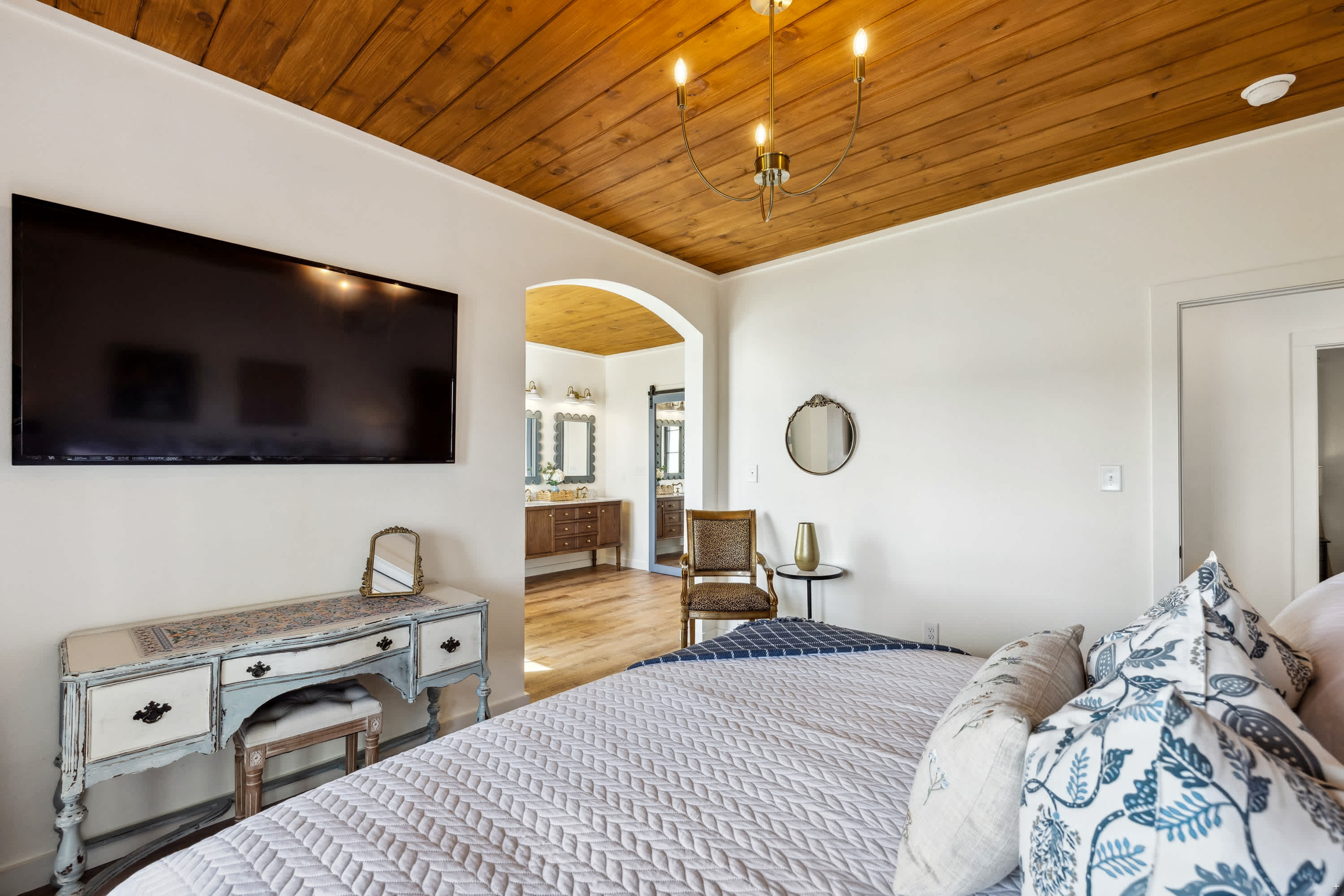 Bedroom #2 includes a queen size bed, a smart TV, deck access, and an ensuite bathroom with a dual vanity and a shower/tub combo.