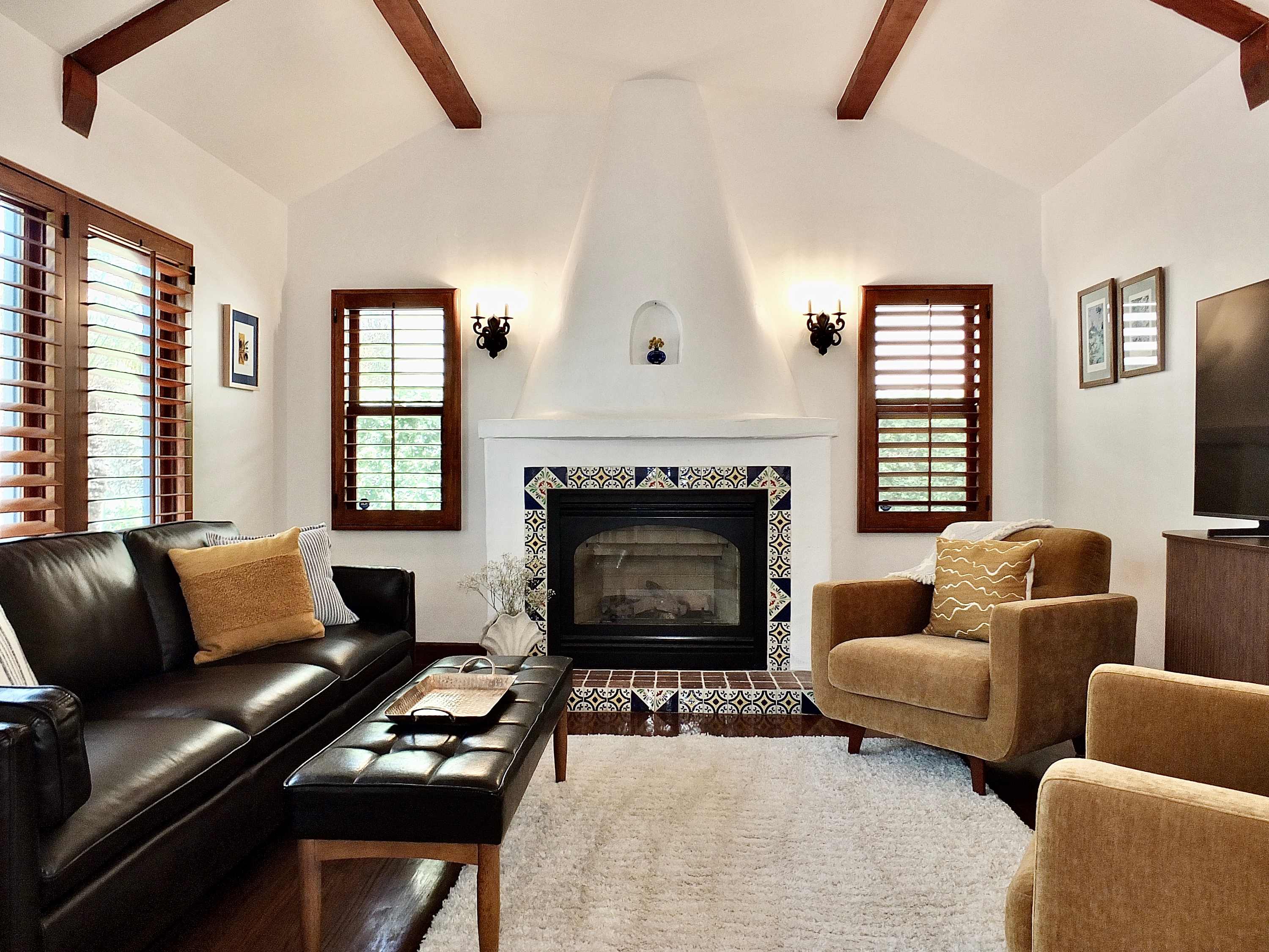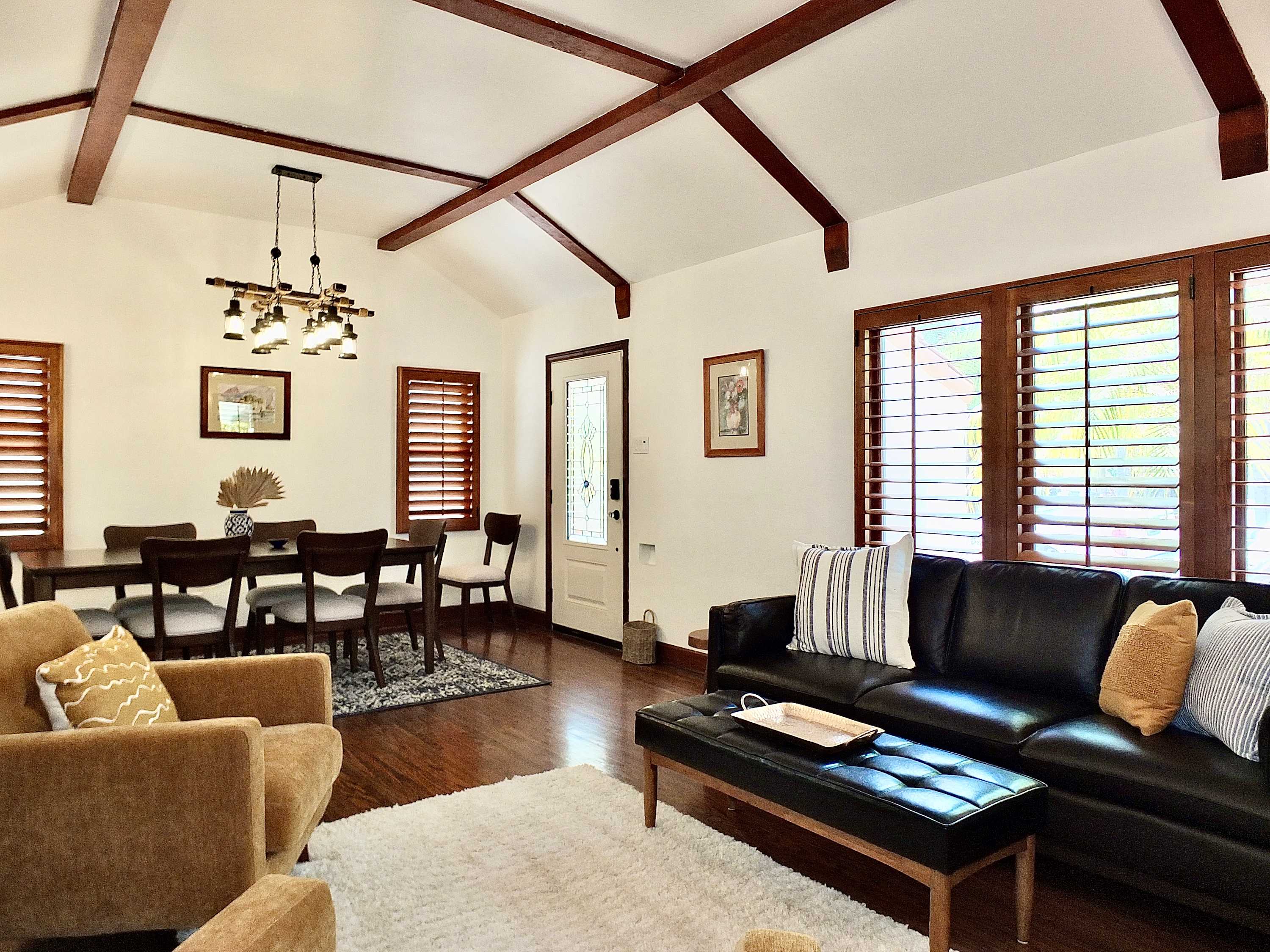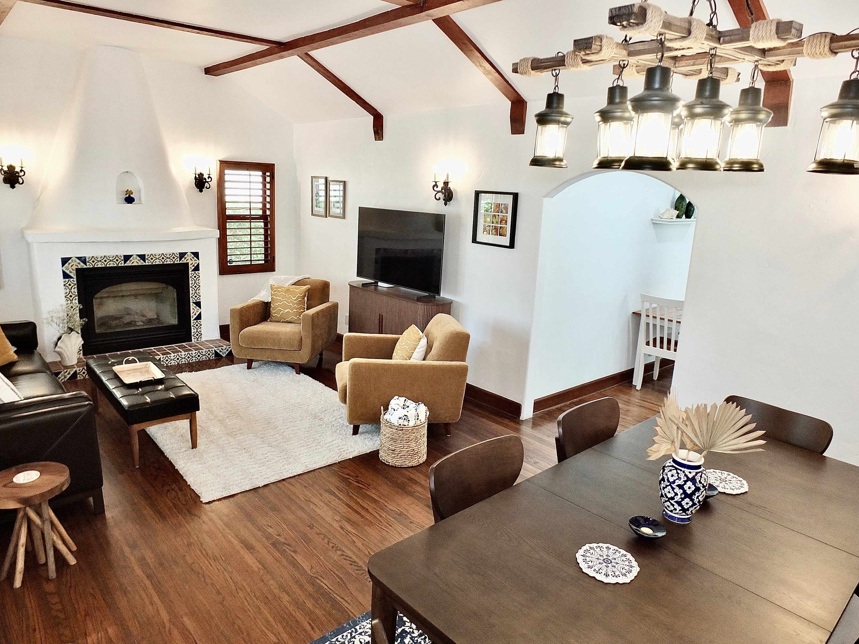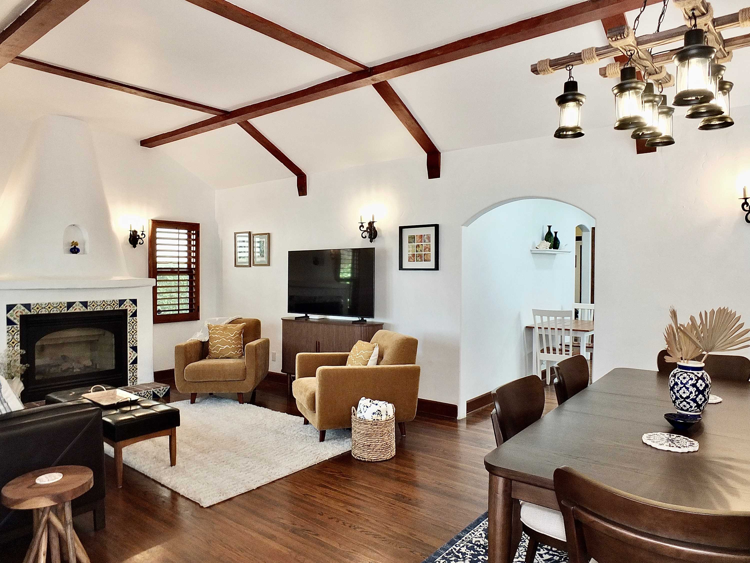 Begin your stay by stepping through the lush, tropical front patio—a private oasis that sets the tone for the relaxing days ahead. Inside, the home opens to a sun-drenched living and dining area with high ceilings, large windows, and a cozy fireplace. Settle into the plush couch or one of the comfy armchairs and enjoy your favorite shows on the smart TV. Just off the living area, the dining table seats six, perfect for enjoying a meal together after a day in the sun. The spacious white kitchen features stainless steel appliances, a breakfast table for two, and all the space you need to whip up anything from beachside snacks to a full dinner.