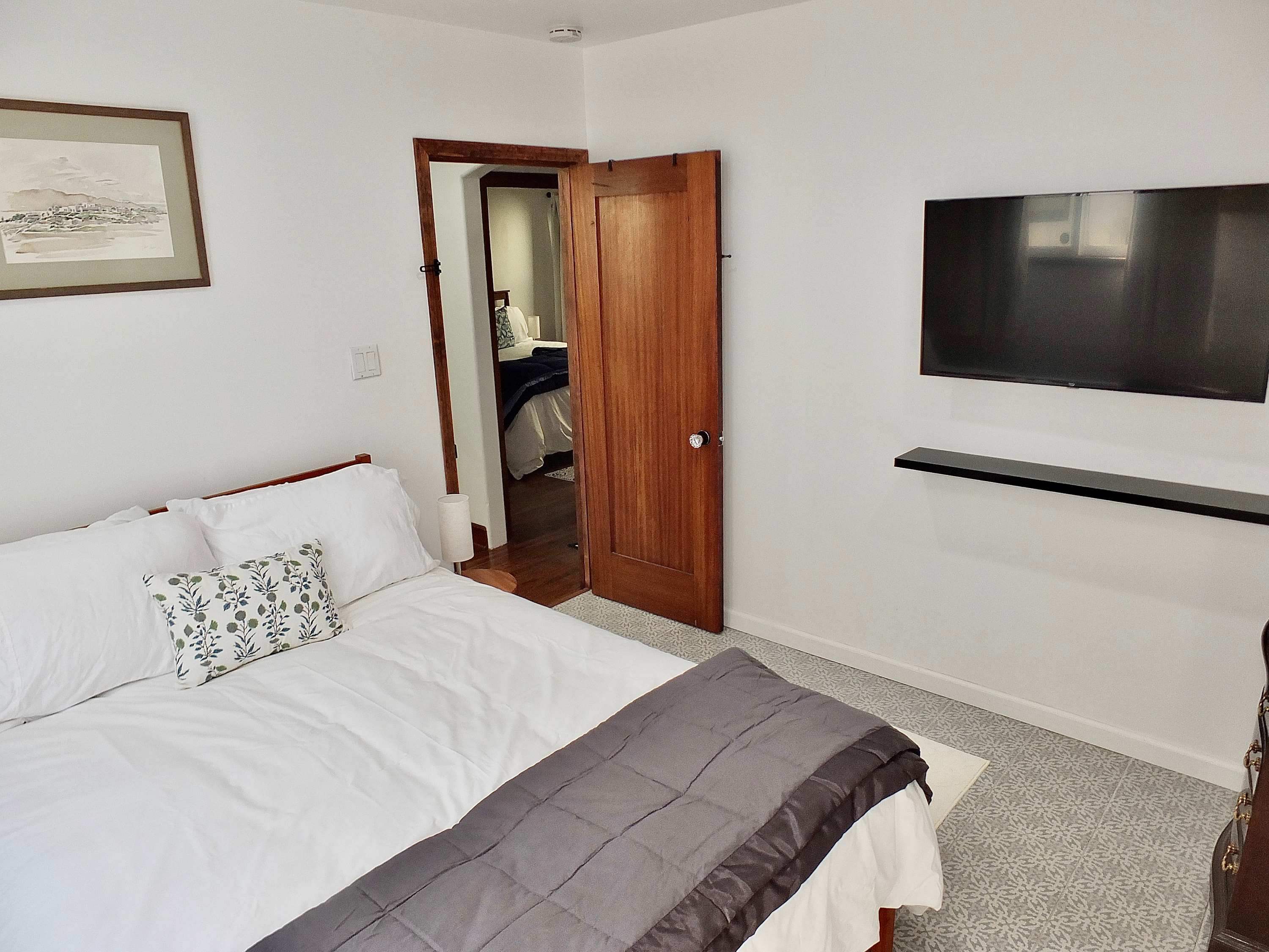 Bedroom #2 includes a queen size bed, a smart TV, patio access, and an ensuite half bathroom.