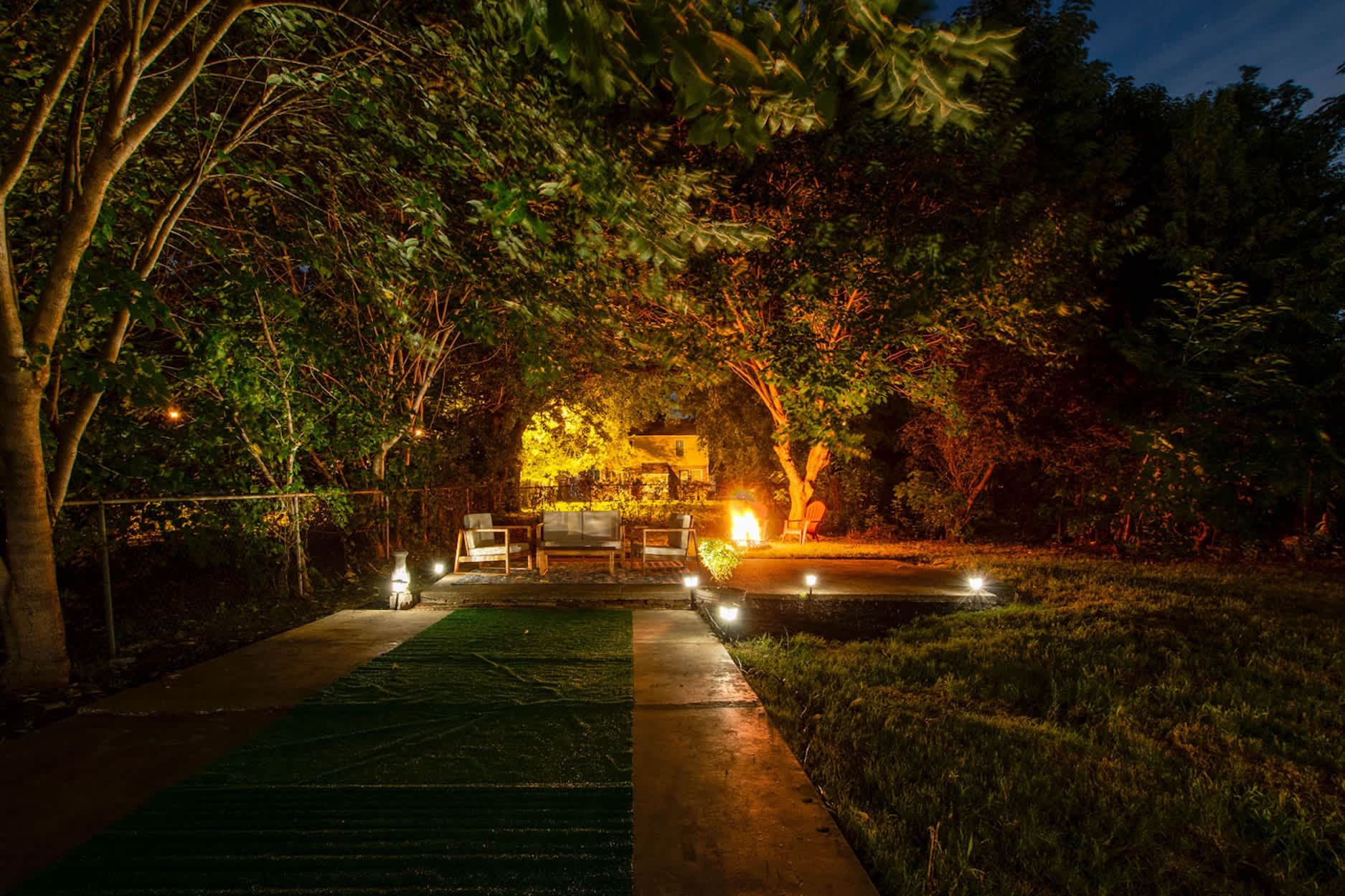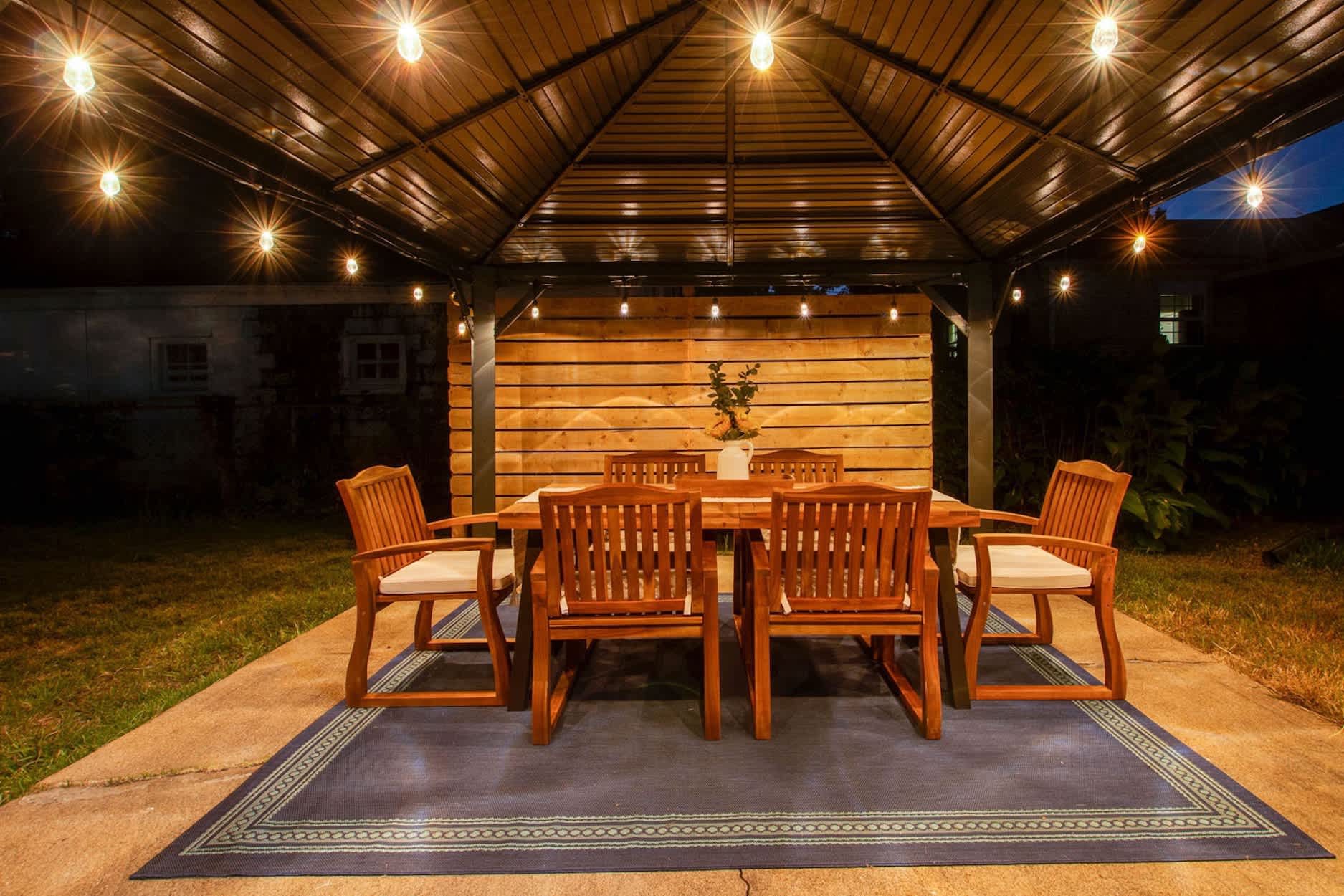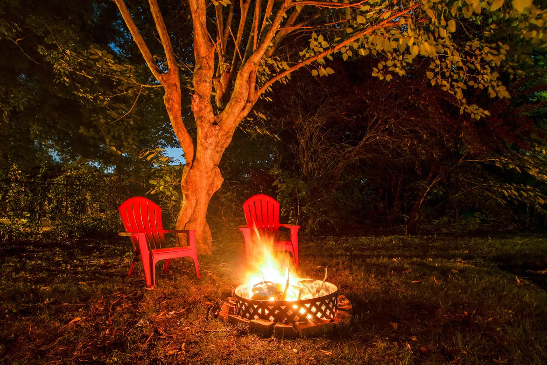 Outside, the experience continues. Fire up the grill and enjoy dinner under the covered patio with a table for six, then settle into the additional outdoor seating area or gather around the fire pit as the stars come out.