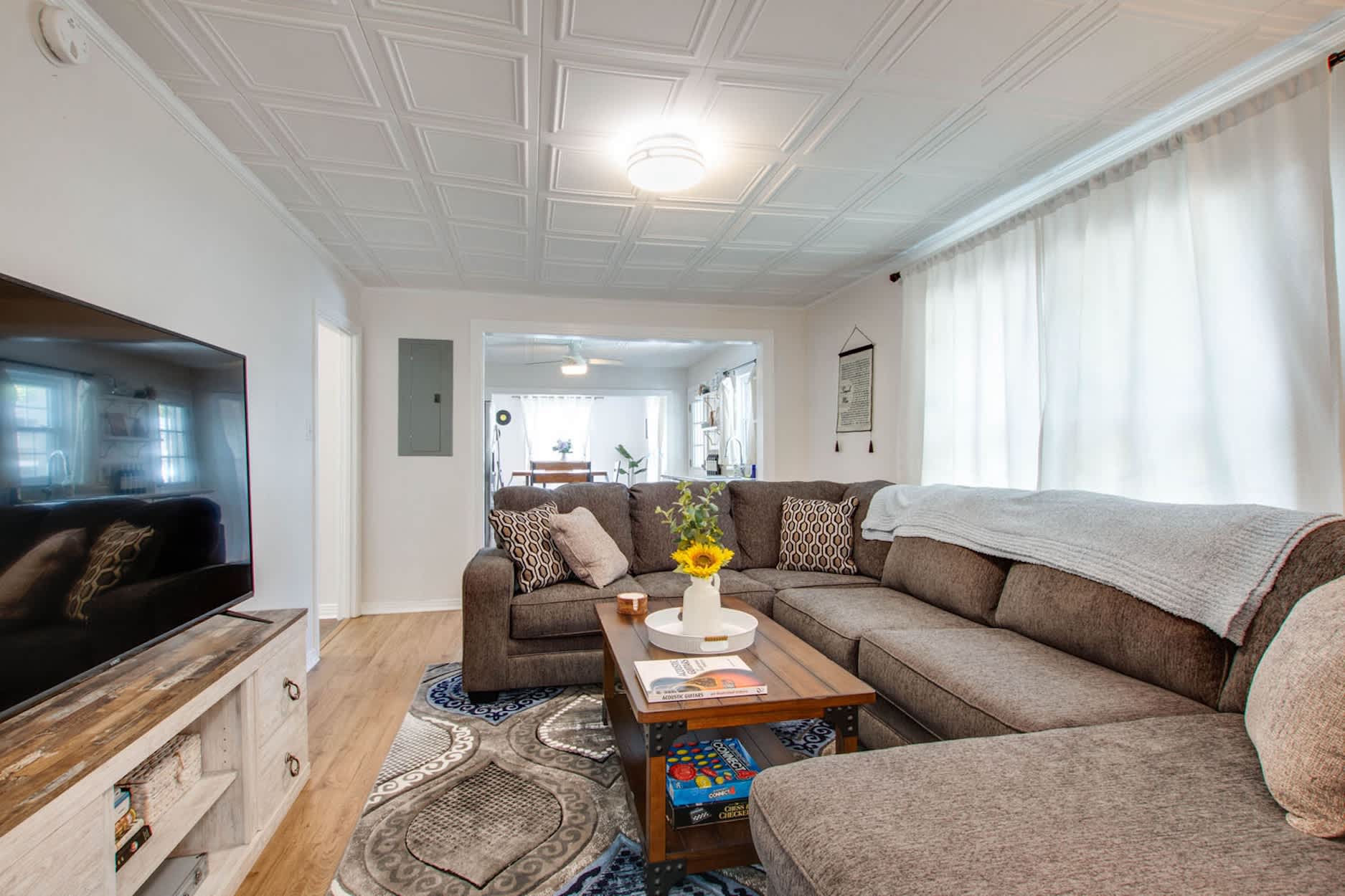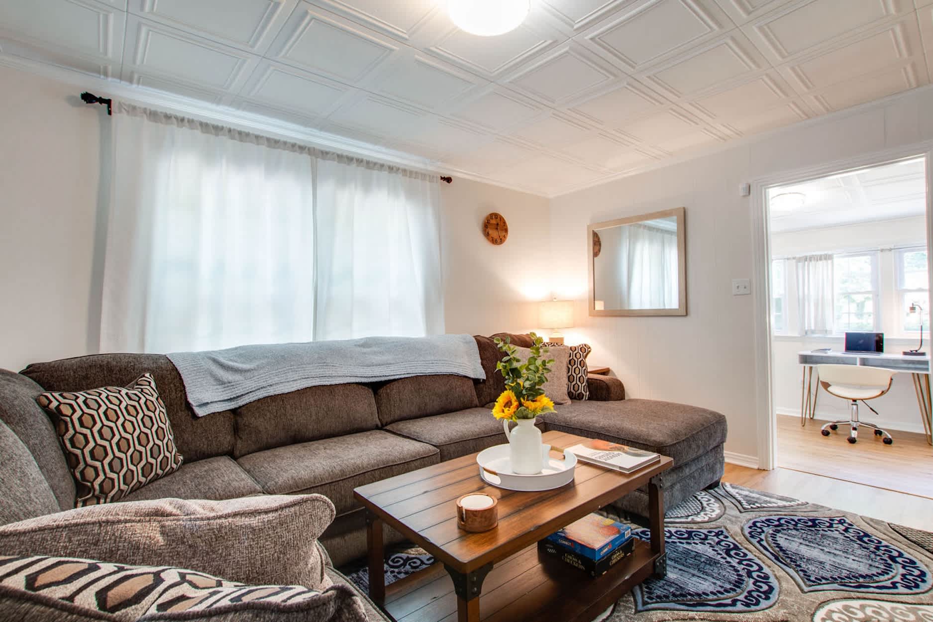 In the living room, a large, comfy sectional invites you to kick back and stream your favorite shows on the smart TV after a day in Music City. Need to squeeze in a little work? A semi-private workspace offers a quiet spot to focus without missing out on the comfort of home.