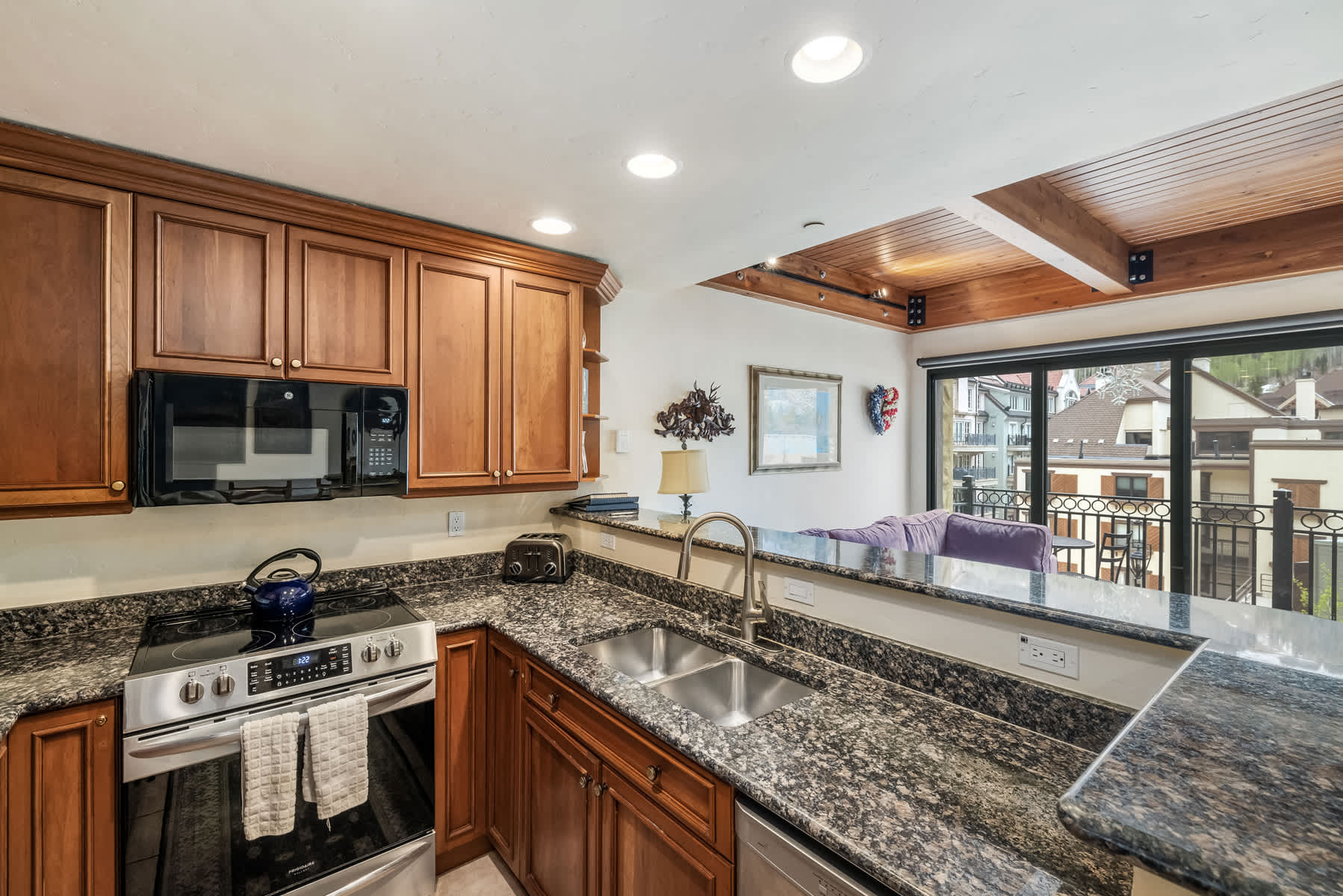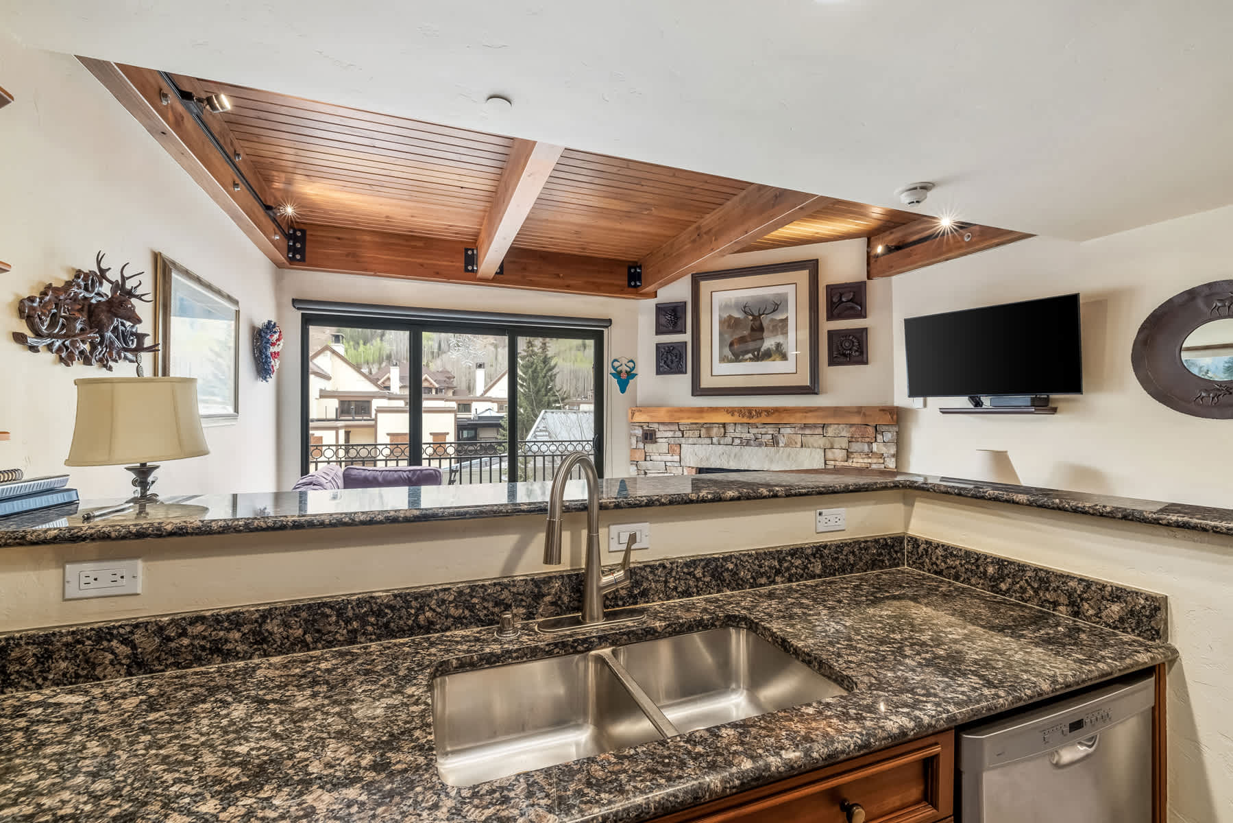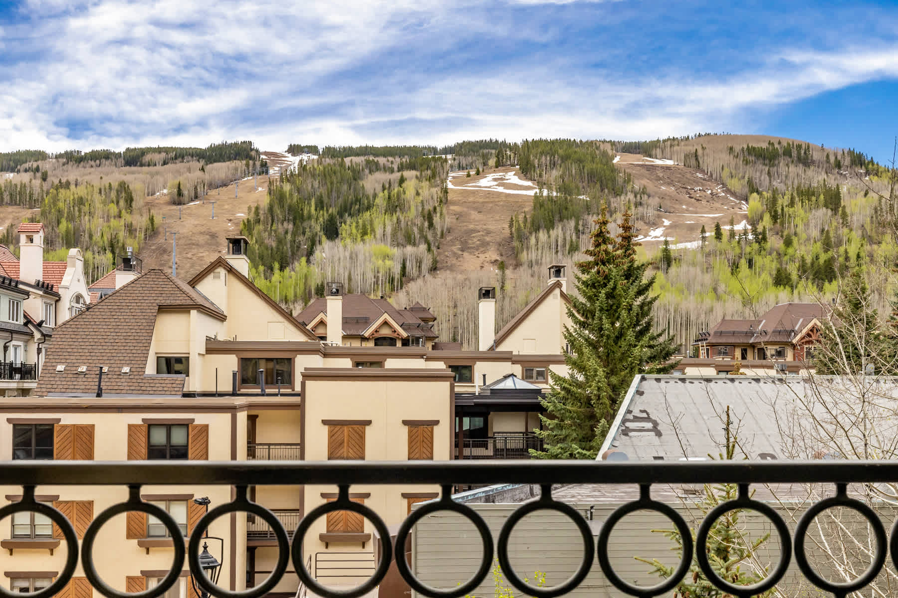 Step inside Landmark Vail and settle into a warm space designed for comfort and quick moutain access. The kitchen is equipped with stainless steel appliances and counter seating for three, and just beyond is a dining table for six. The living room is cozy, with a plush couch, smart TV, and a crackling fireplace setting the mood for après-ski relaxation. The balcony gives breathtaking views of the mountains and the resort below. A bistro table for two and a grill make this spot perfect for morning coffee or sunset dinners surrounded by alpine beauty.