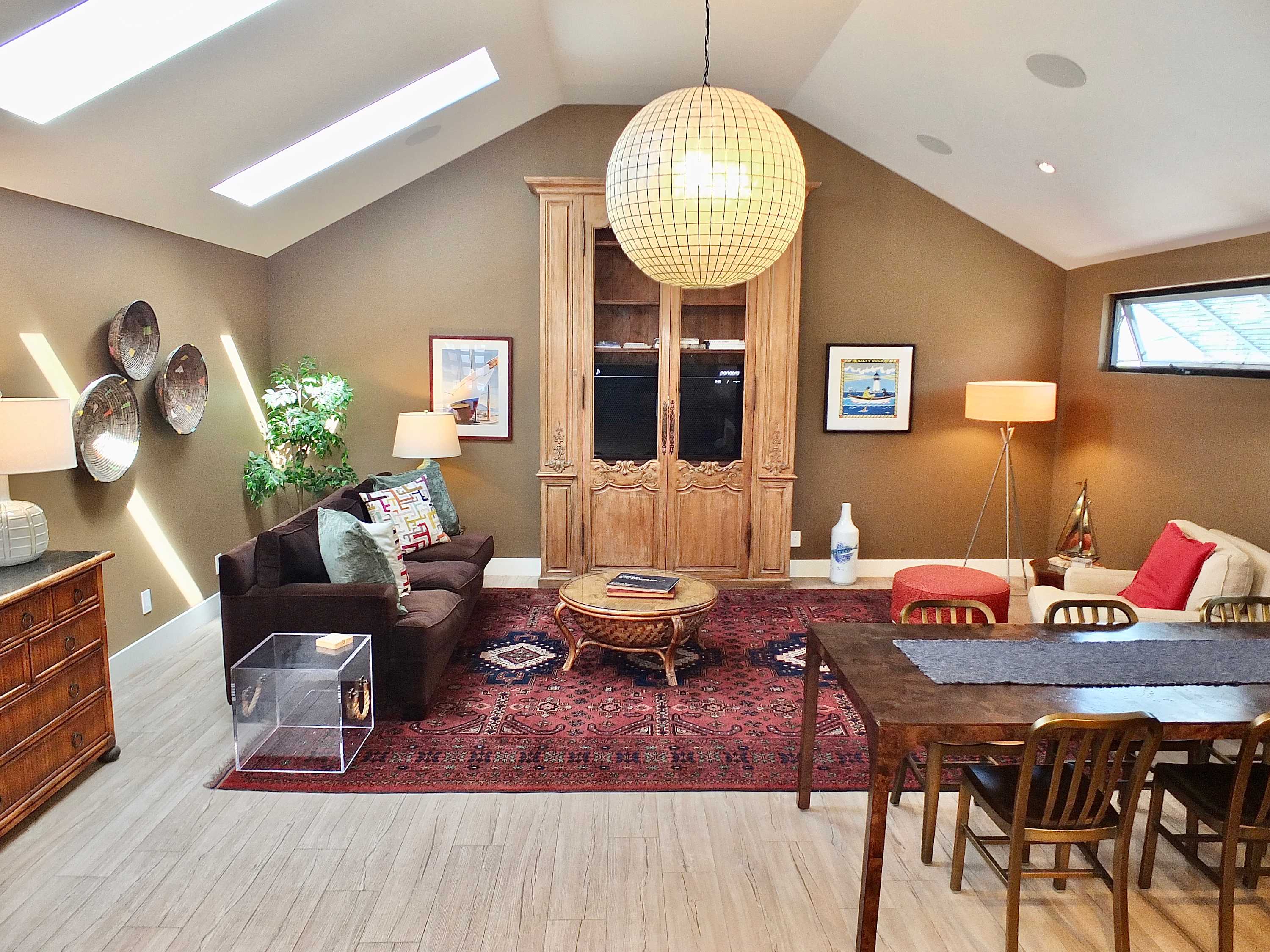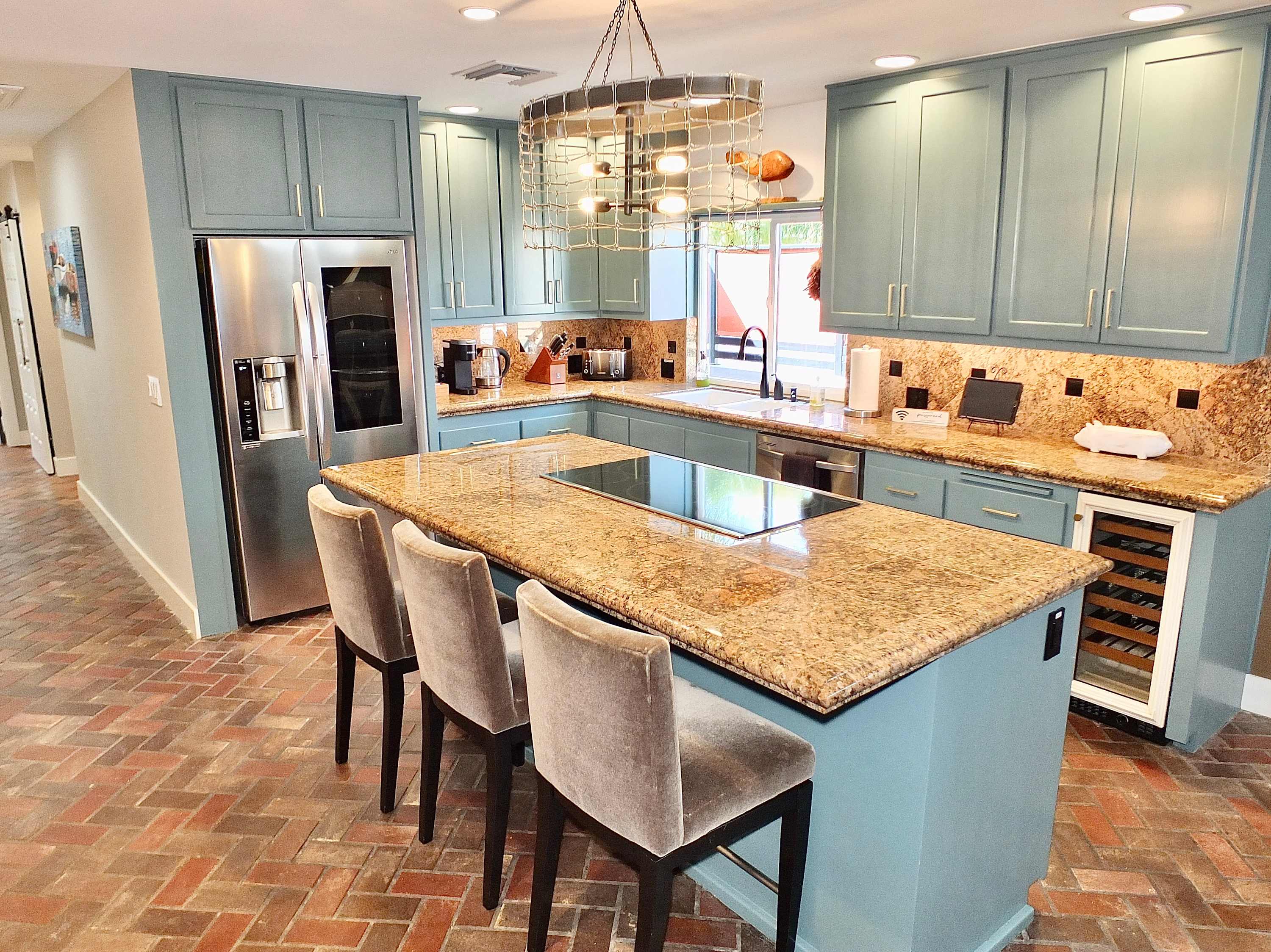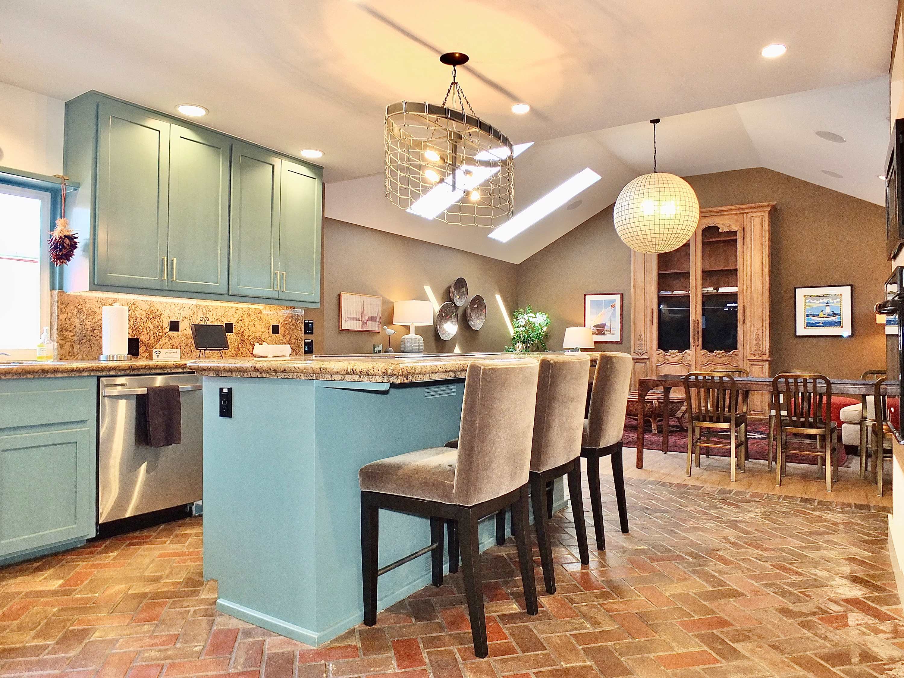 Step inside and feel instantly at home in the spacious living room, where high ceilings, a smart TV, comfortable couch, and armchair create a welcoming space to unwind. The heart of the home is the cheerful kitchen, complete with light blue cabinetry, granite countertops, stainless steel appliances, a Keurig, and counter seating for three—perfect for casual breakfasts or happy hour snacks. The adjacent dining table for six invites you to gather for meals or board games, while a dedicated workspace/desk makes it easy to check in with work if needed.