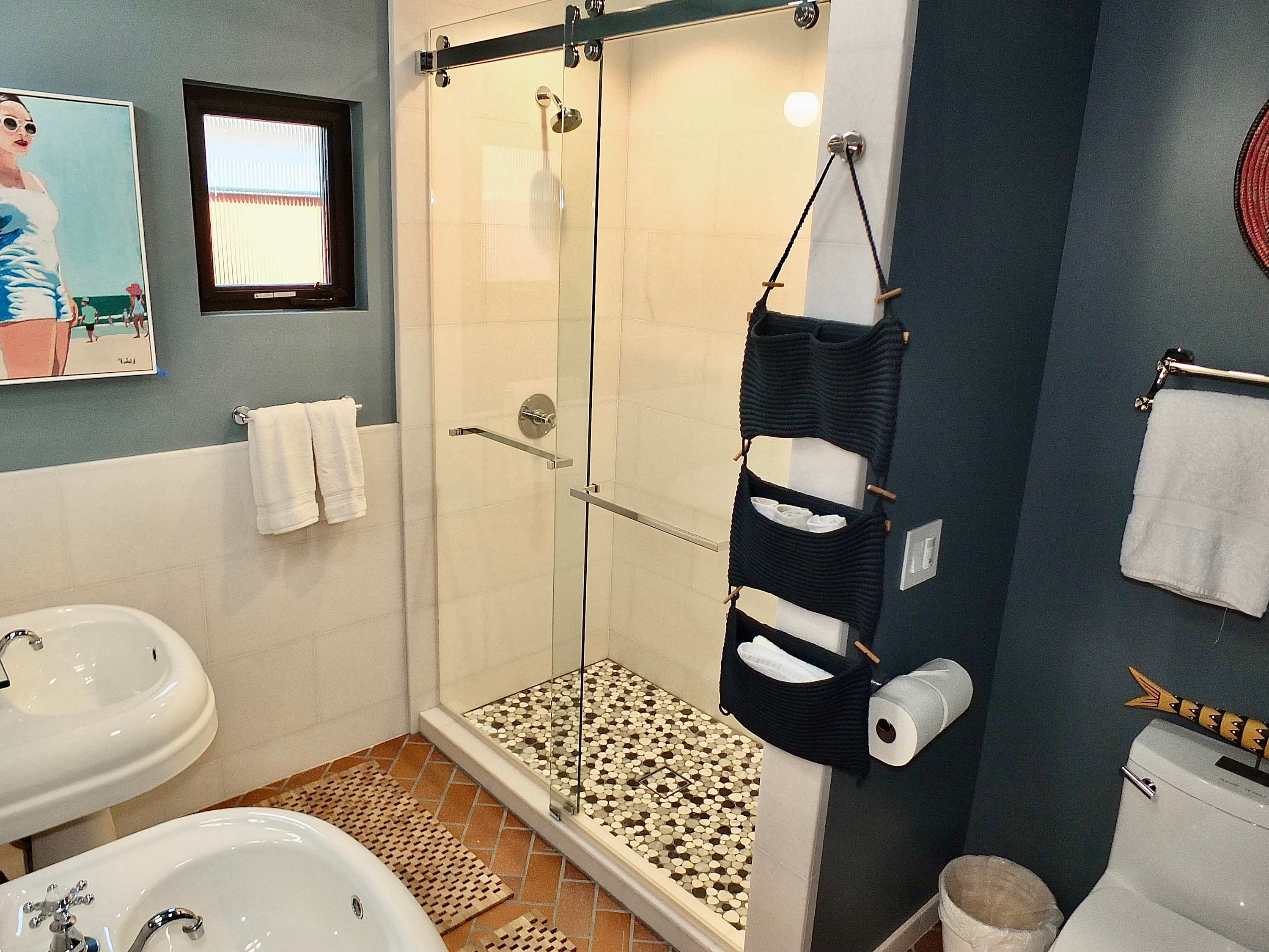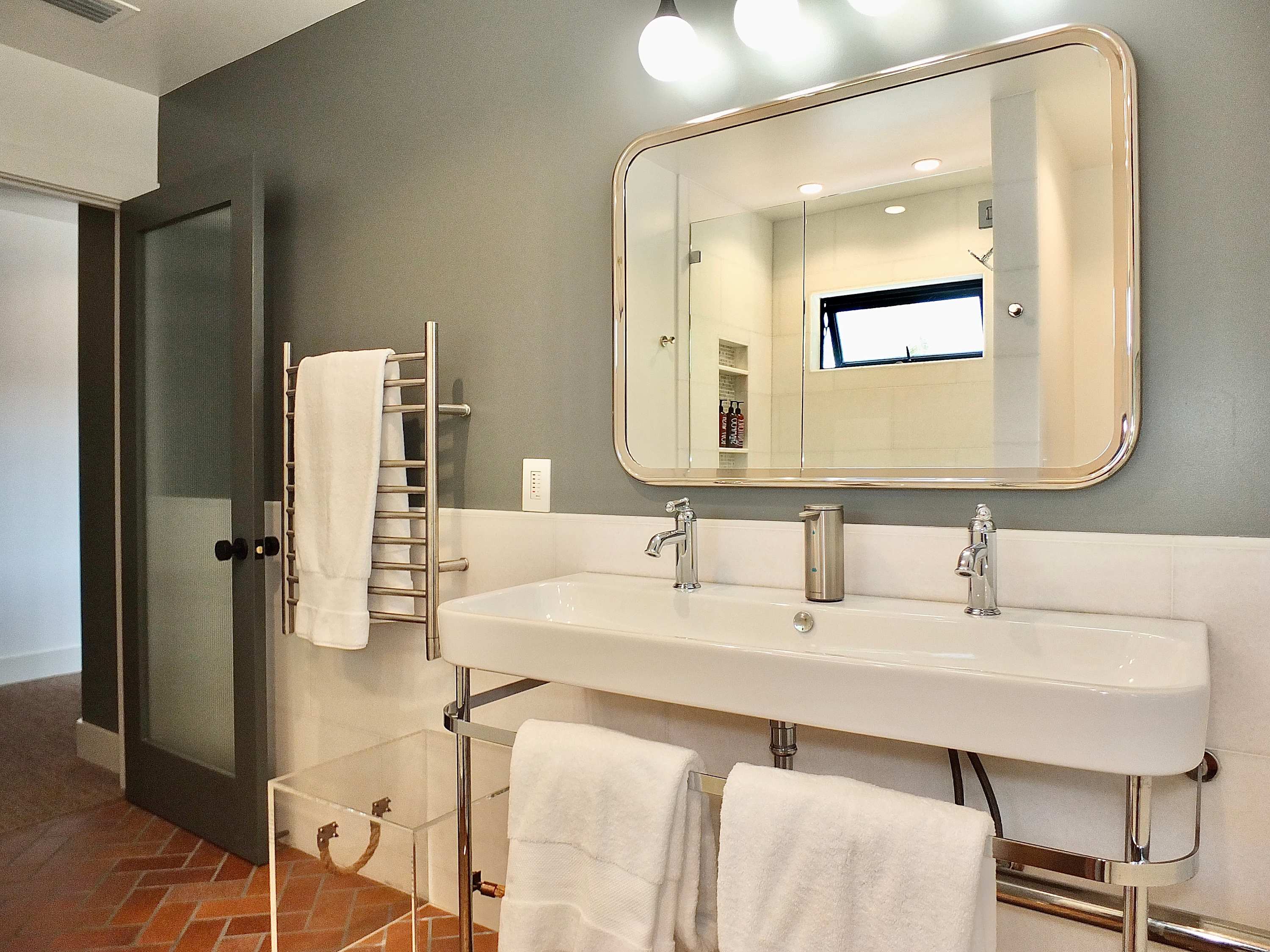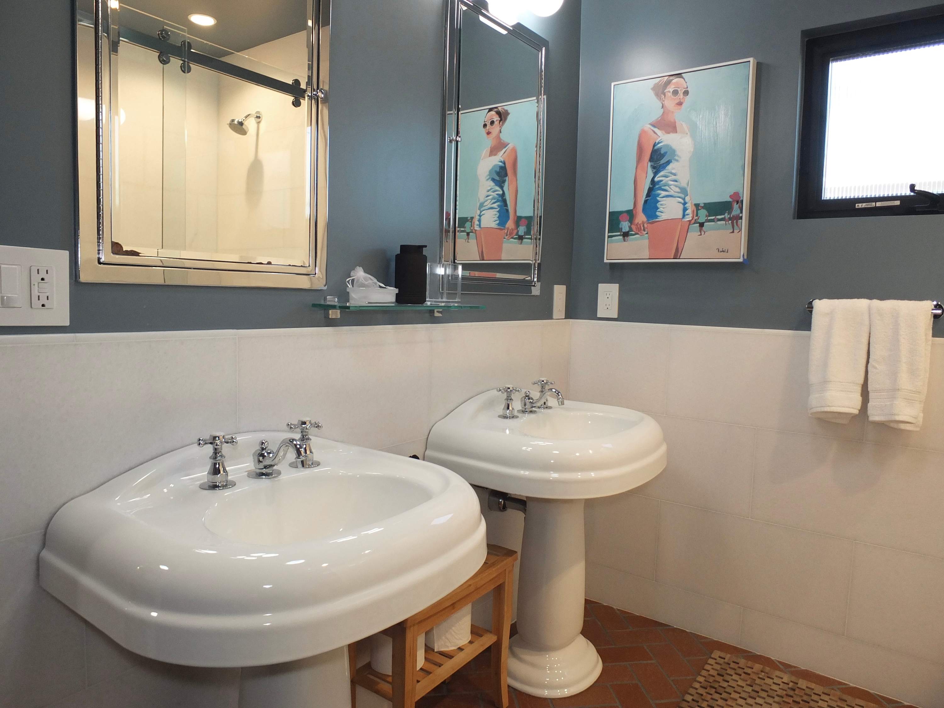 This home also includes a full bathroom with dual pedestal sinks and a walk-in shower.