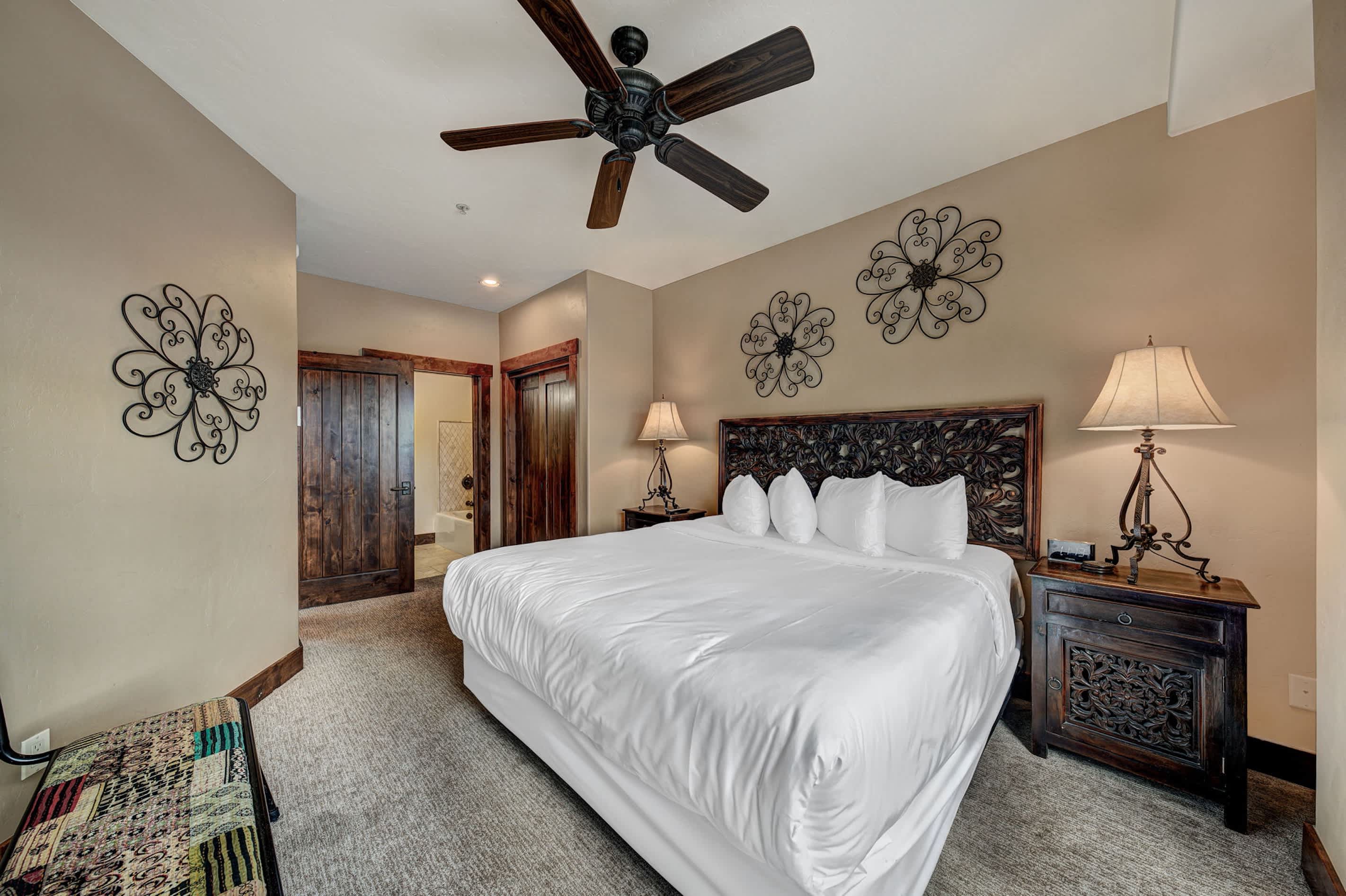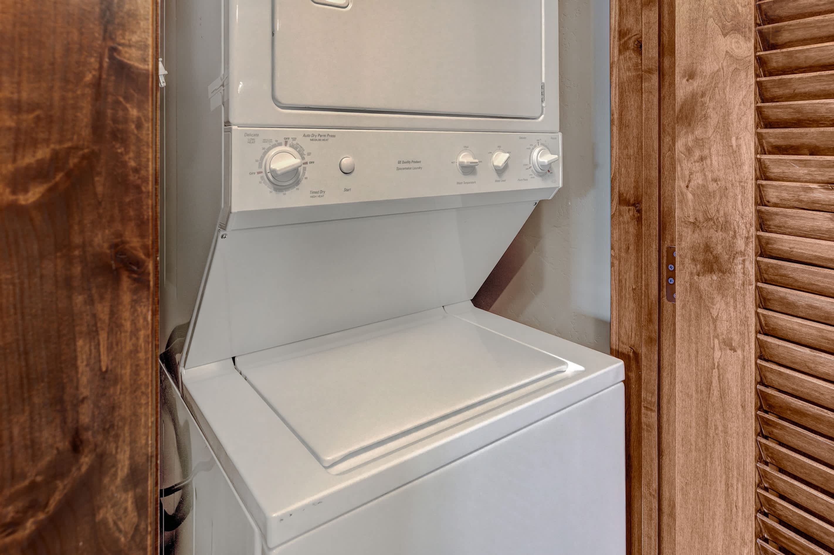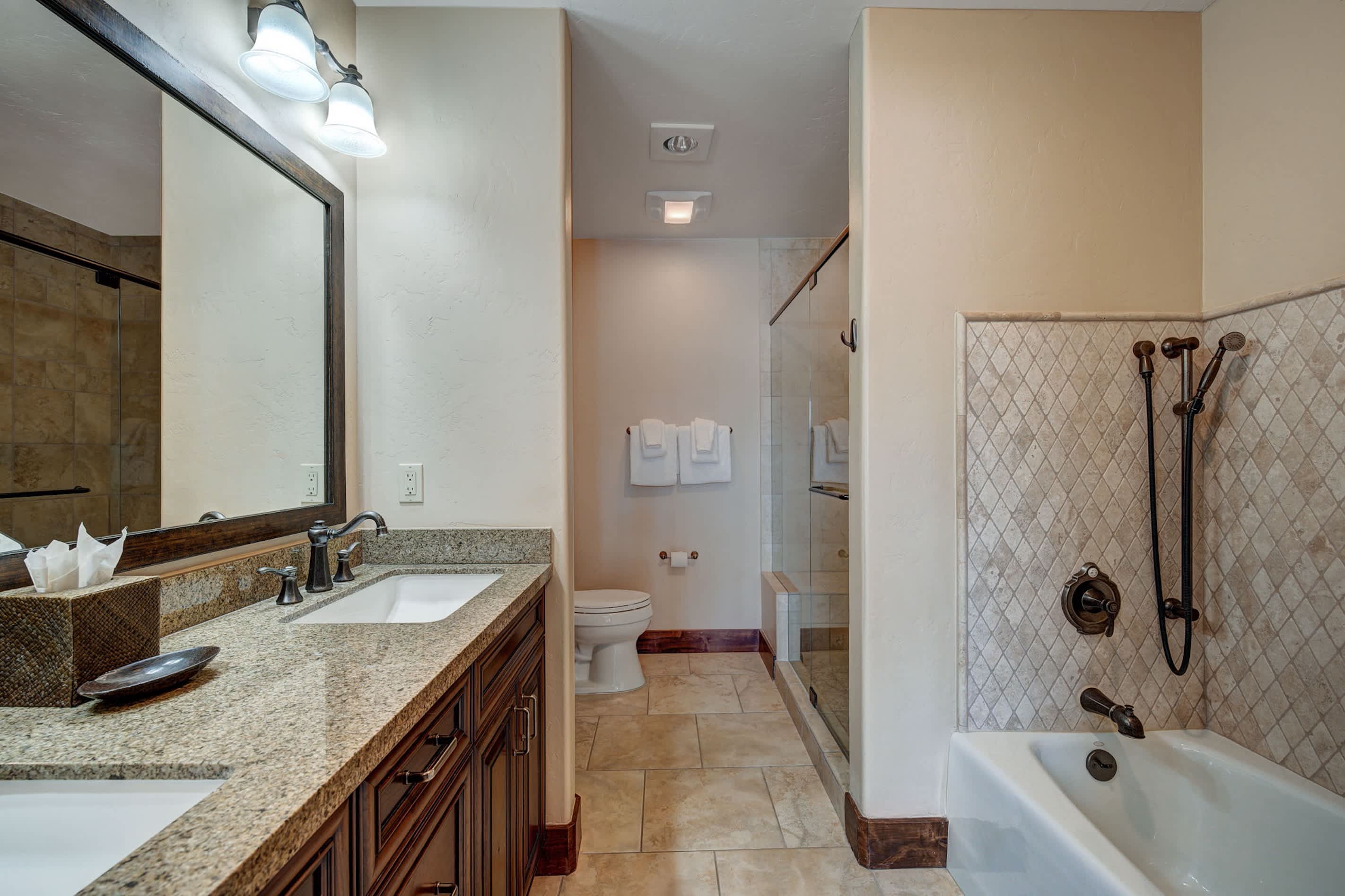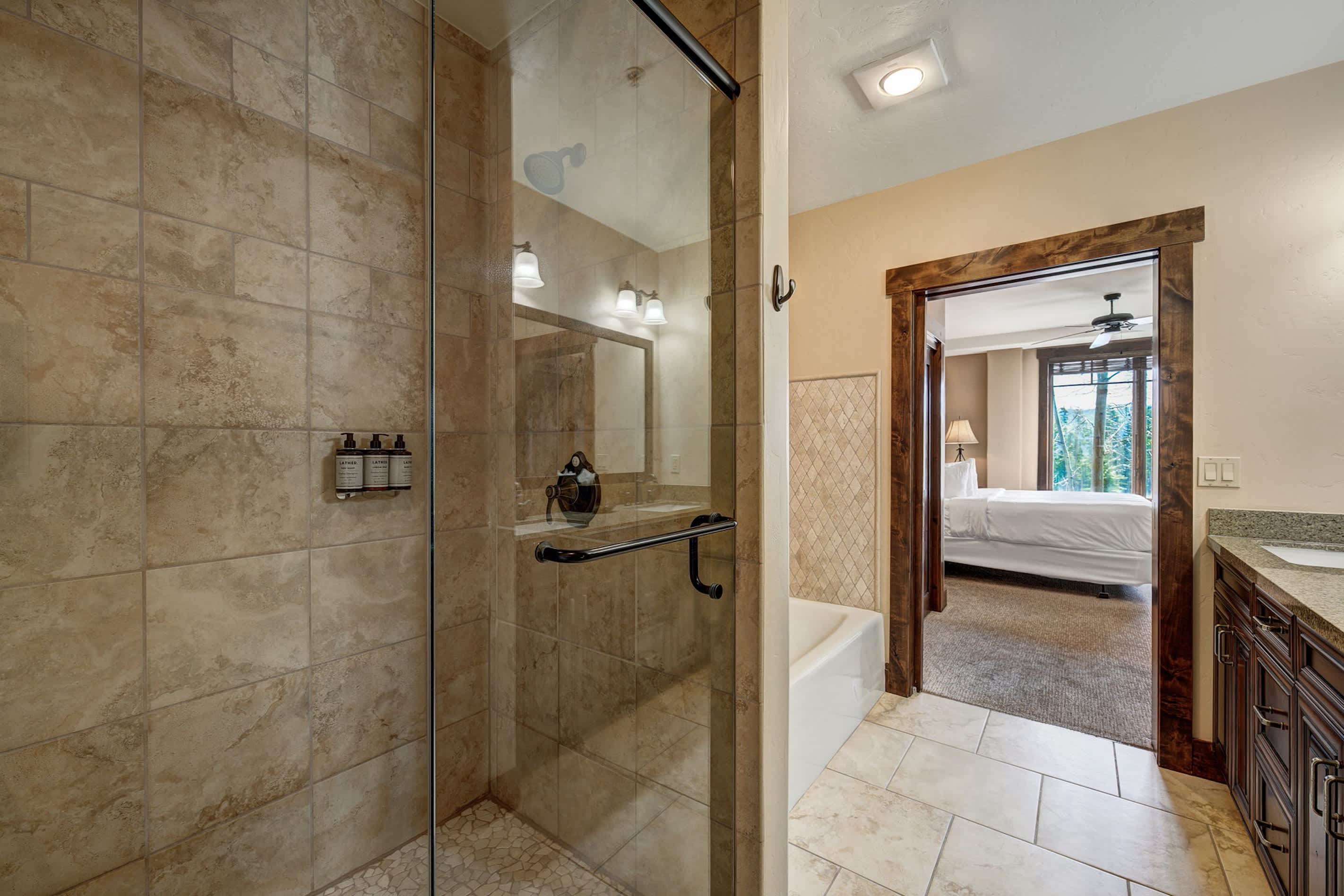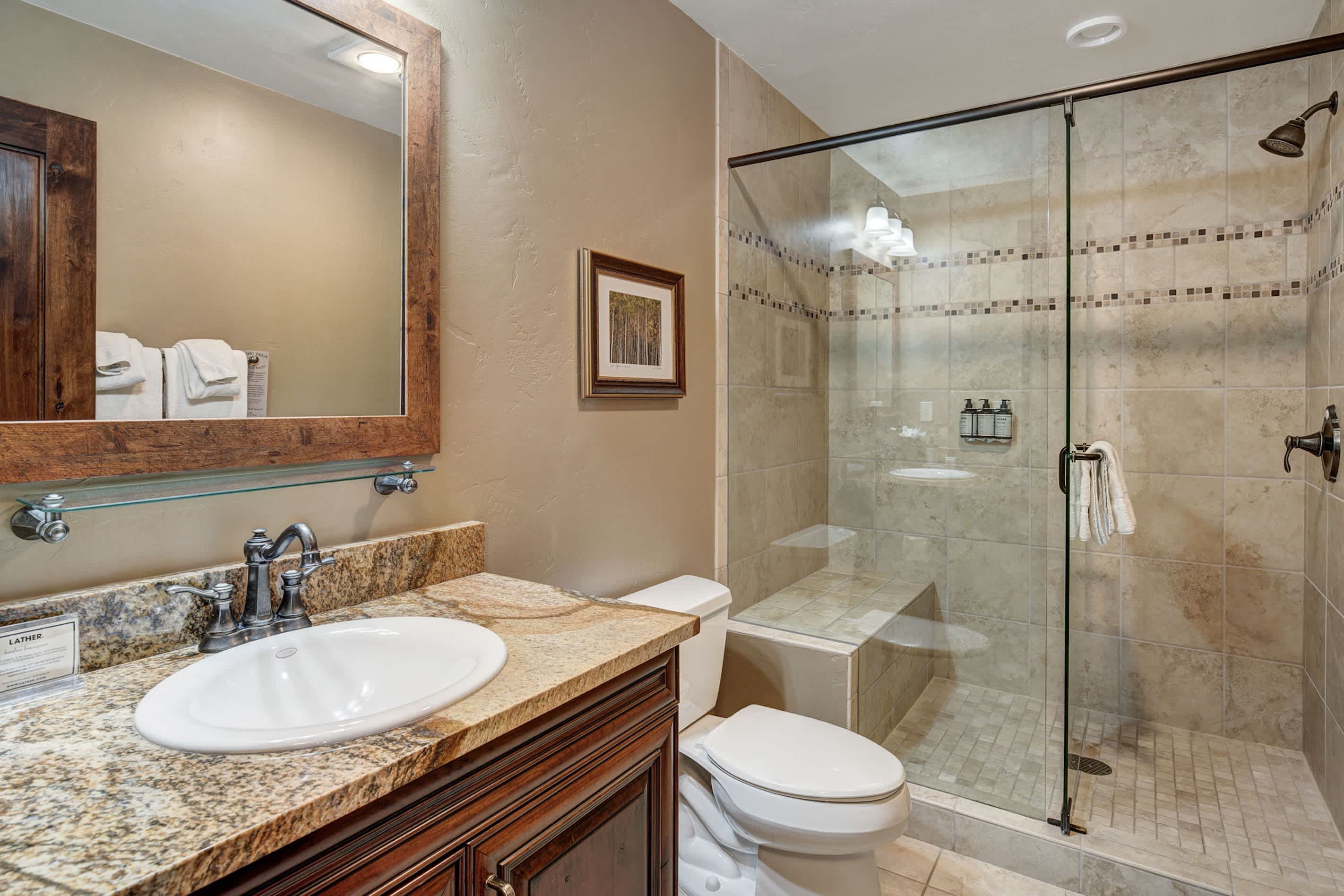 Settle into a comfortable 1-bedroom, 2-bath condo designed for easy mountain days and relaxed evenings. The living area offers room to unwind and includes a queen sleeper sofa for additional guests. The private bedroom features a king bed and smart TV, along with an ensuite bathroom showcasing a dual vanity, soaking tub, and walk-in shower. A second full bathroom with a walk-in shower adds convenience for your group. You’ll also have an in-home washer and dryer to keep gear fresh between adventures. Onsite, enjoy shared building amenities including an indoor pool, hot tub, fitness center, and outdoor BBQ/seating areas.