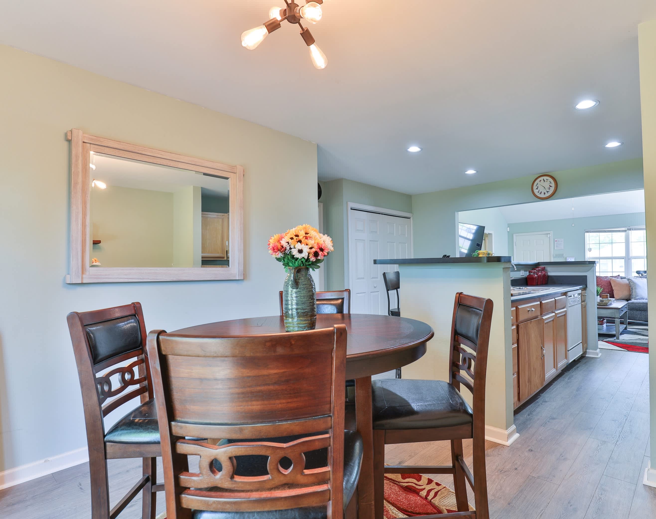 Step inside to a bright, open-concept living space filled with natural light and cozy touches. The living room welcomes you with a spacious sectional, a Smart TV, and vaulted ceilings that create an airy, relaxed vibe. The faux hardwood floors flow seamlessly into the kitchen and dining area, where you’ll find a fully equipped kitchen with full-size appliances and an island with counter seating for four—perfect for sharing stories over snacks or sipping wine while cooking. The adjacent dining table seats four comfortably for casual meals or game nights. If you're looking to stay active, an exercise bike and small set of dumbbells are ready for a quick workout.