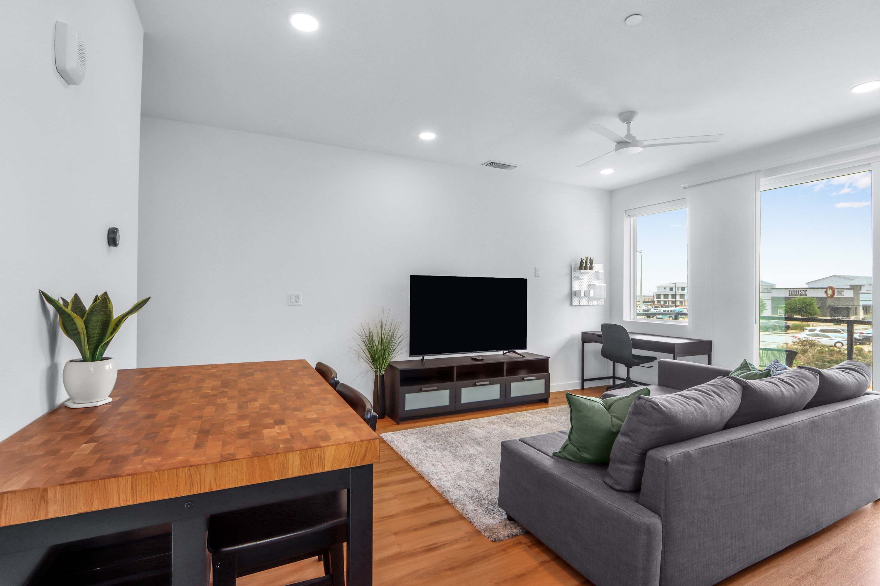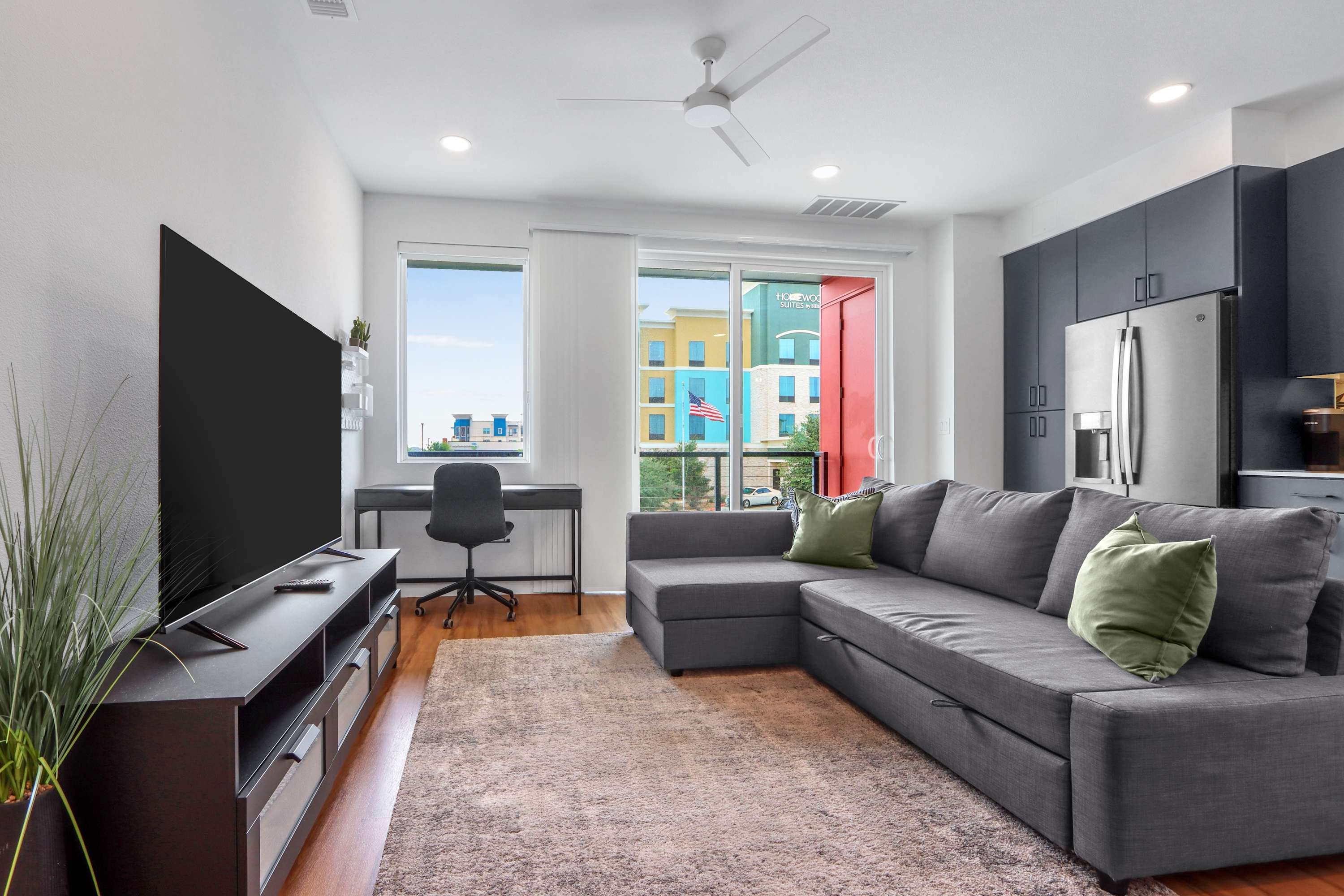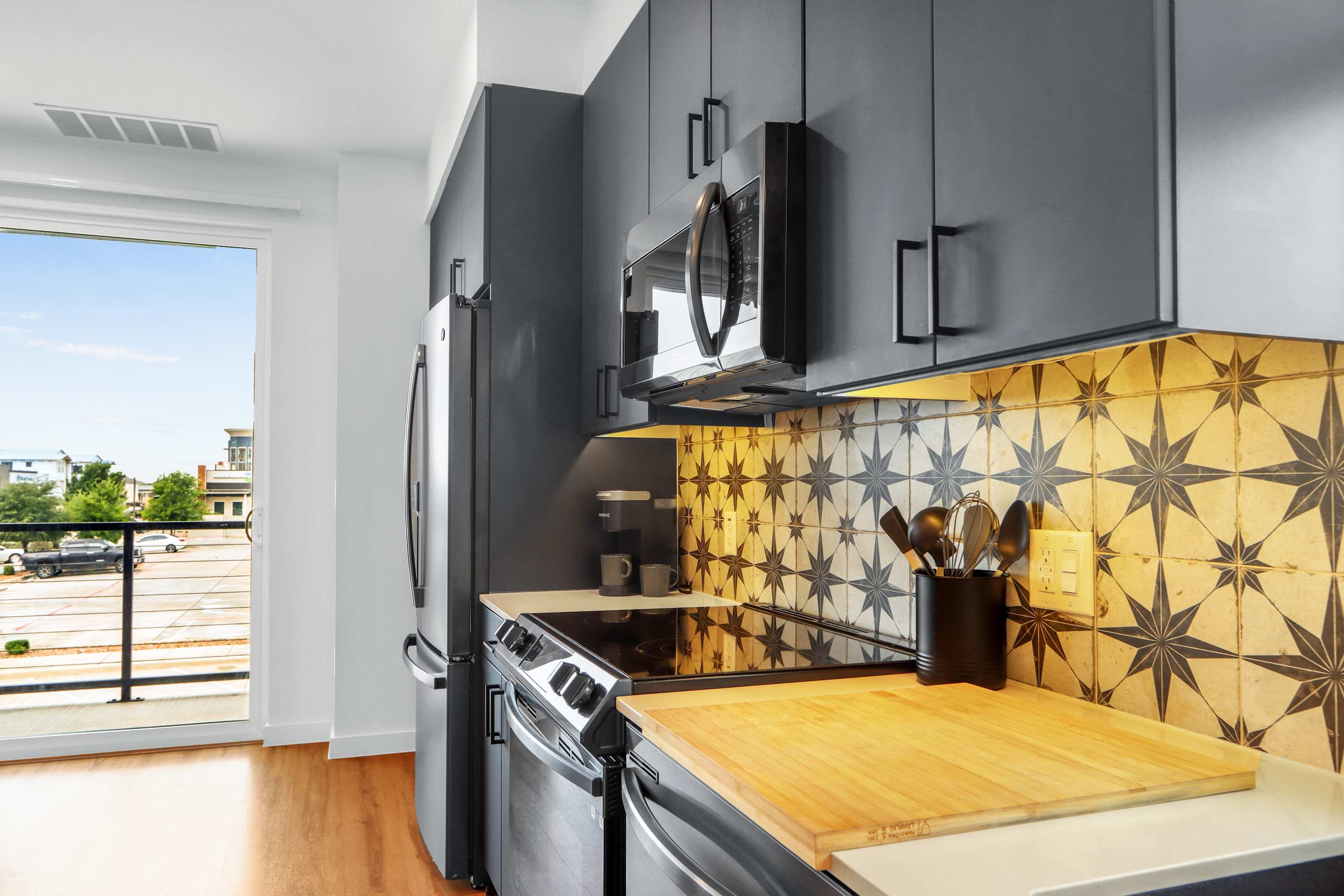 Step inside this beautifully designed corner unit and feel instantly at home. The open-concept living space features a cozy gray sofa, a Smart TV for relaxing nights in, and a dedicated corner desk—perfect for remote work or planning your day’s adventures. The sleek kitchen is fully equipped with stainless steel appliances, dark gray cabinetry, a single-cup coffee station, and a butcher block dining table for four. When you're ready to enjoy the fresh Texas air, step out onto your private balcony with seating for two—ideal for your morning coffee or an evening glass of wine. In the bedroom, room-darkening shades promise a restful night’s sleep after a day full of exploring.