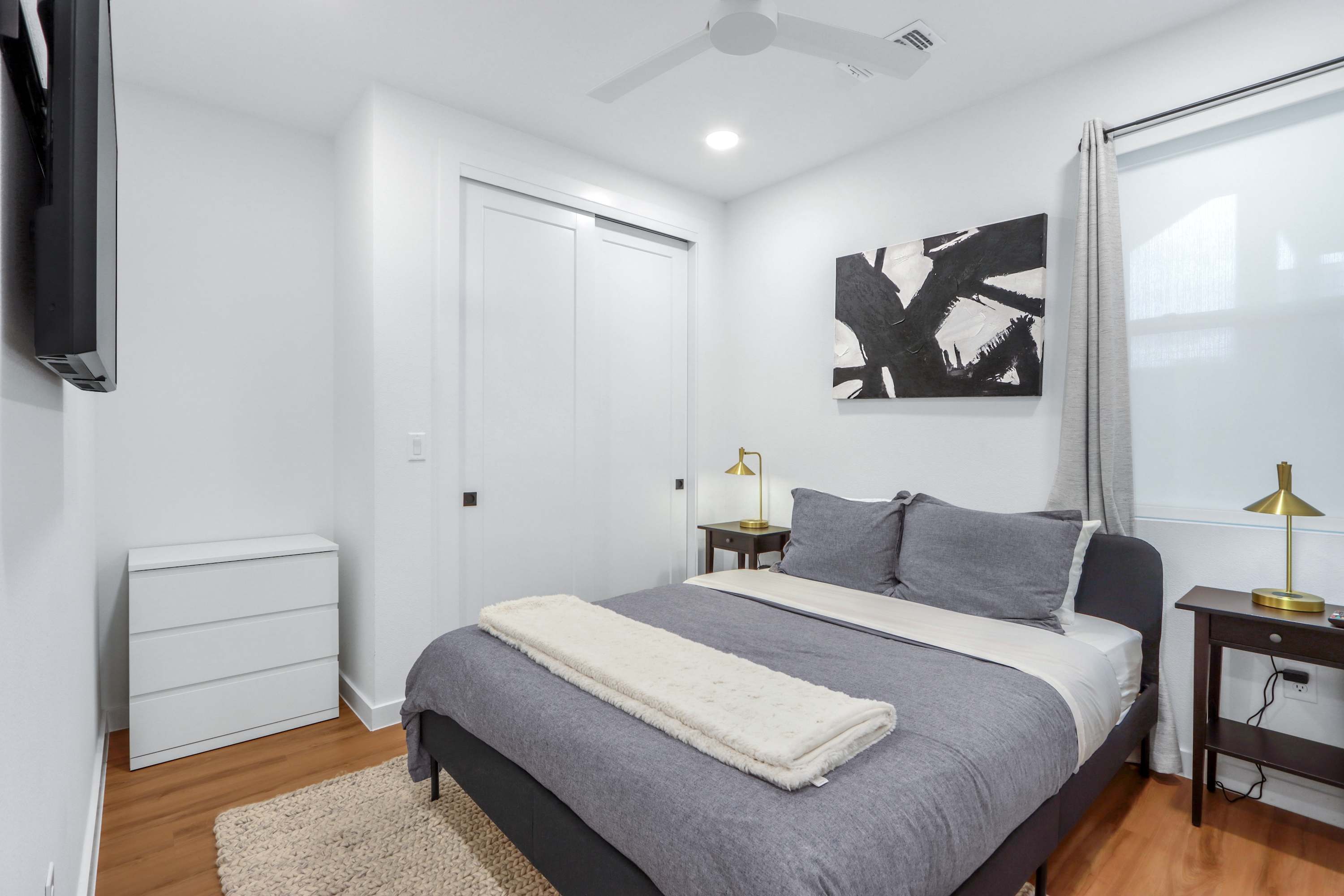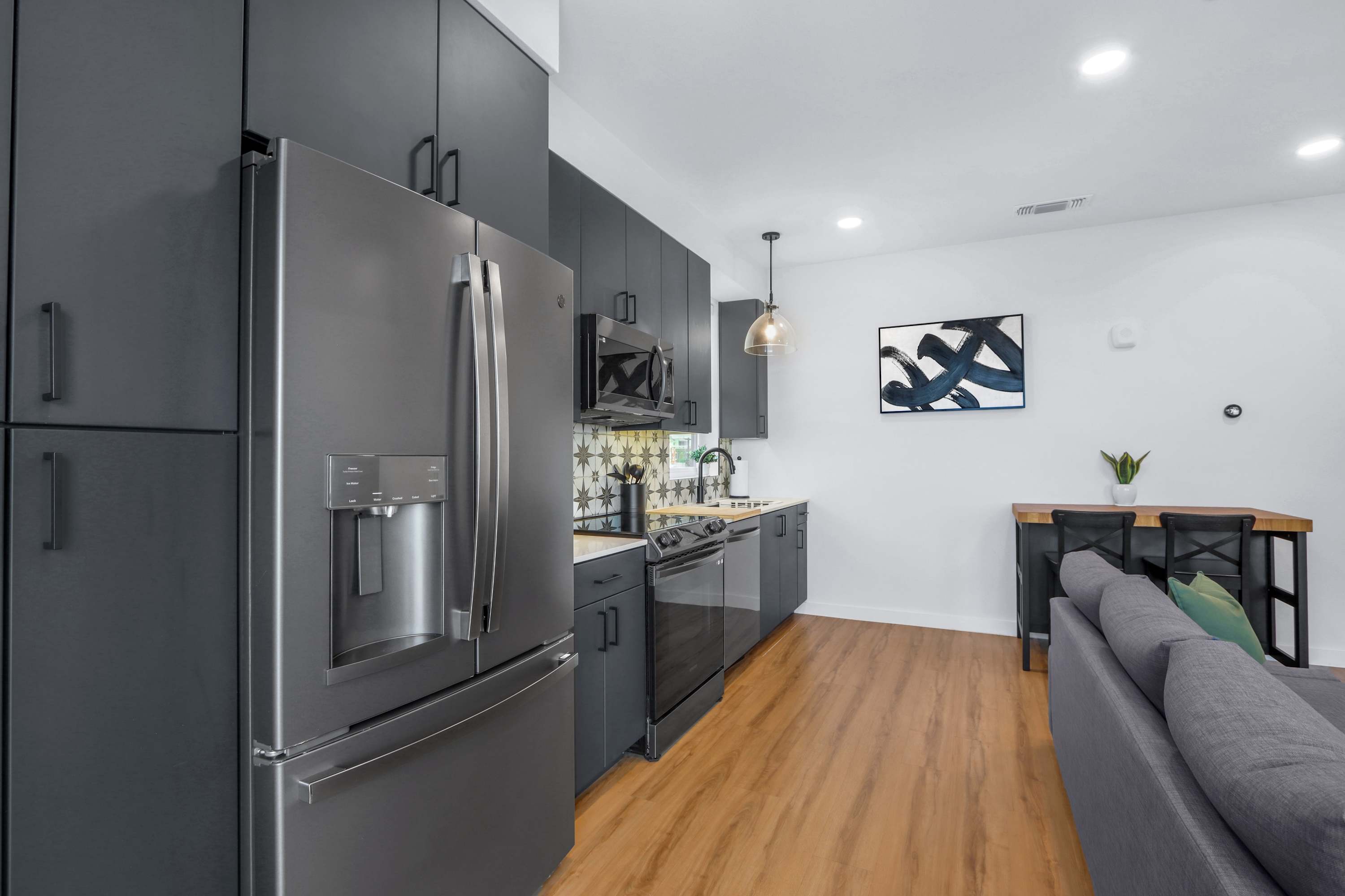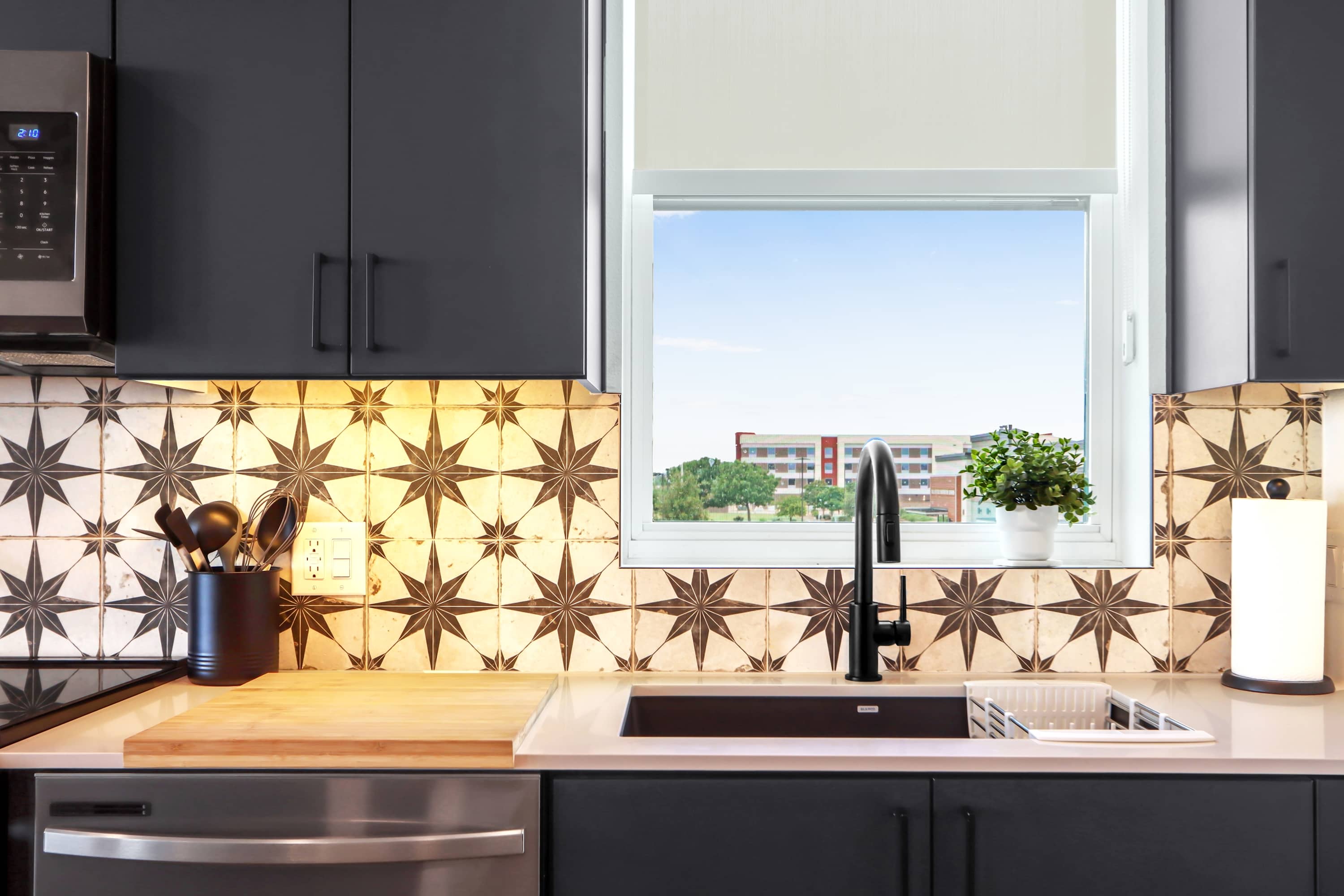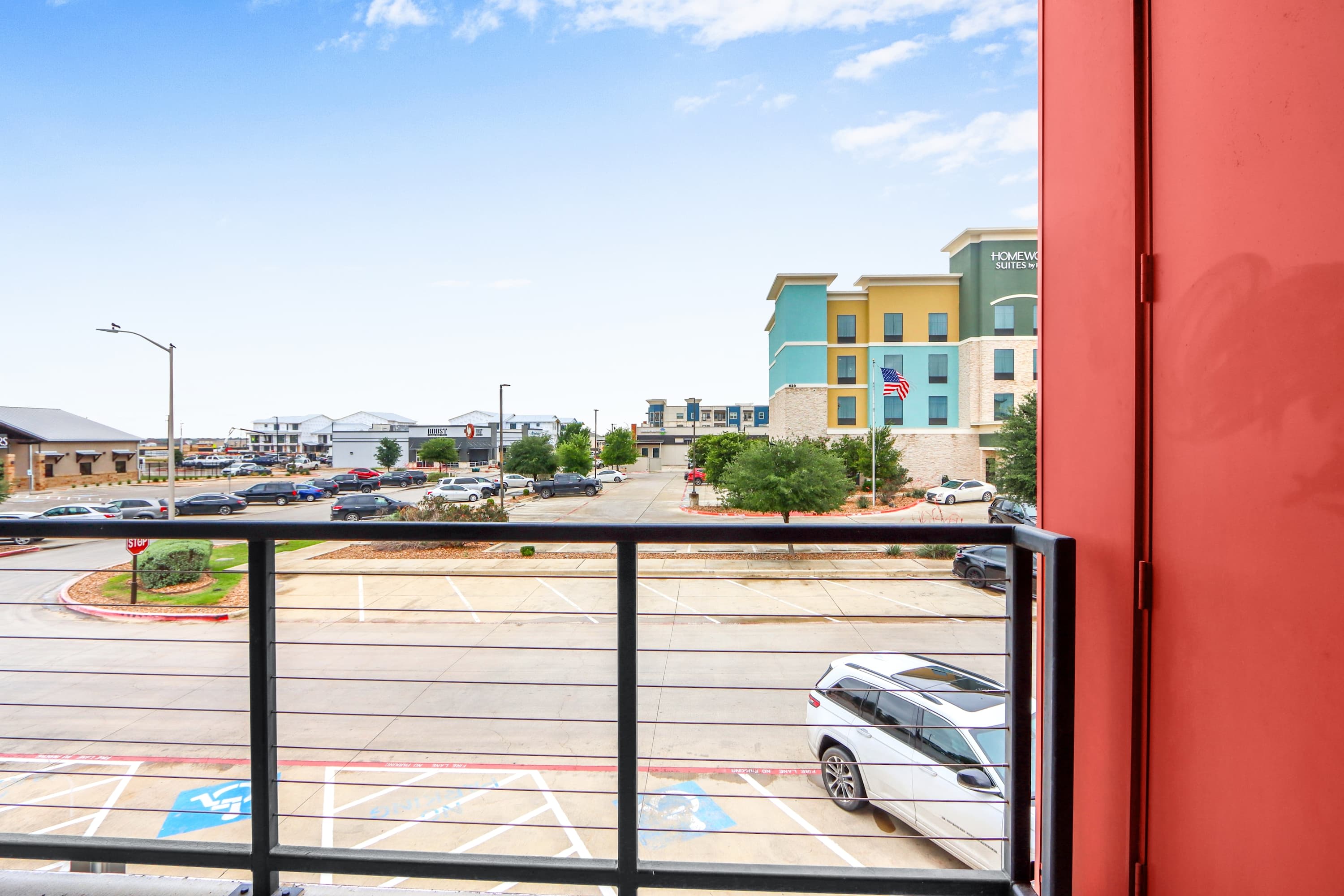 Step inside this beautifully designed corner unit and feel instantly at home. The open-concept living space features a cozy gray sofa, a Smart TV for relaxing nights in, and a dedicated corner desk—perfect for remote work or planning your day’s adventures. The sleek kitchen is fully equipped with stainless steel appliances, dark gray cabinetry, a single-cup coffee station, and a butcher block dining table for four. When you're ready to enjoy the fresh Texas air, step out onto your private balcony with seating for two—ideal for your morning coffee or an evening glass of wine. In the bedroom, room-darkening shades promise a restful night’s sleep after a day full of exploring.
