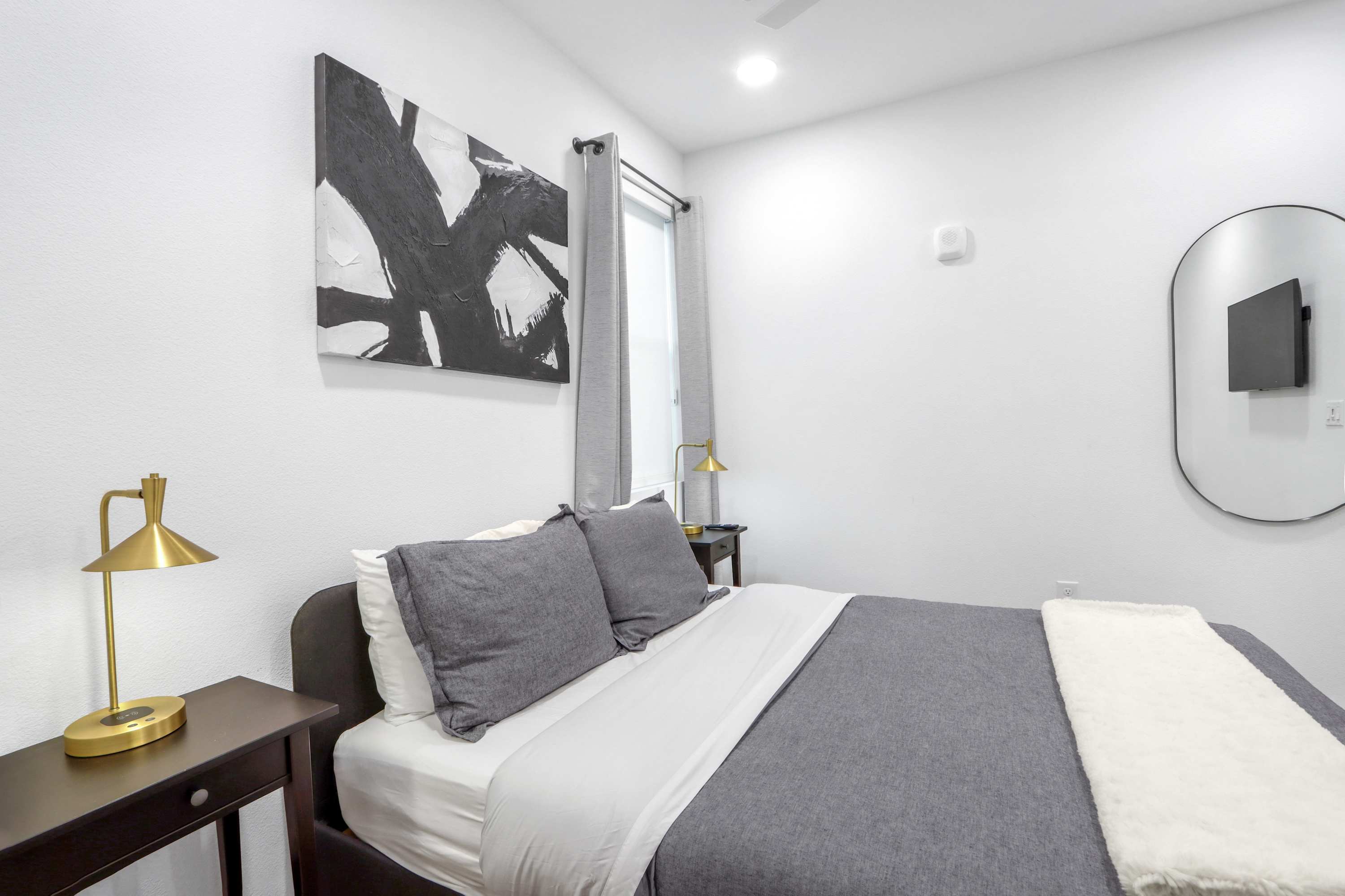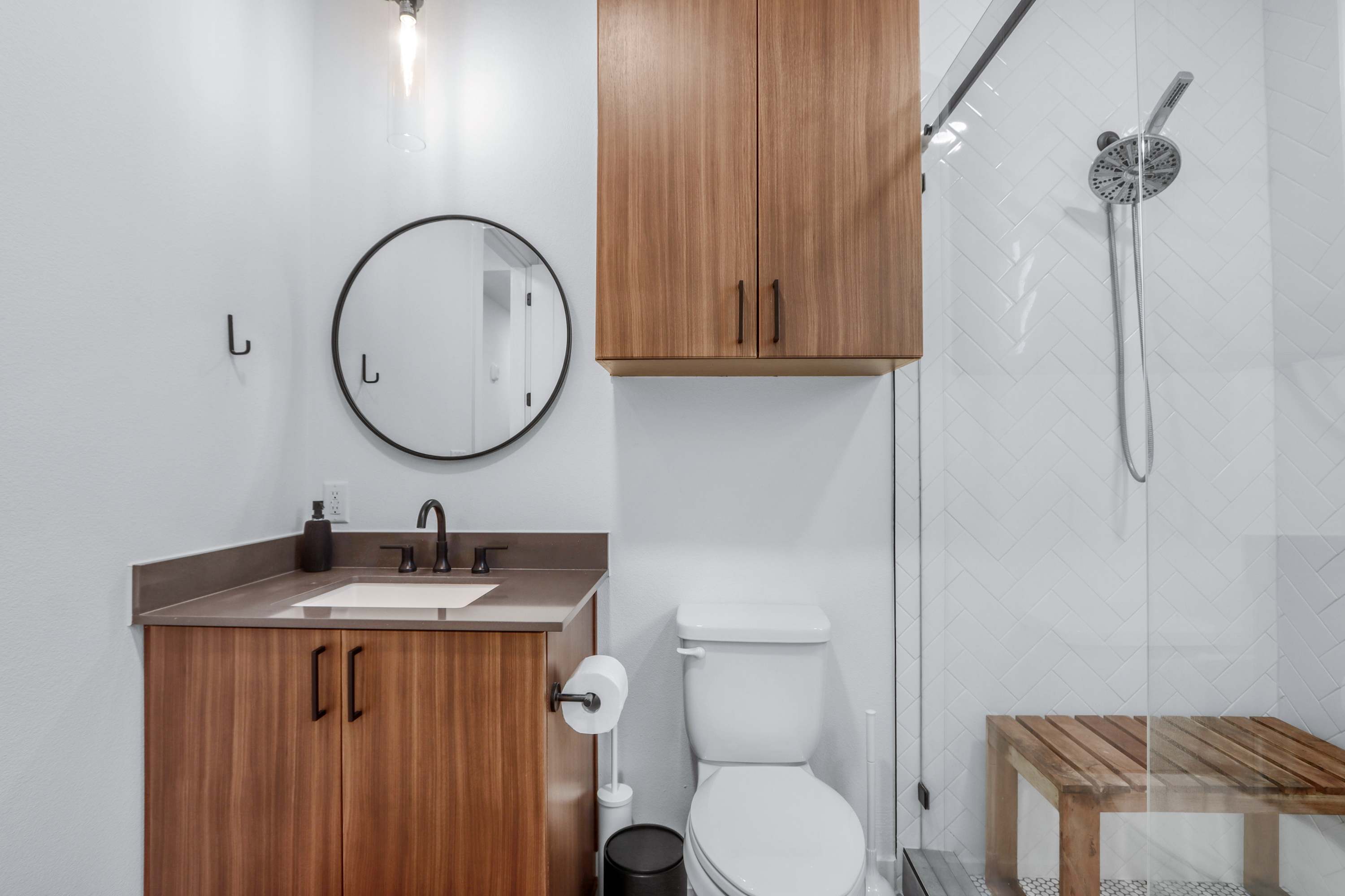 The bedroom includes a queen size bed, a smart TV, and an ensuite bathroom with a single vanity and a walk-in shower.