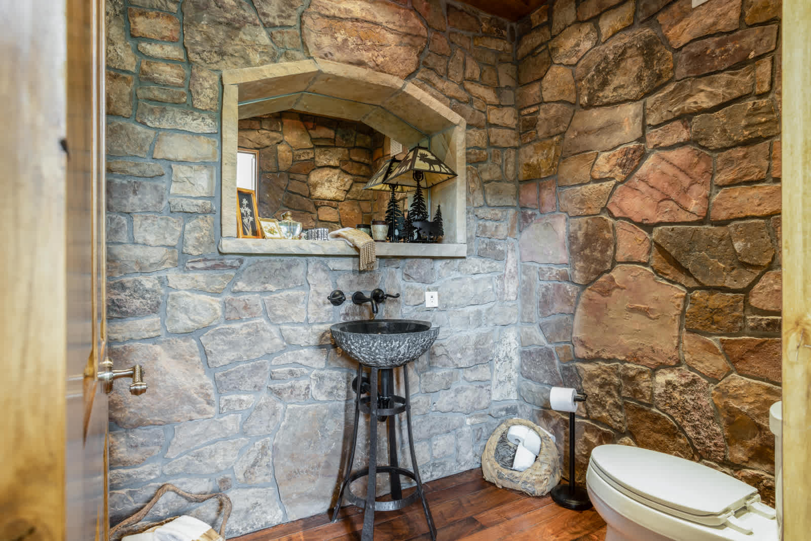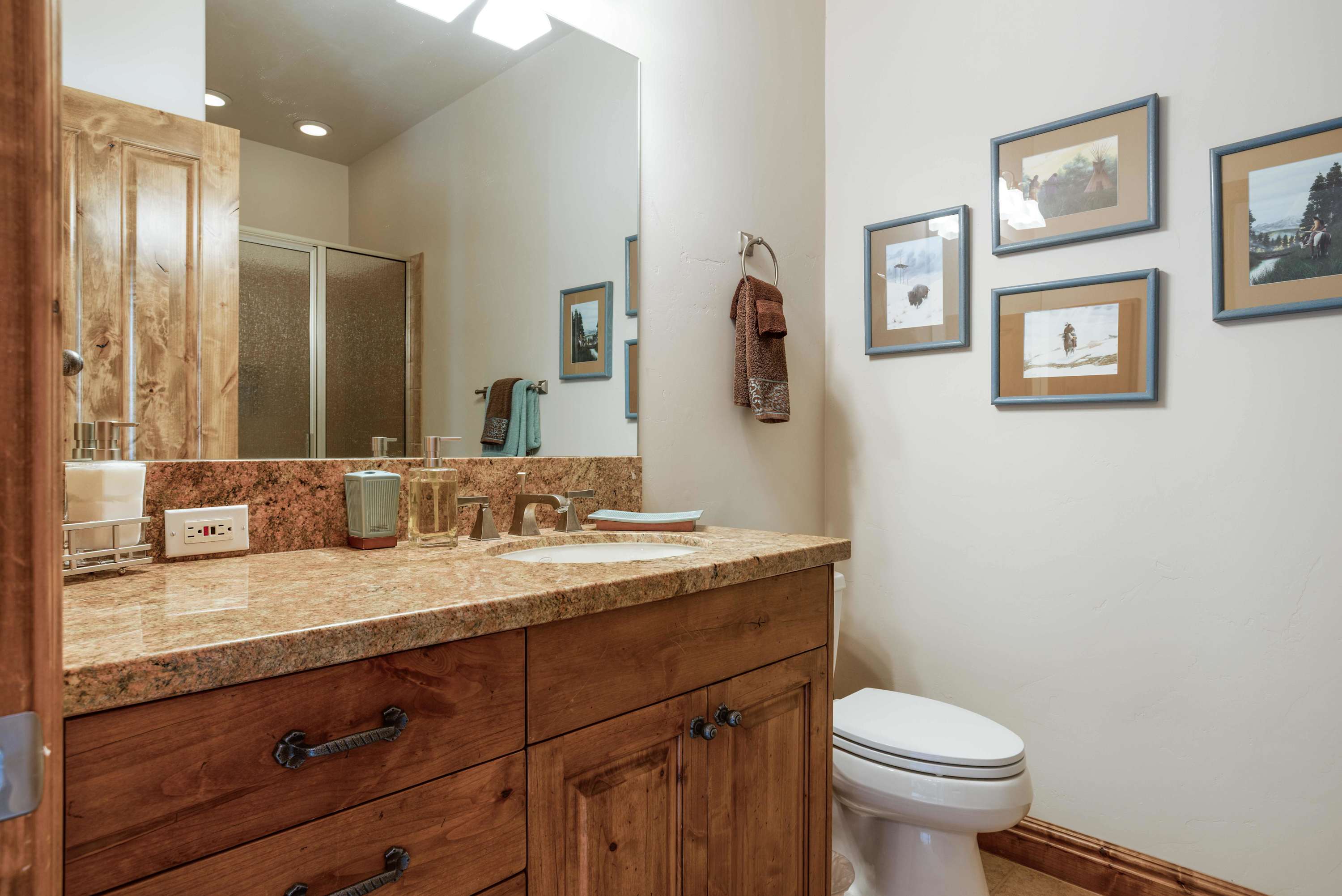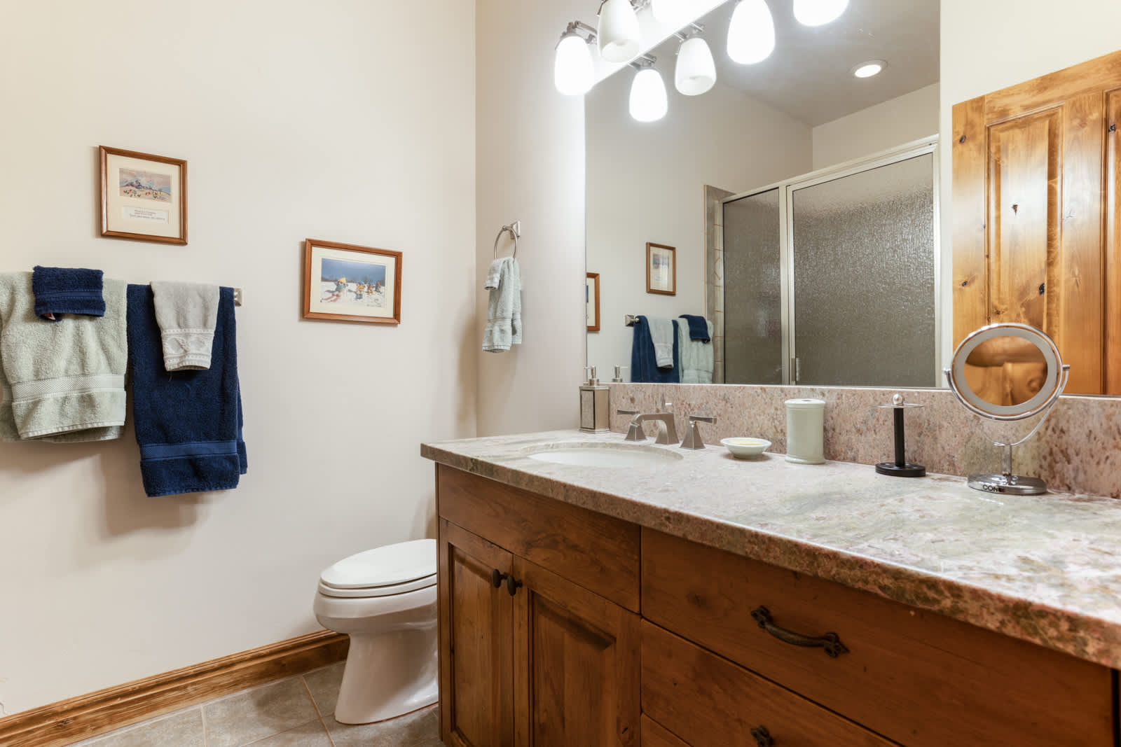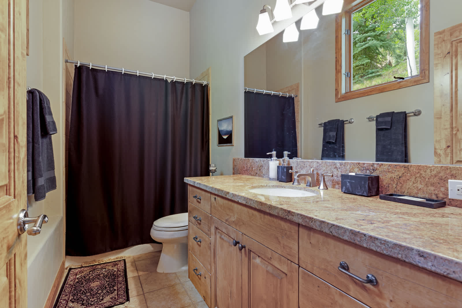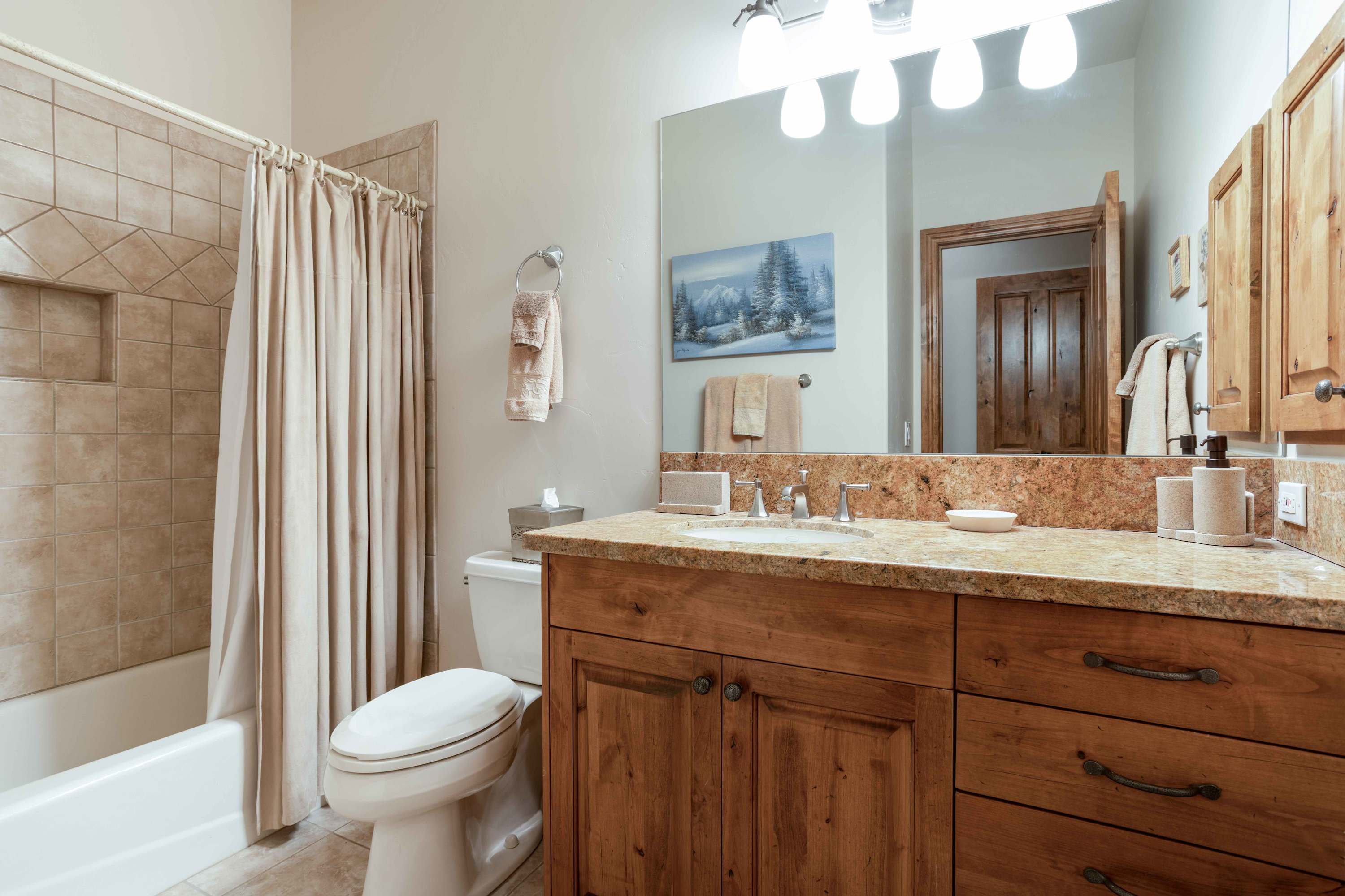 Unwind in the expansive living room with a sectional sofa, fireplace, and smart TV. Outside, enjoy alfresco dining for eight, fire up the grill, or soak in the private hot tub as the sun sets over the peaks. This home also includes a grotto style half bathroom with a pedestal sink.