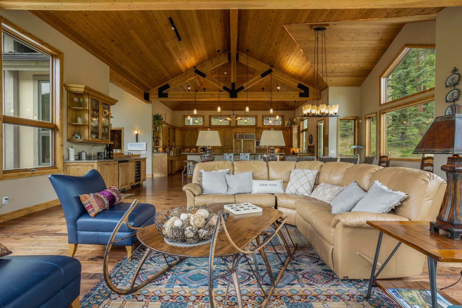 Step inside this inviting mountain retreat, where soaring ceilings and large windows frame stunning views. The open-concept layout brings everyone together, with a spacious kitchen featuring stainless steel appliances, stone counters, and an island with seating for six. The adjacent dining table seats eight, perfect for family meals or celebrations.
