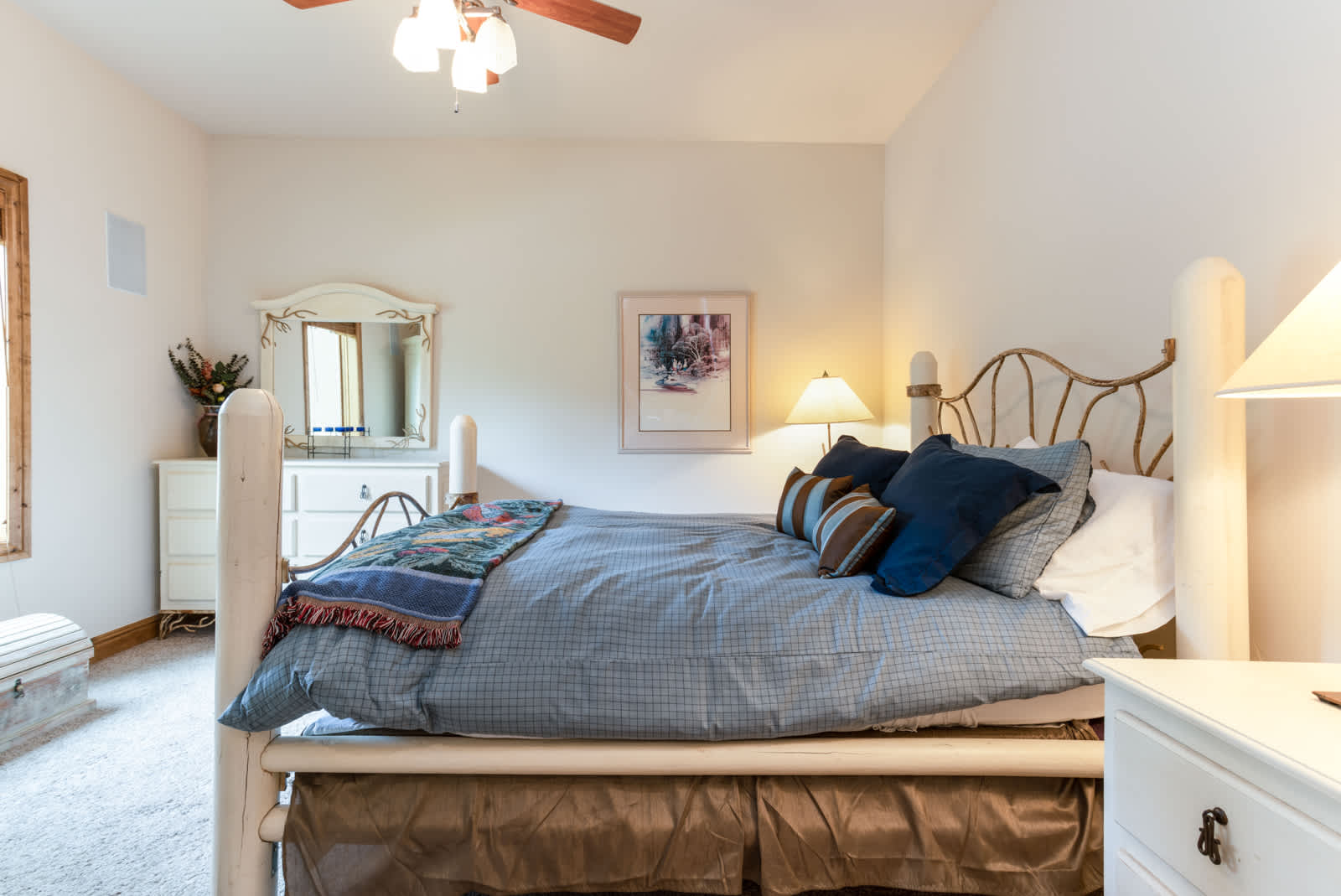 Bedroom #3 includes a queen size bed and an ensuite bathroom with a single vanity and a shower/tub combo.