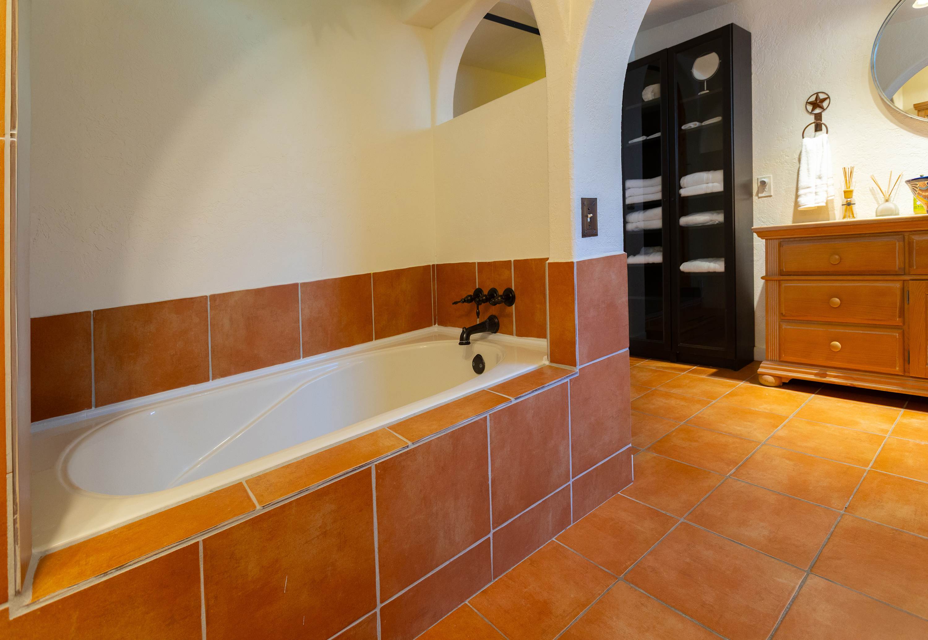 This home also includes a half bathroom and a full bathroom with a single vanity, a soaking tub, and a walk-in shower.