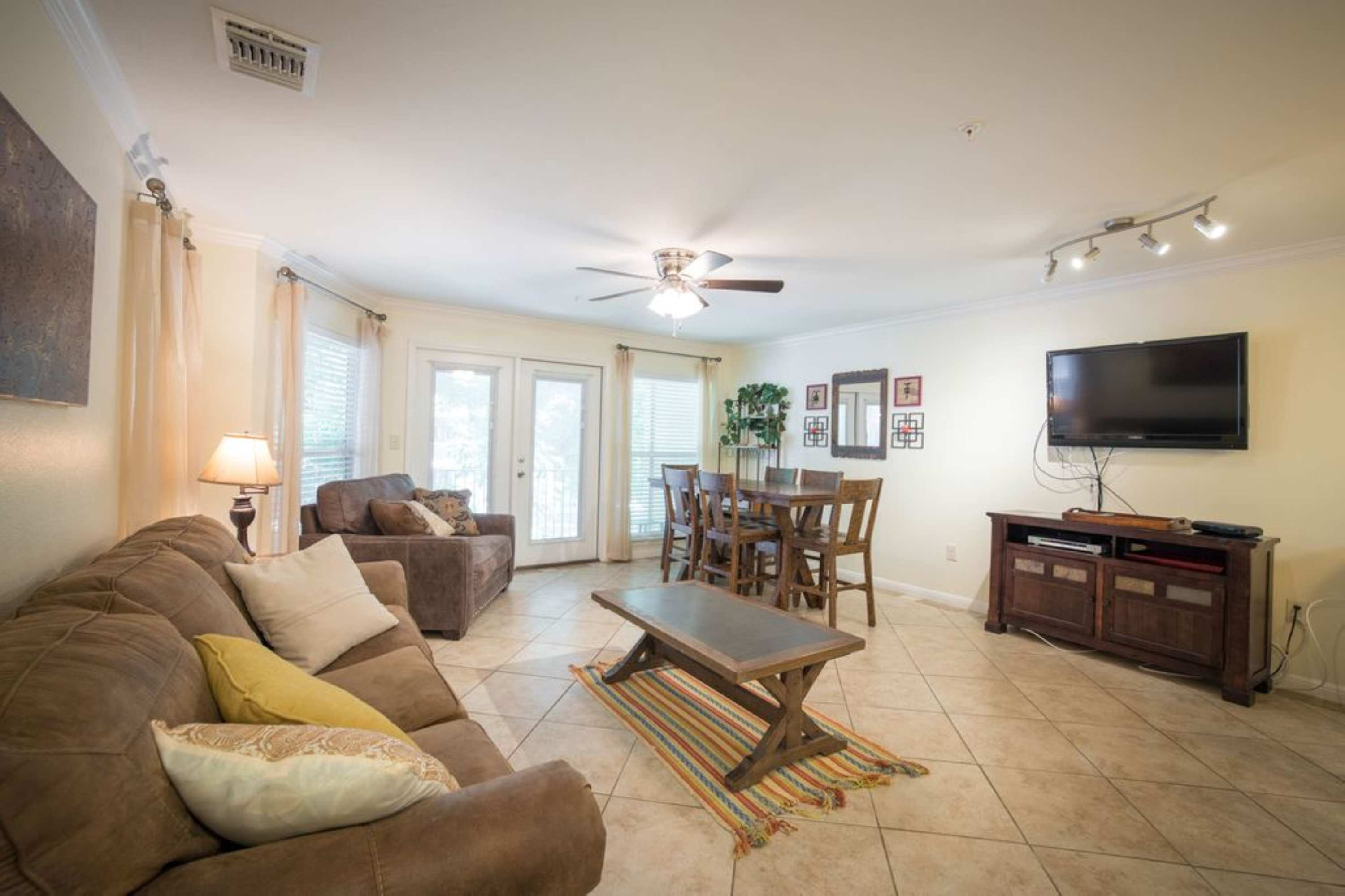 Step inside this inviting condo and take in the open-concept living and dining area, designed for gathering and relaxing. Sink into the plush couch or oversized armchair in front of the wall-mounted smart TV—perfect for movie nights after a day in the sun. The galley-style kitchen is compact but equipped with all of the essentials, featuring granite countertops, white appliances, and counter seating for three. Prepare a meal for the whole crew, or unpack some local takeout, and head over to the wood dining table for six that flows seamlessly into the living space. After your meal, open up the French doors to the balcony and enjoy your morning coffee or evening drink at the outdoor table for four, surrounded by the sounds of the nearby river. When it’s time to rest, room-darkening shades in the bedrooms ensure peaceful sleep before another day ahead.