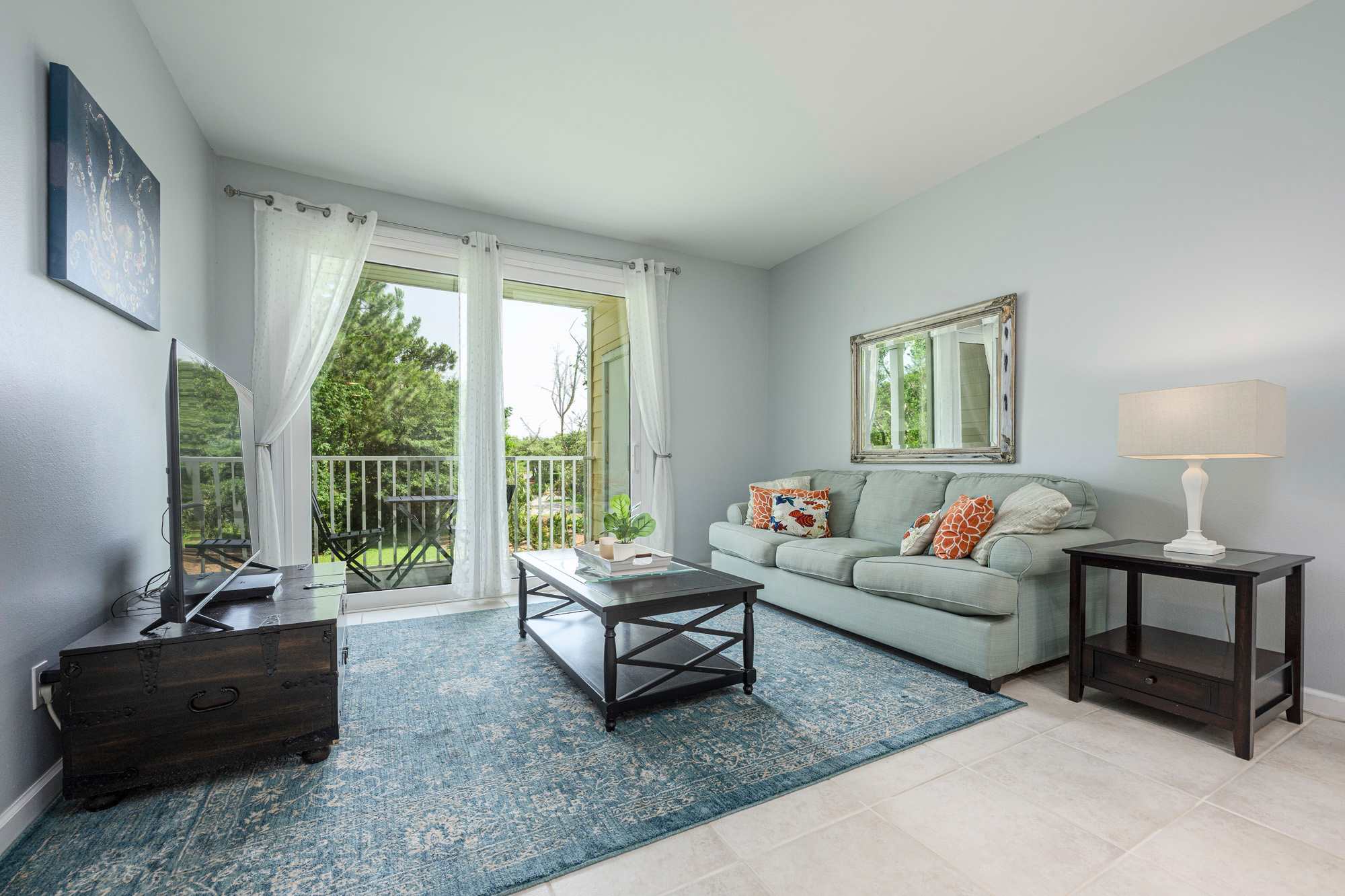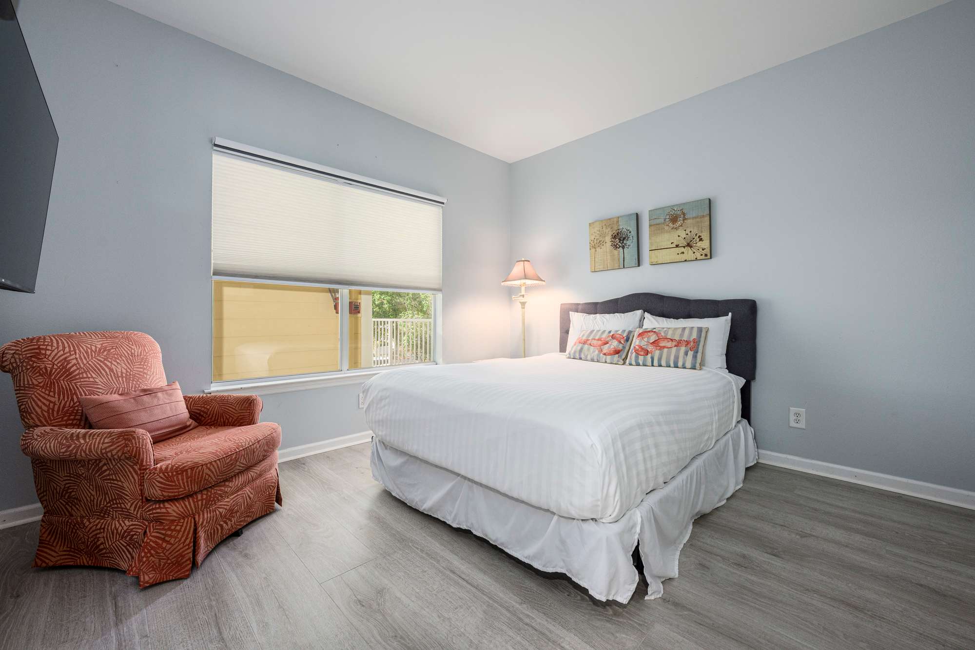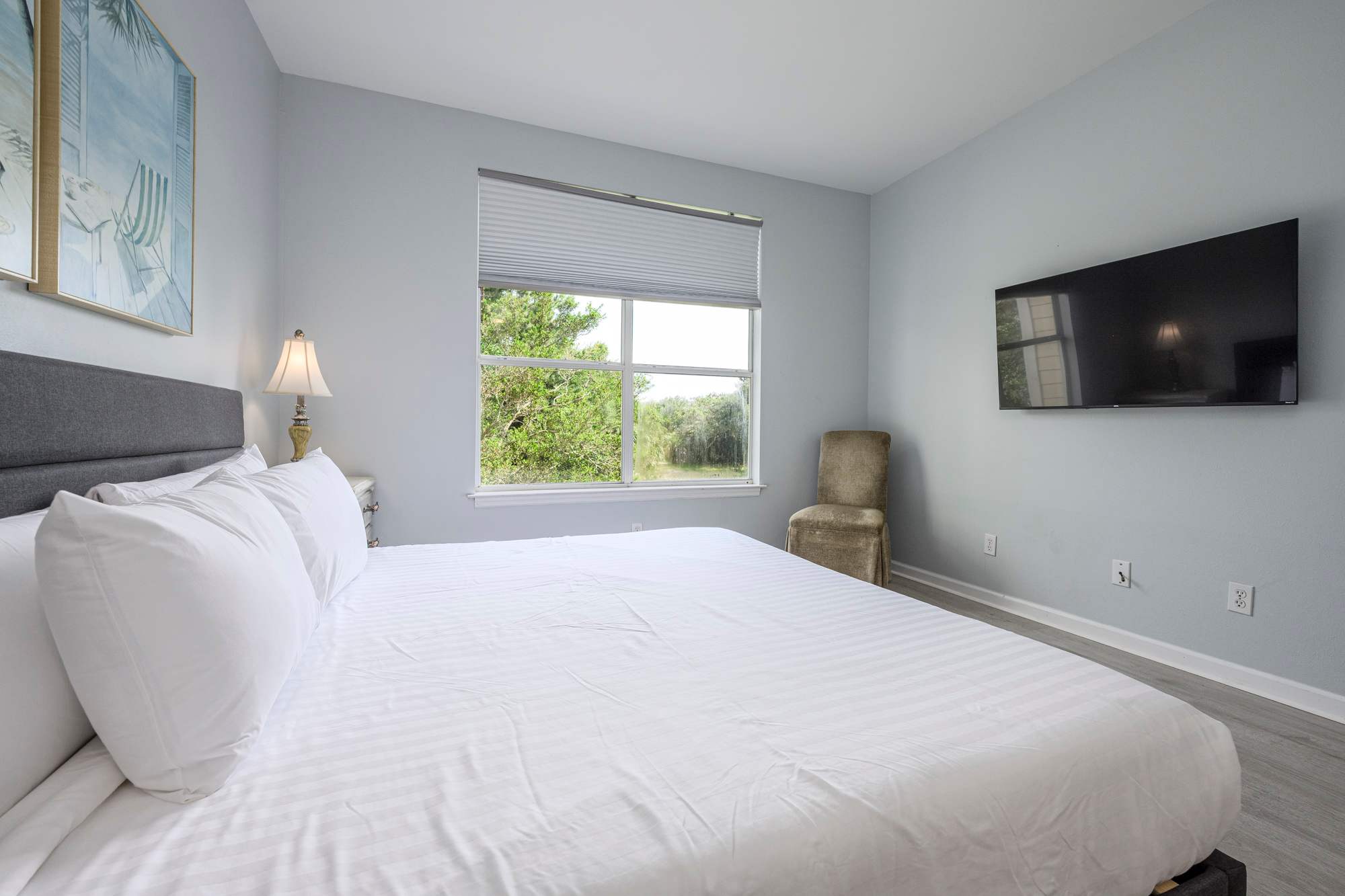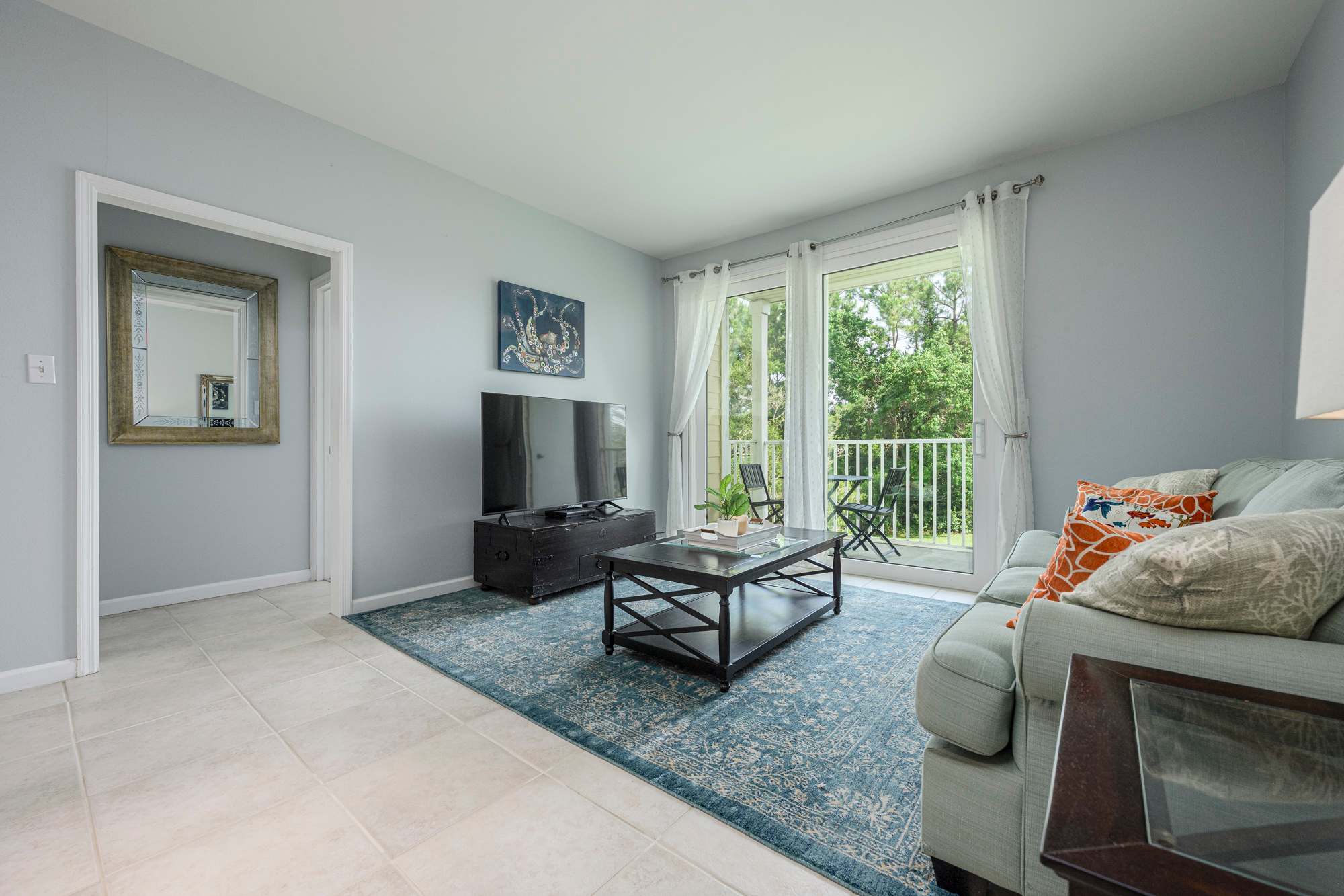 Just off the living room, the private balcony offers a relaxing outdoor escape with peaceful, tree‑lined views. Furnished with a bistro table and seating for two, it’s the perfect spot to enjoy morning coffee, unwind with a drink, or take in the fresh air after a day at the beach.