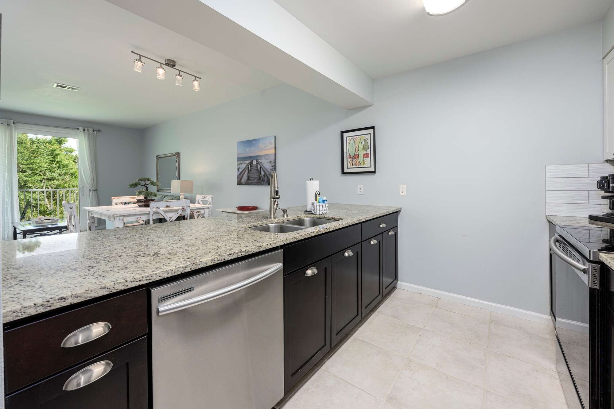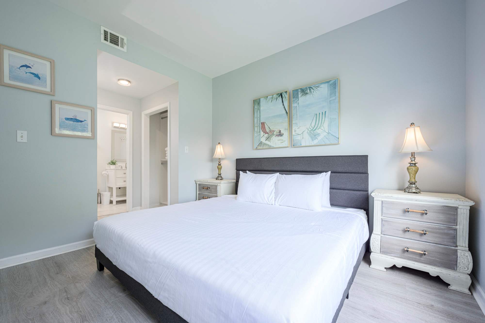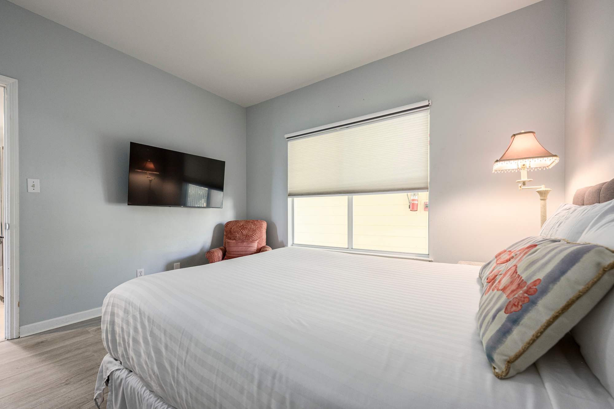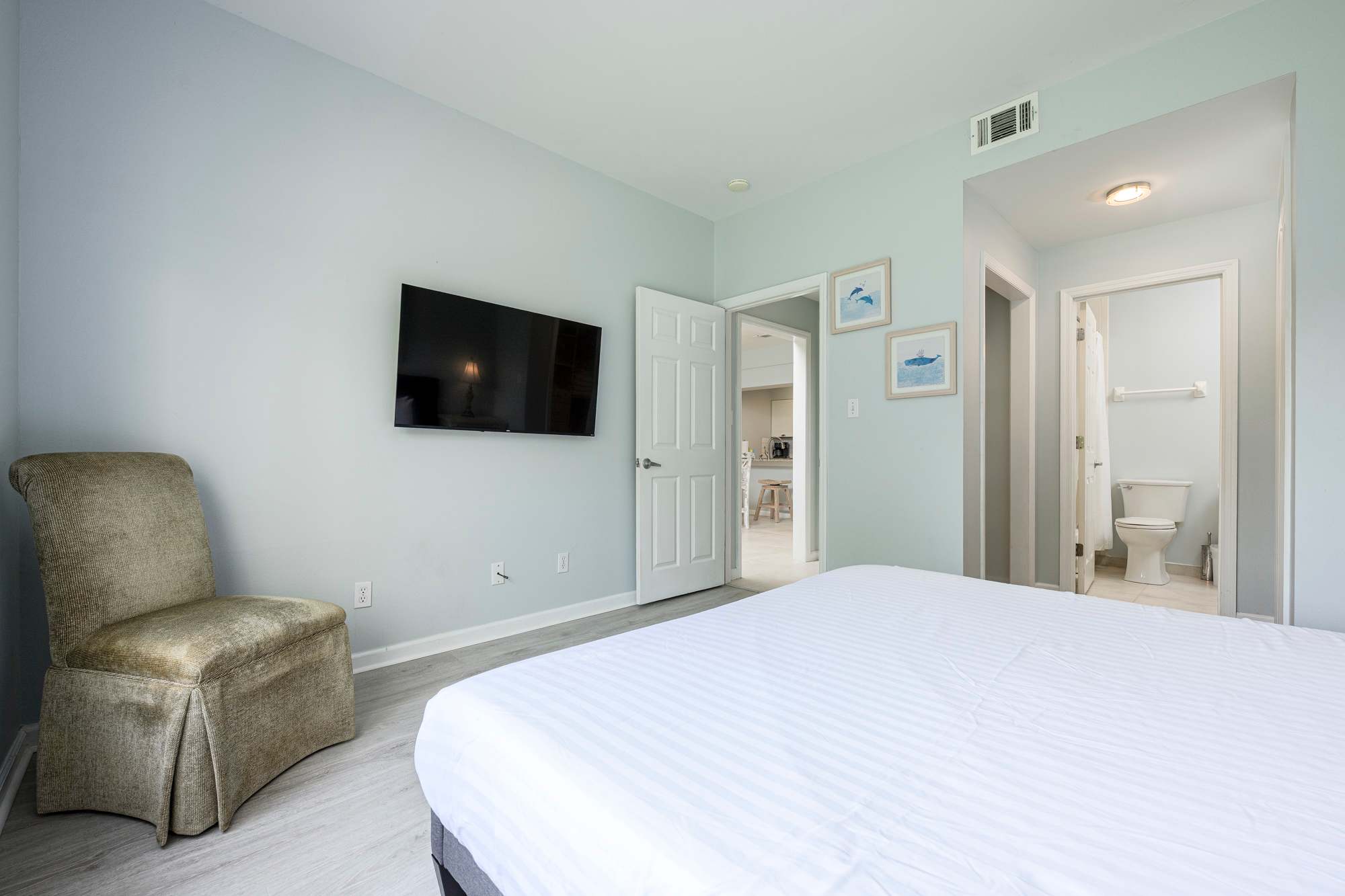 Just off the living room, the private balcony offers a relaxing outdoor escape with peaceful, tree‑lined views. Furnished with a bistro table and seating for two, it’s the perfect spot to enjoy morning coffee, unwind with a drink, or take in the fresh air after a day at the beach.
