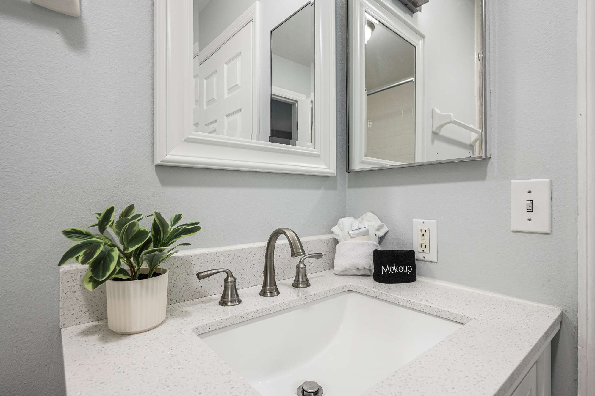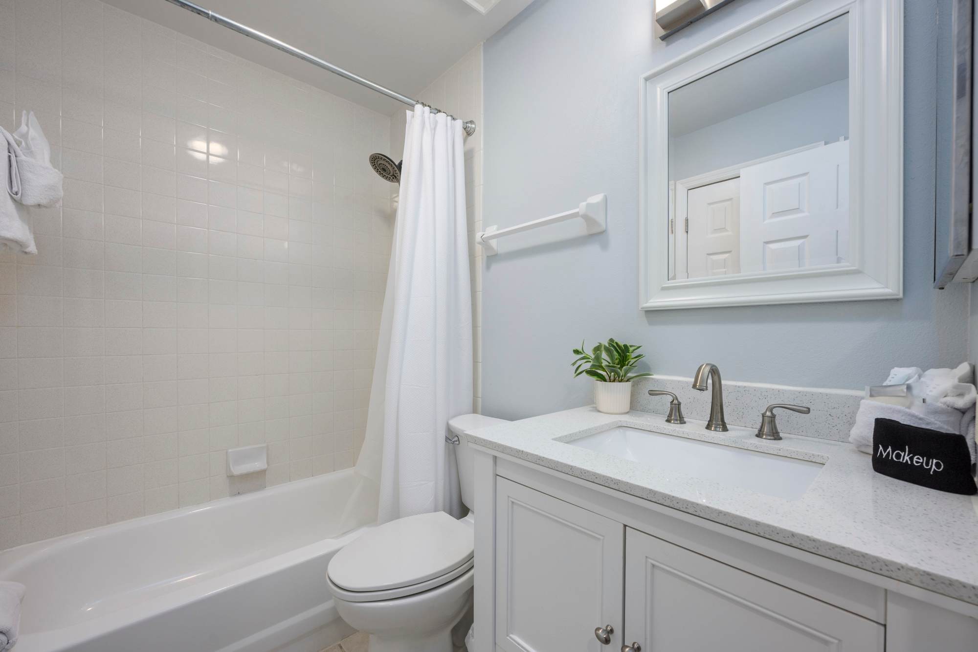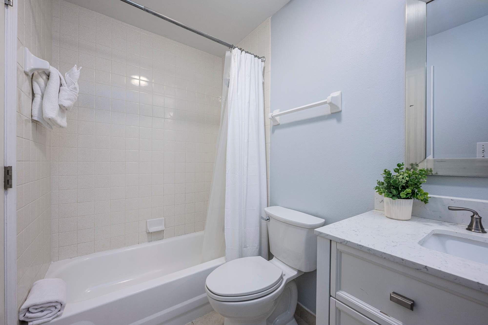 Primary Bedroom: features a king‑size bed, a smart TV, and two spacious closets with shelving, offering plenty of storage and room to settle in comfortably. The ensuite bathroom includes a single vanity and a shower/tub combo, providing privacy and convenience for your stay.
