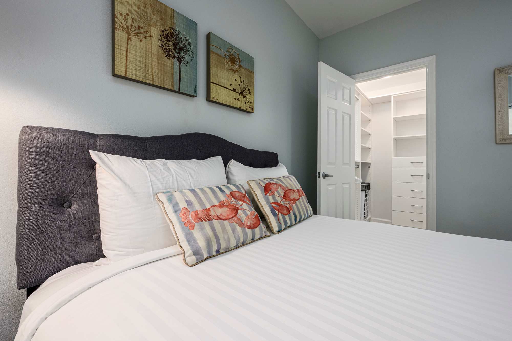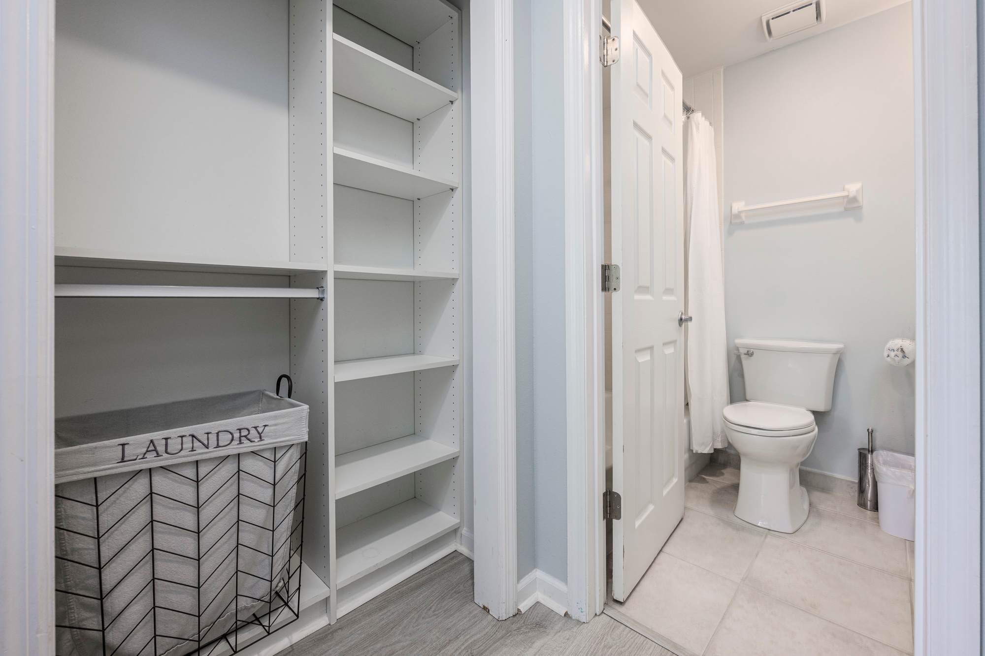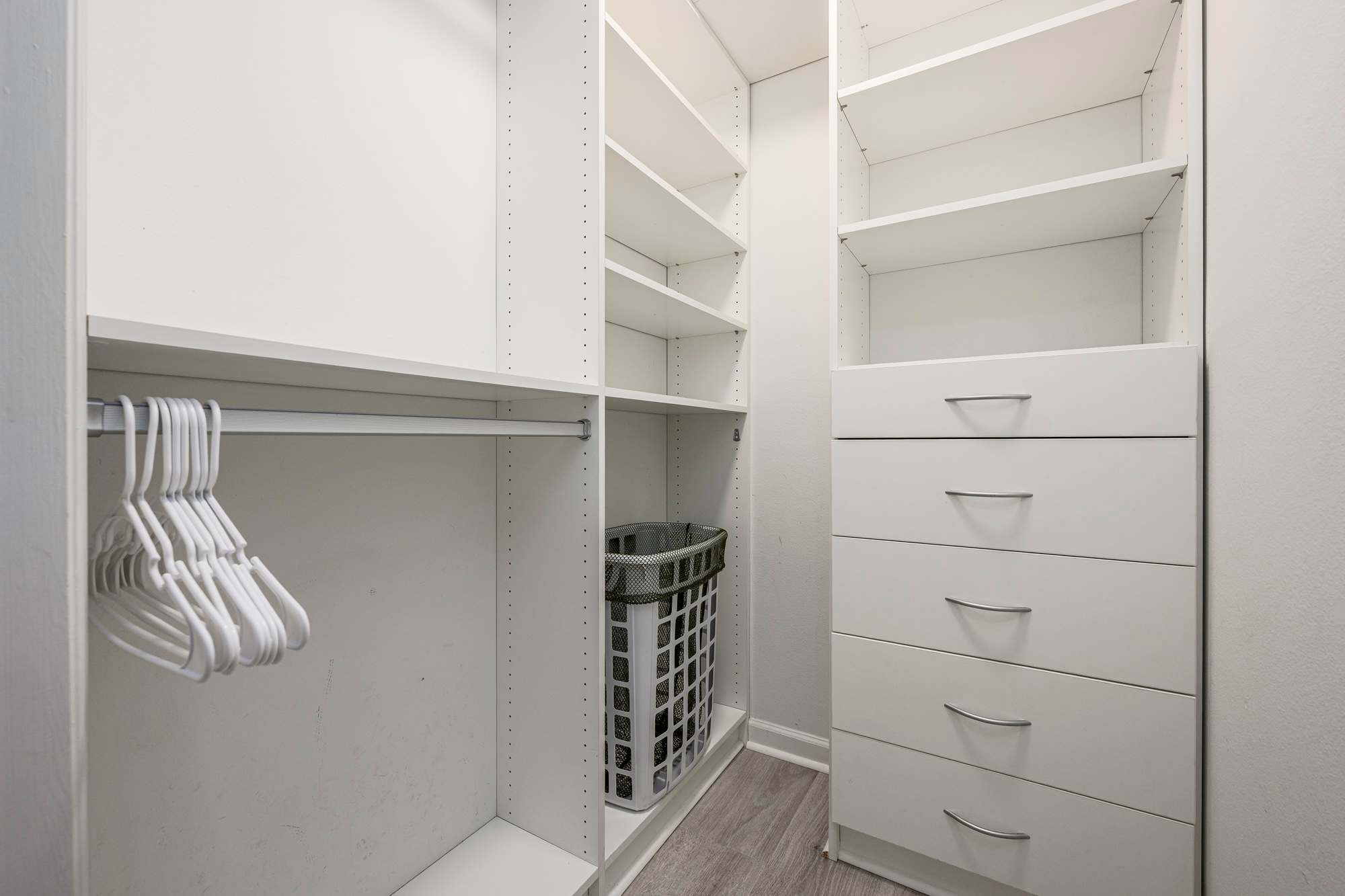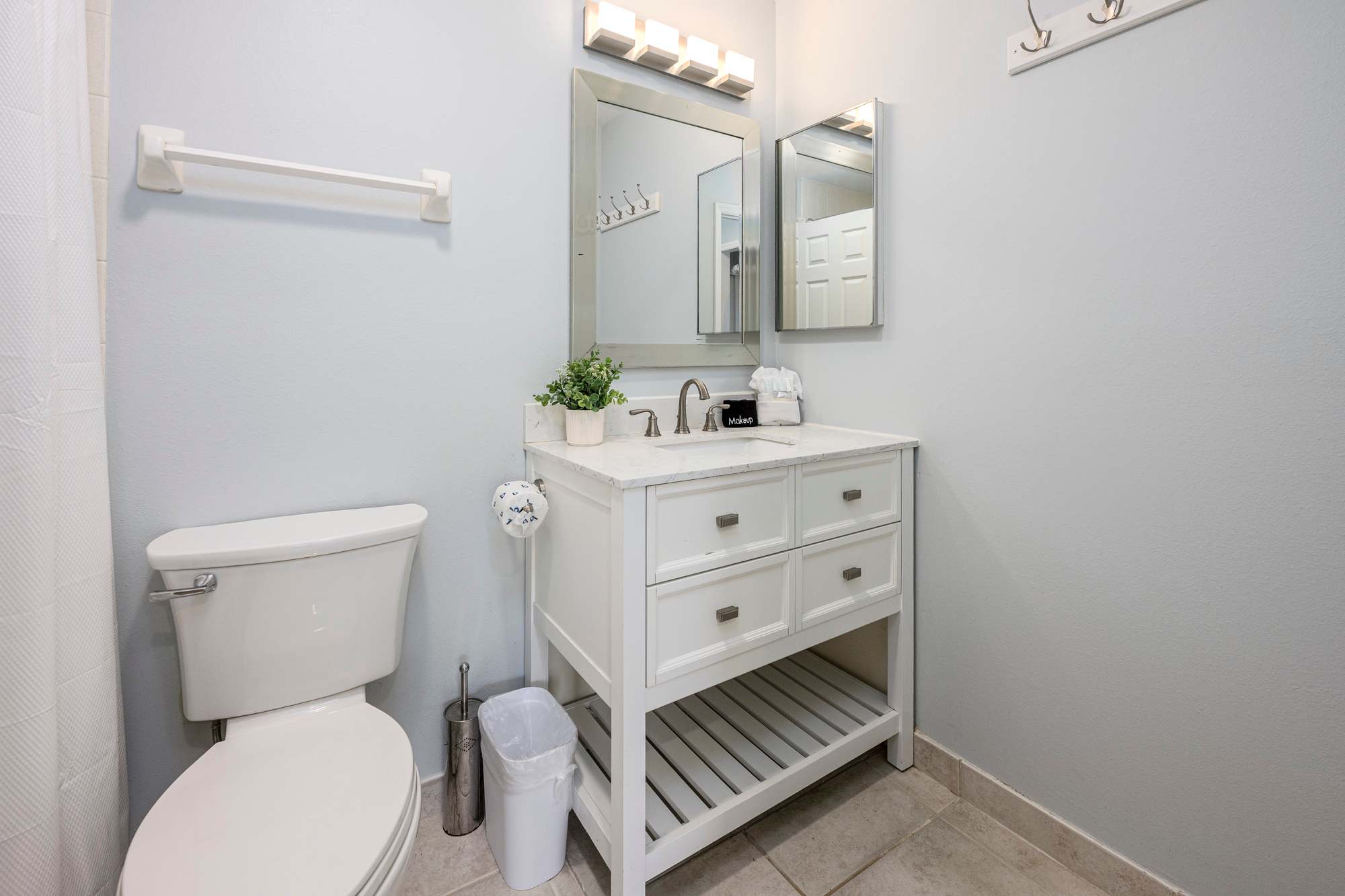 Primary Bedroom: features a king‑size bed, a smart TV, and two spacious closets with shelving, offering plenty of storage and room to settle in comfortably. The ensuite bathroom includes a single vanity and a shower/tub combo, providing privacy and convenience for your stay.