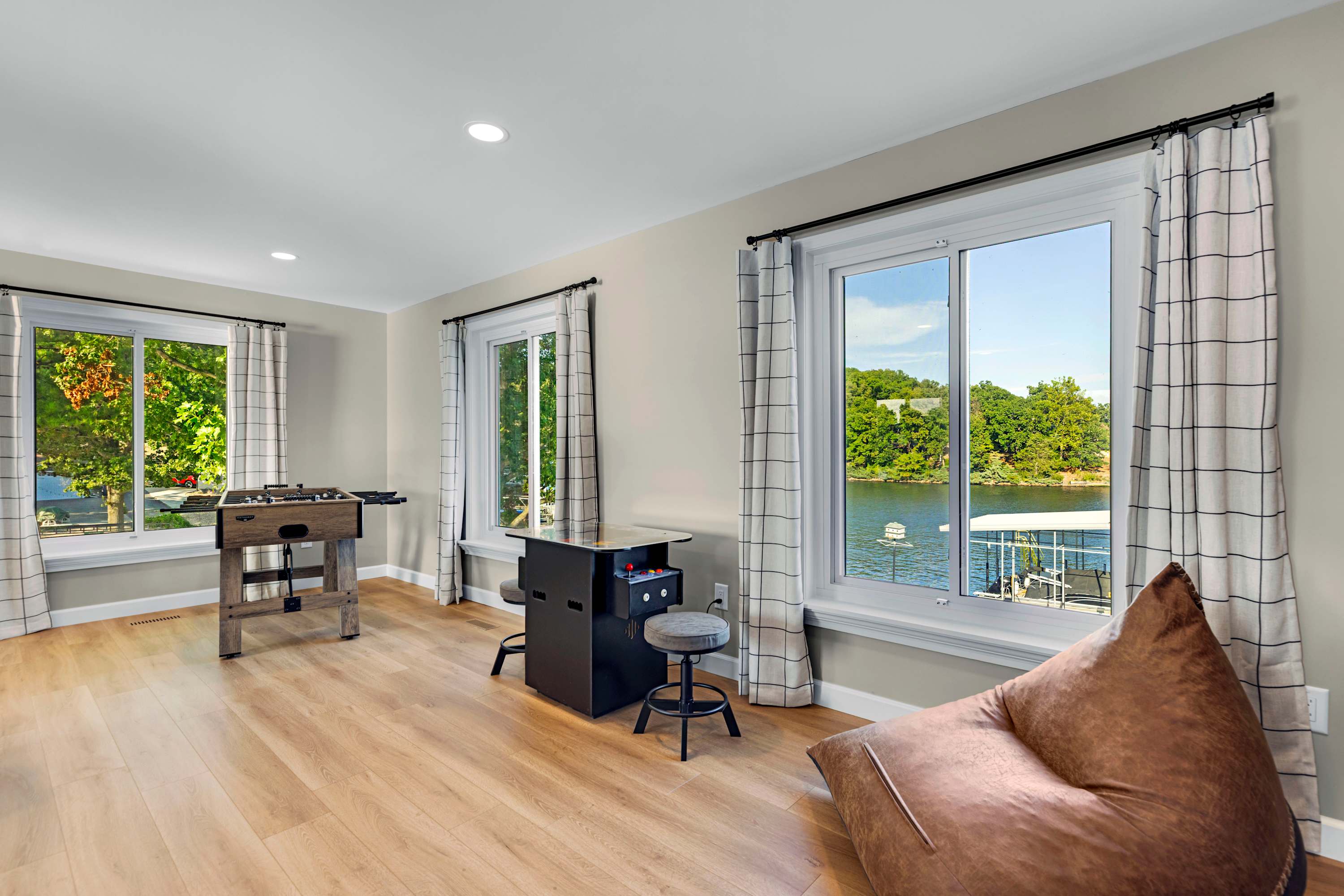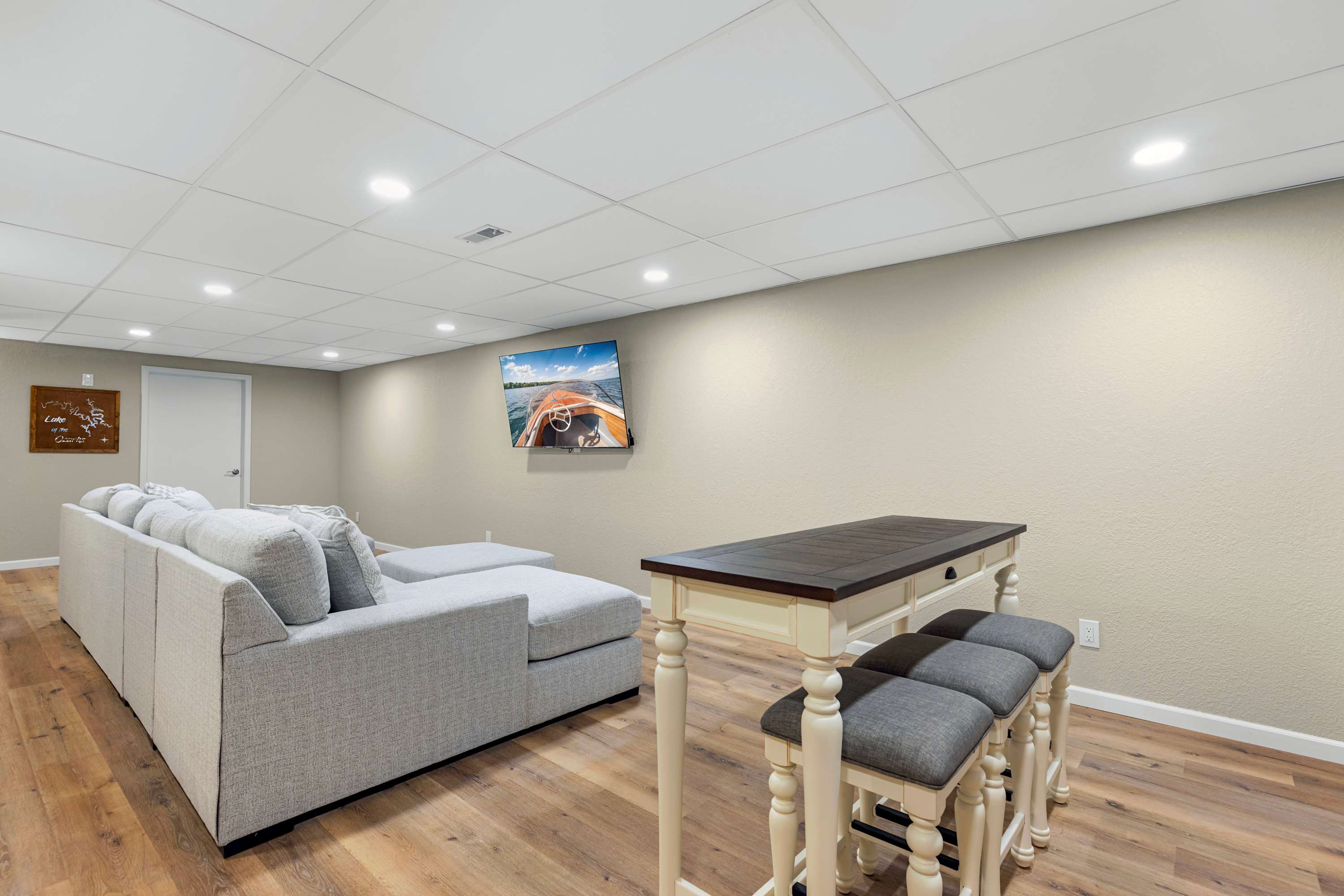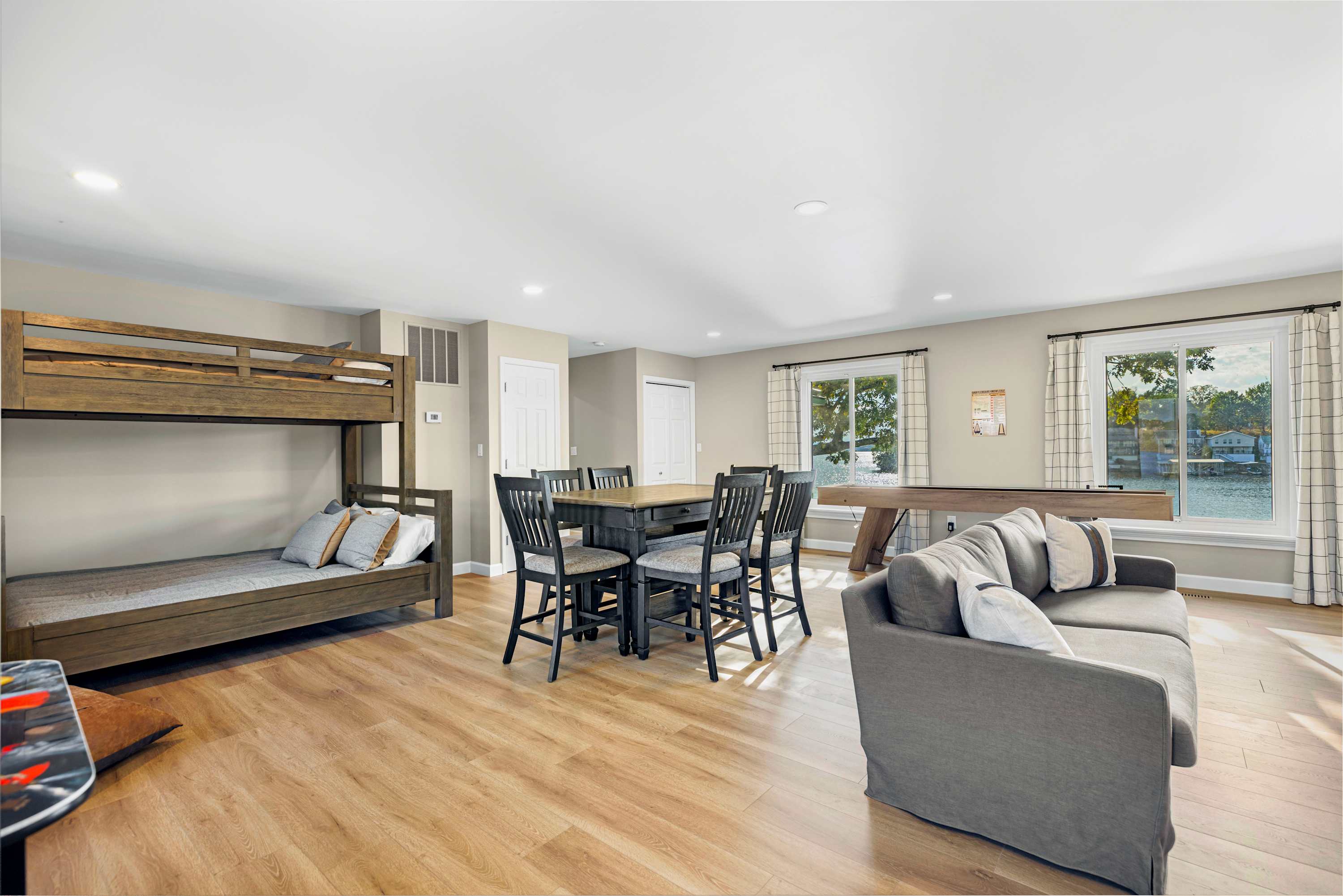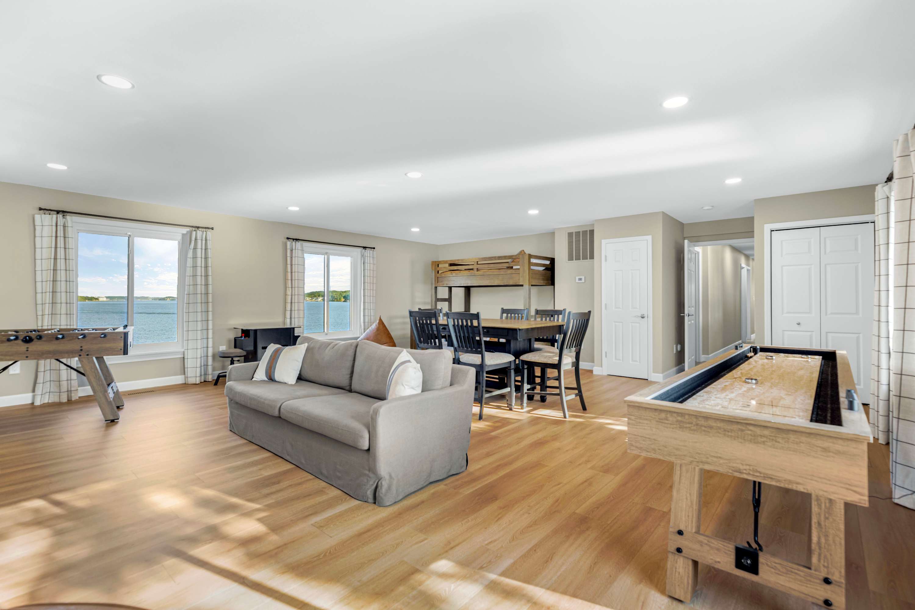 Step inside to a warm, light-filled living room where two cozy couches, a sitting area for two, and a smart TV above the fireplace invite you to unwind after a day on the water. The open-concept kitchen offers plenty of space, complete with stainless steel appliances, both Keurig and drip coffee options, and a charming corner table for six with bench seating. Gather in the formal dining room, where a wet bar and a table for eight set the scene for memorable meals. For even more entertainment, the game room is packed with fun—shuffleboard, foosball, arcade games, board games, a smart TV, and seating for six. A separate basement space with a sectional and smart TV offers another cozy hangout zone.