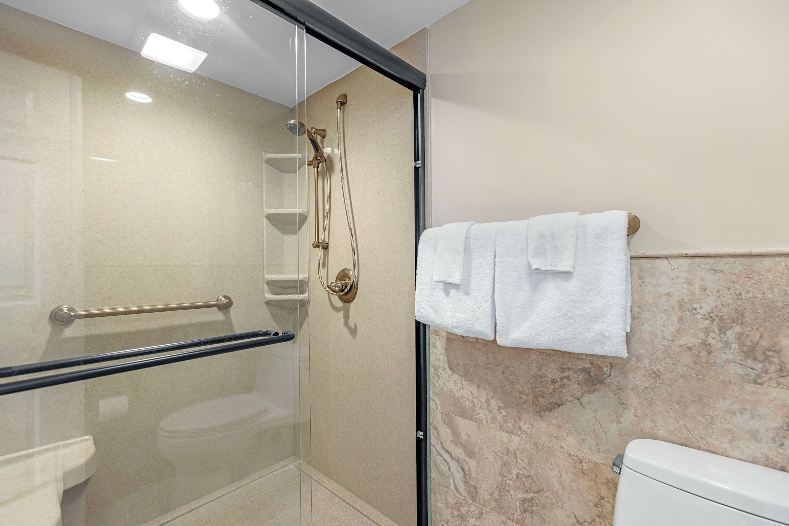 Bedroom #1 includes a king size bed, a smart TV, balcony access and an ensuite bathroom with a dual vanity and a glass walk-in shower.