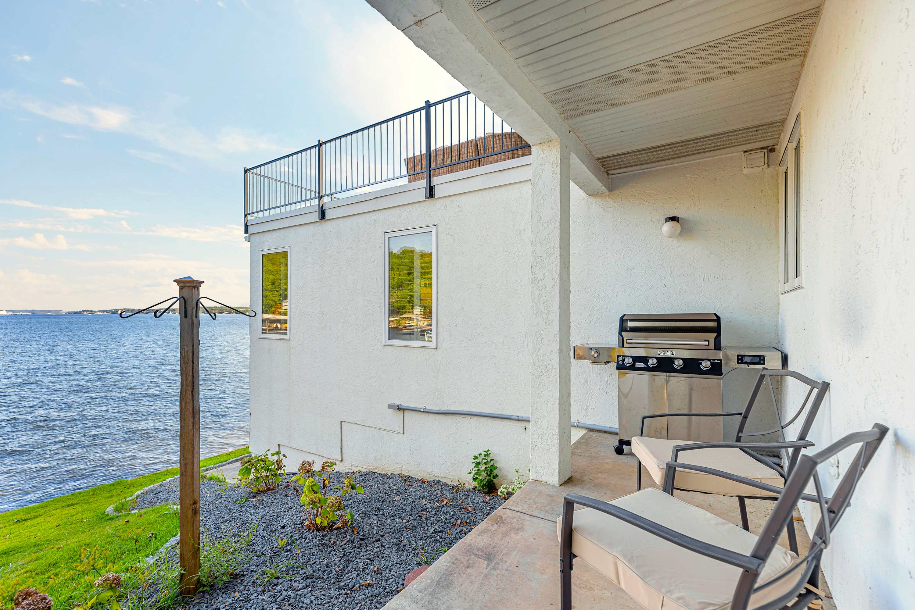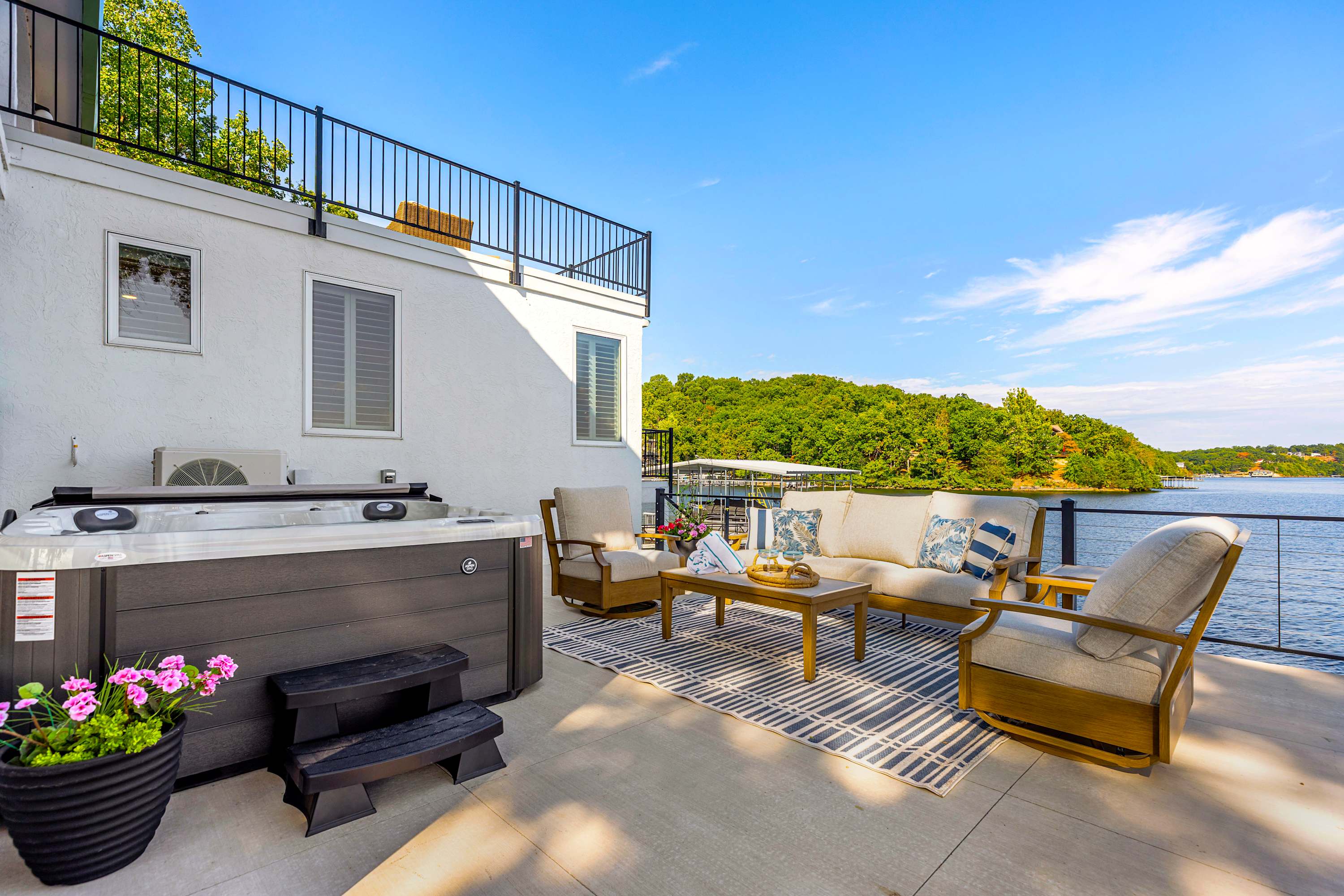 If you need a quiet escape, an upstairs nook with comfy seating for two is the perfect spot to cuddle up for reading or morning coffee. Or make your way outside for a peaceful moment on the spacious balcony offering breathtaking lake views. The lower level furnished patio also hosts a grill and firepit, and even a private pool and hot tub to cool off after a day in the sun. Whether you're here to connect with family or celebrate with friends, this lakefront getaway delivers the full vacation experience—comfort, entertainment, and unforgettable views.
