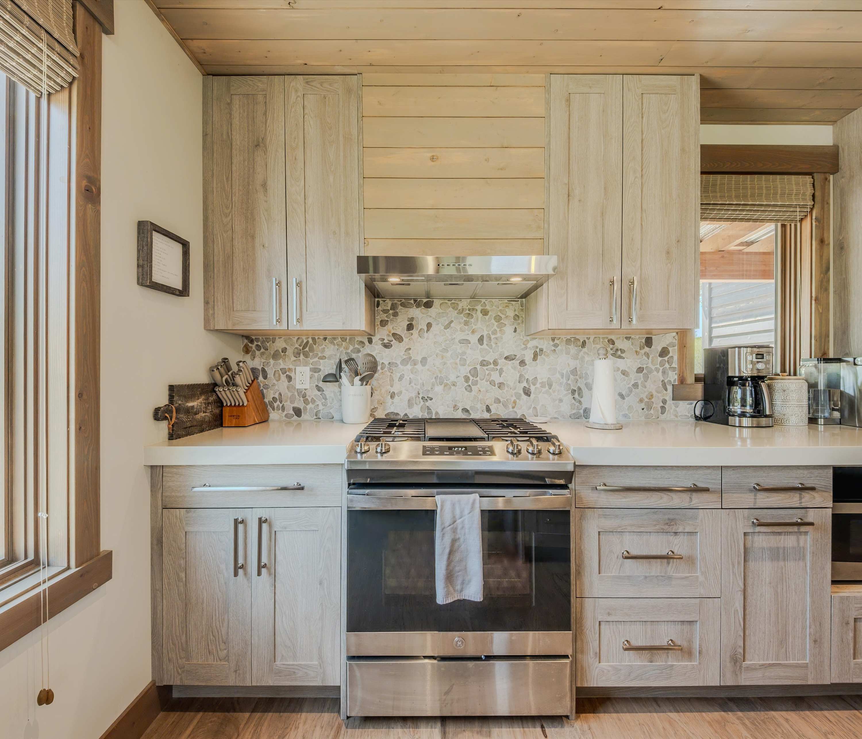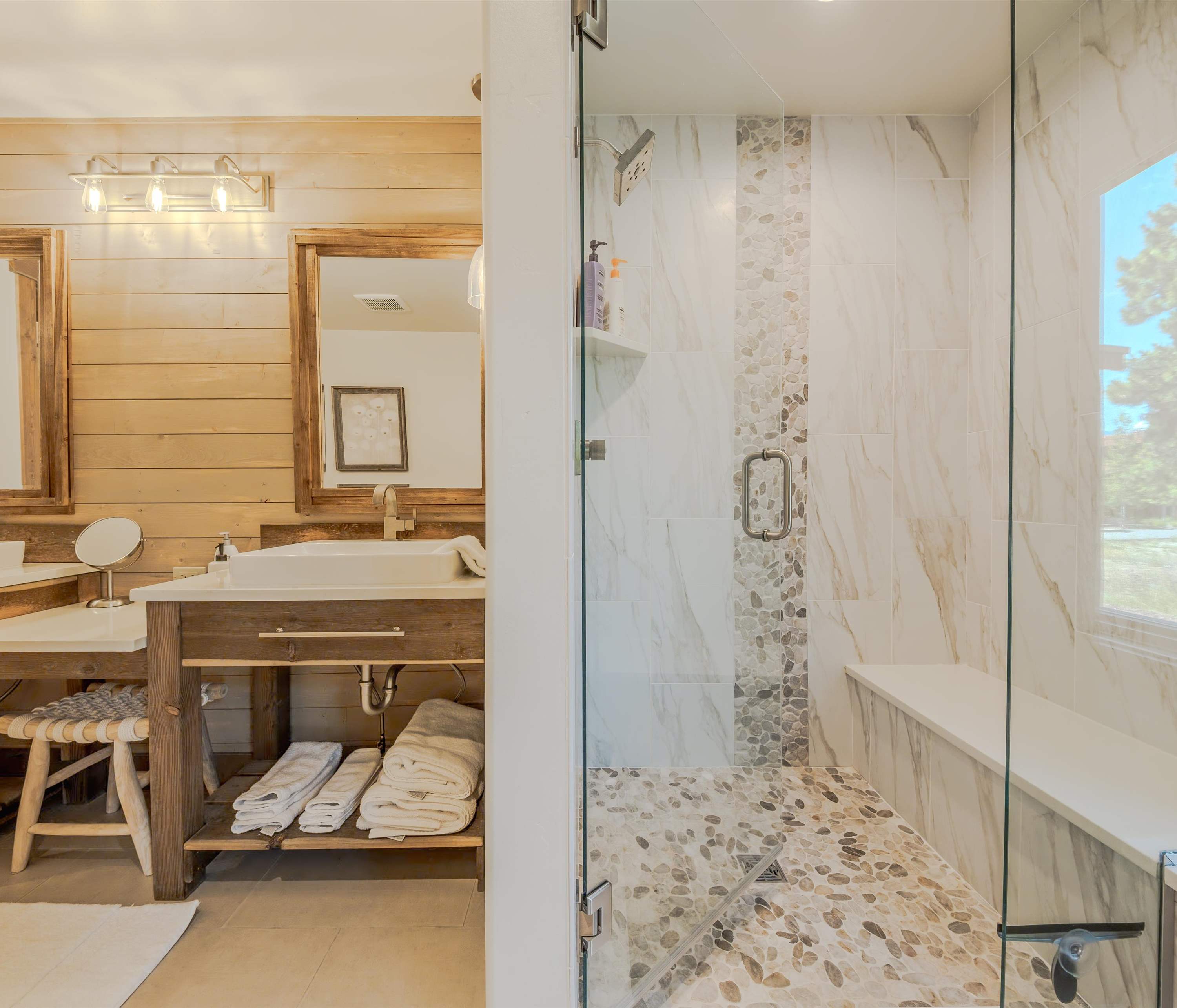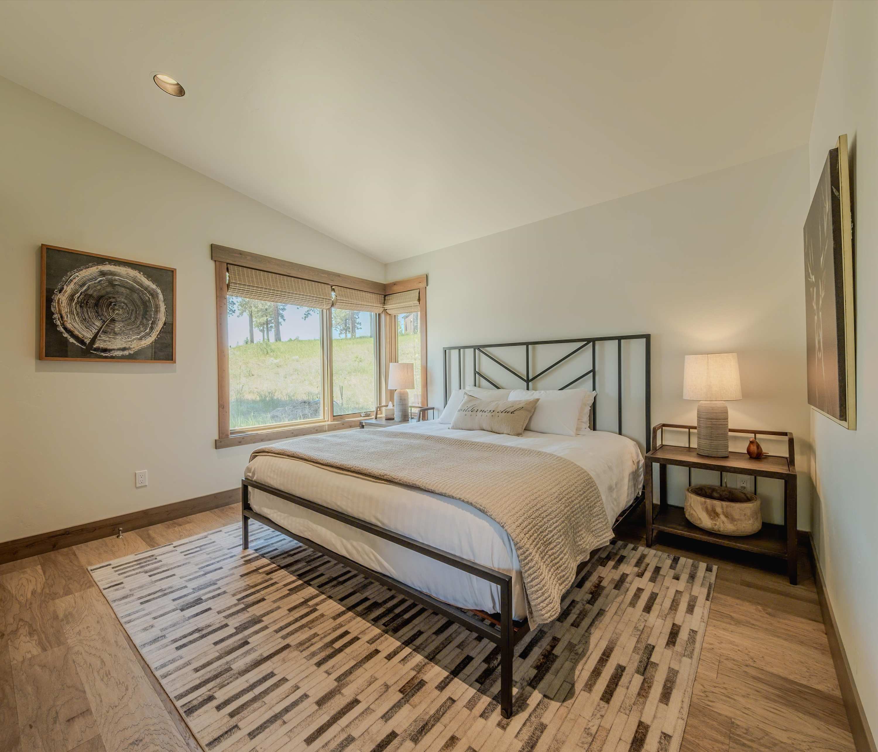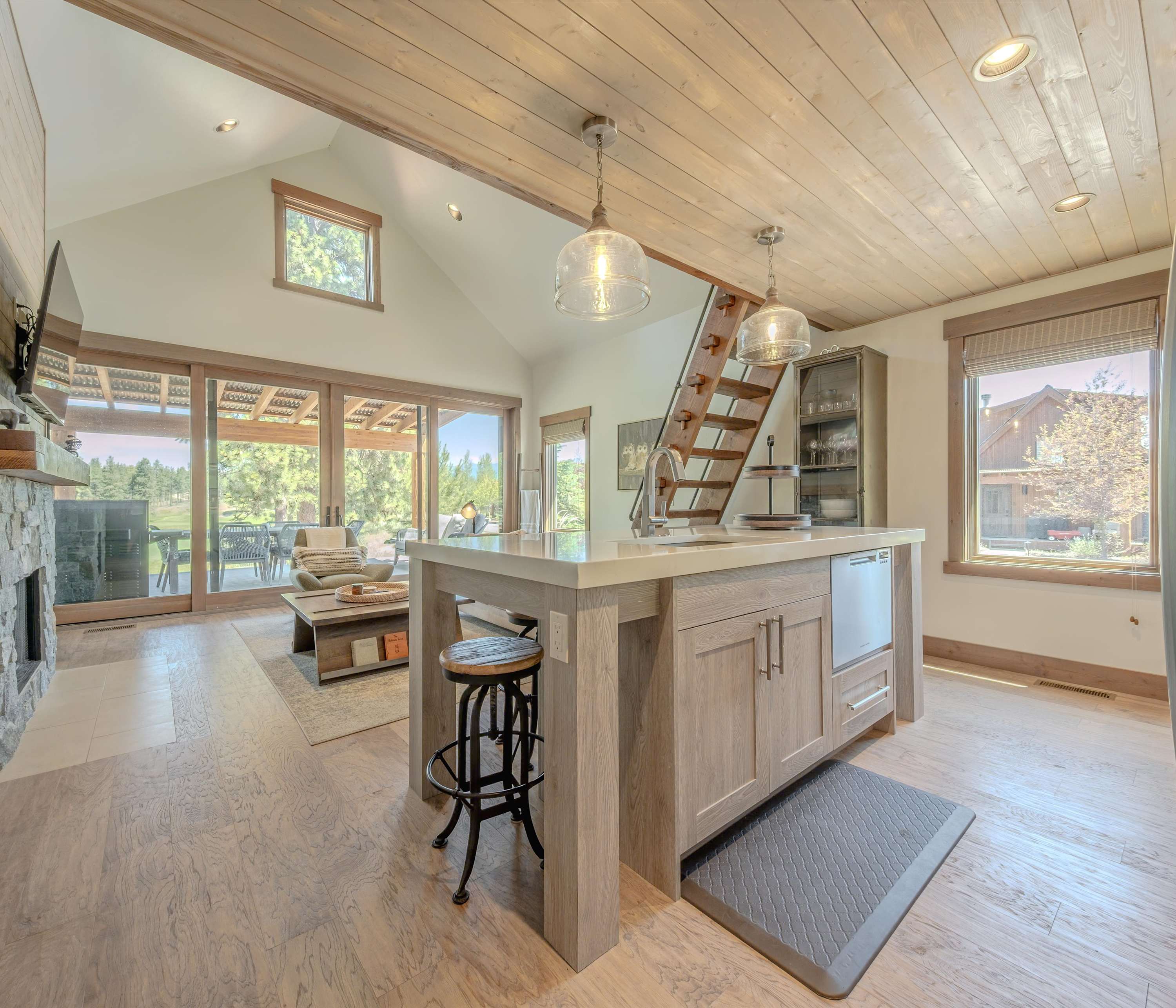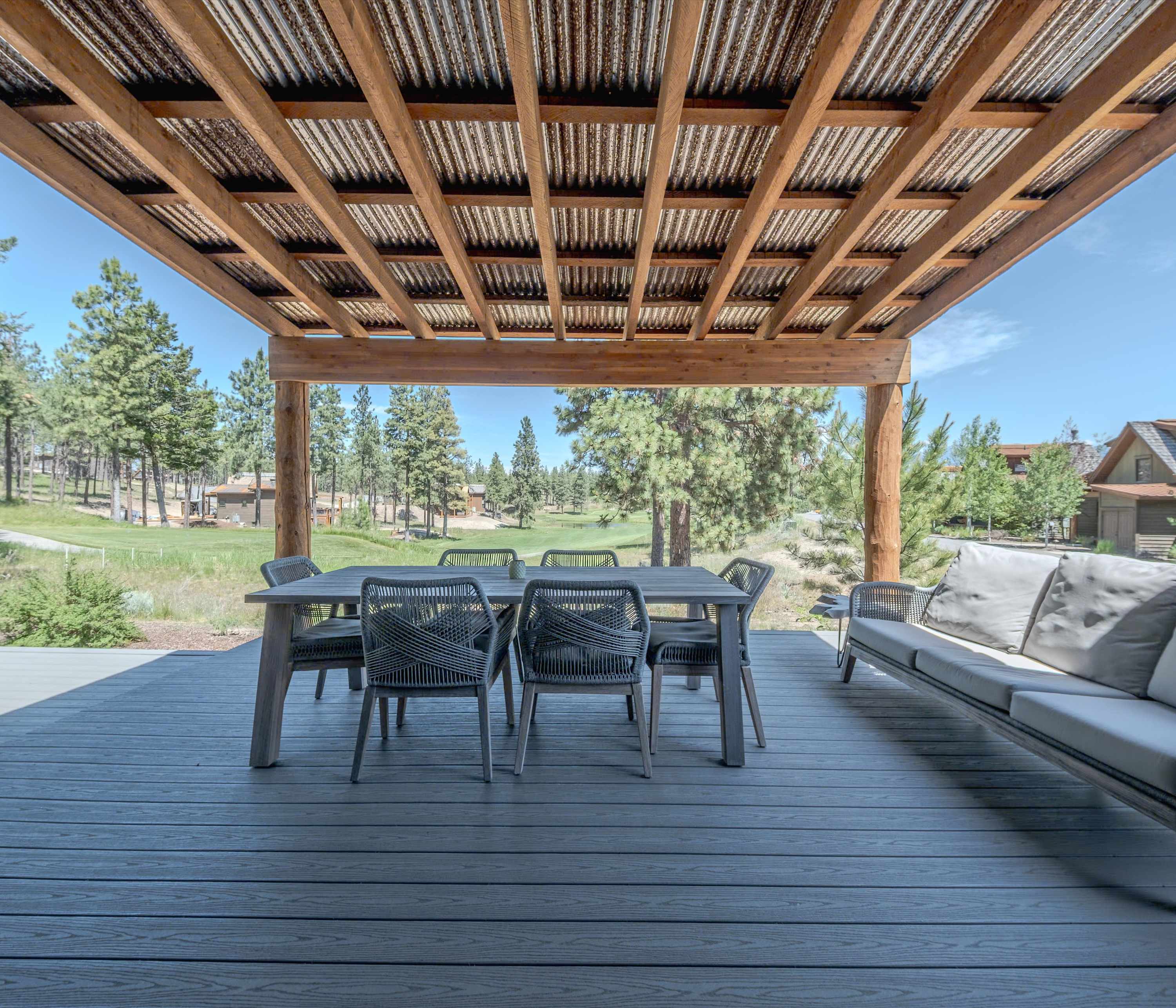 Step inside this rustic-modern retreat to a warm and welcoming living room, where a plush couch, armchair, and fireplace invite you to unwind after a day of exploring. Catch your favorite shows on cable TV or simply relax as the fire crackles in the background. The kitchen blends style and function with light cabinetry, gleaming stone countertops, stainless steel appliances, and counter seating for five—perfect for gathering over breakfast or prepping dinner together. Head outside to the covered deck and take in the fresh Montana air as you enjoy dinner at the table for six, relax on the outdoor couch, or fire up the grill for an evening barbecue. After a day on the trails or golf course, soothe your muscles in the private hot tub under the stars. The yard offers even more magic with a firepit surrounded by open space—ideal for s’mores, stargazing, or late-night storytelling.
