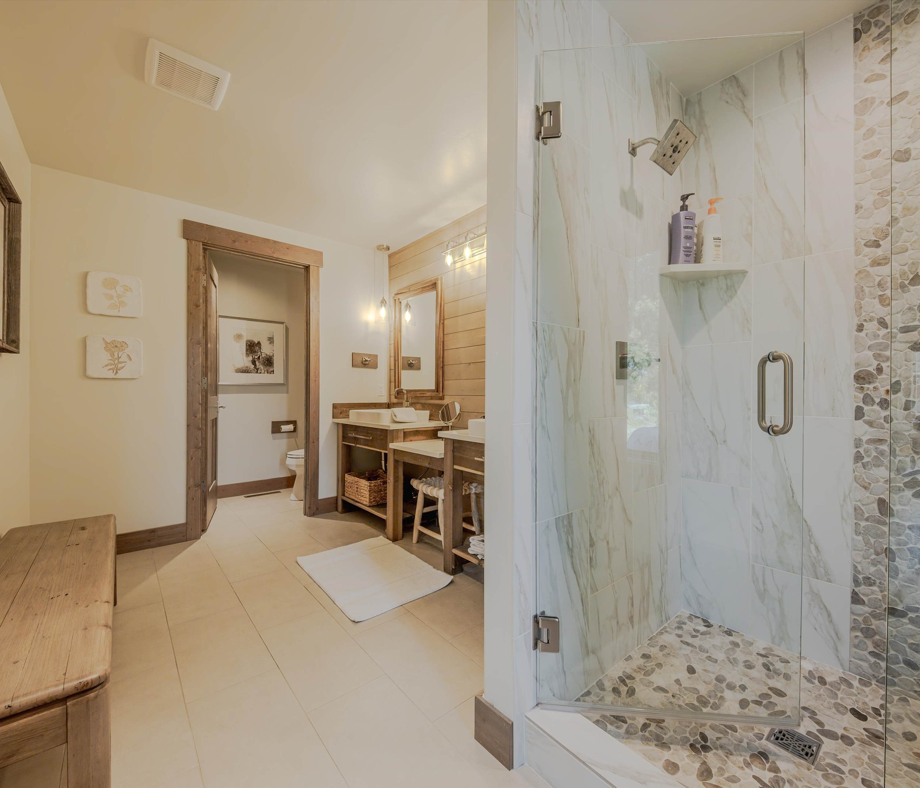 Bedroom #1 includes a king size bed, deck access, and an ensuite bathroom with double vanities and a walk-in shower.
