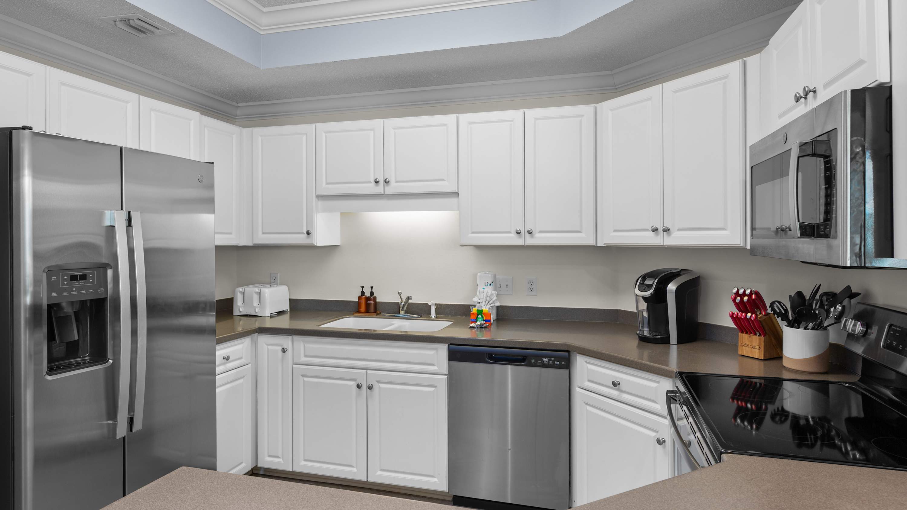This snack zone is tucked away just behind the dining area. You’ve got an extra ice maker, counter space, and tons of extra little cabinets. It makes a great grab-and-go snack and drink station, but we also know you’ve all got that one bag of chips that you want to label “KEEP OFF.” Consider the wet bar your own secret cache for all of your essential vacay snacks!