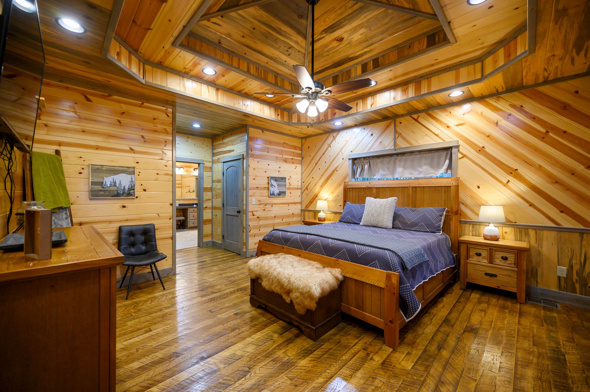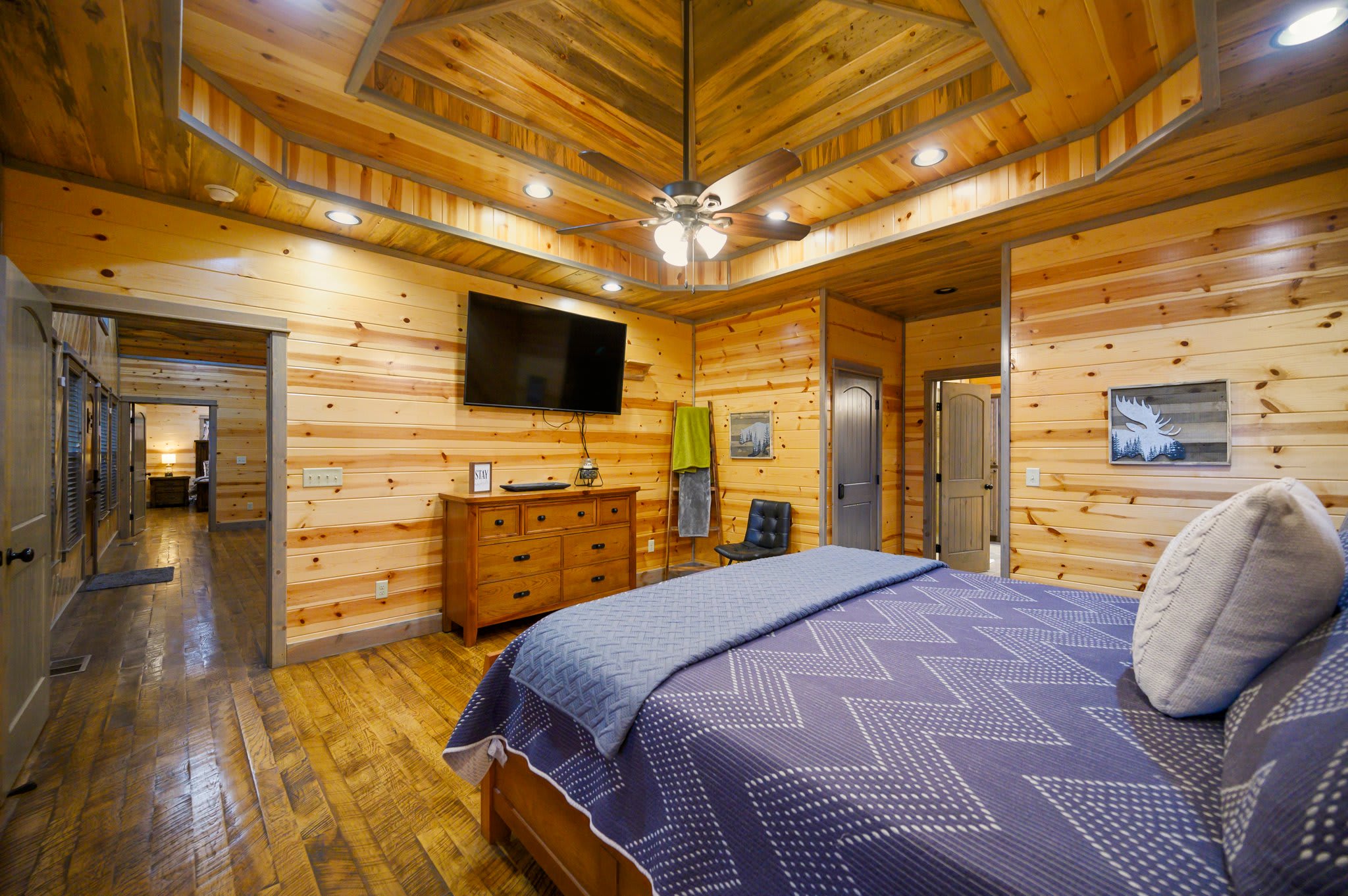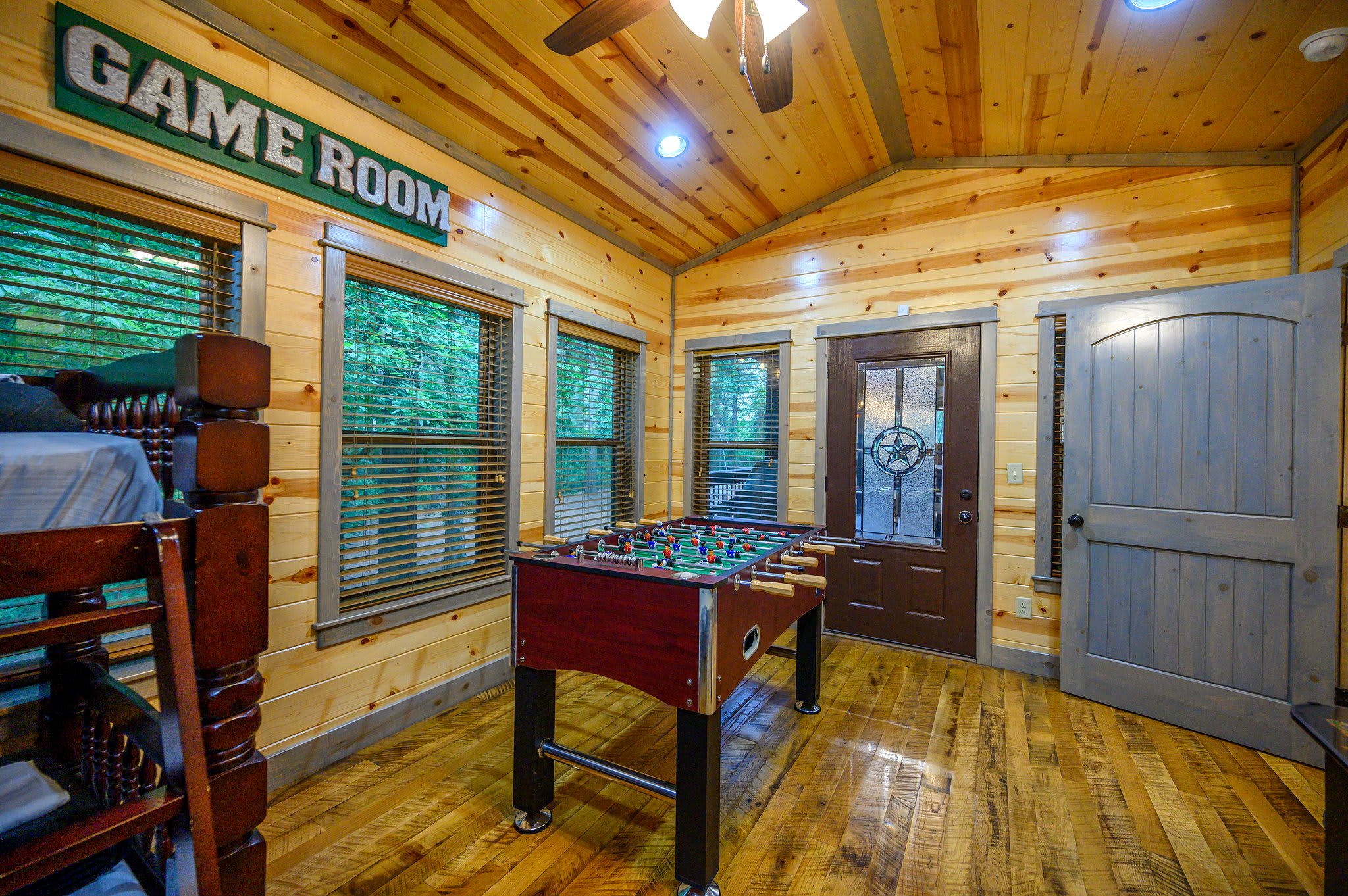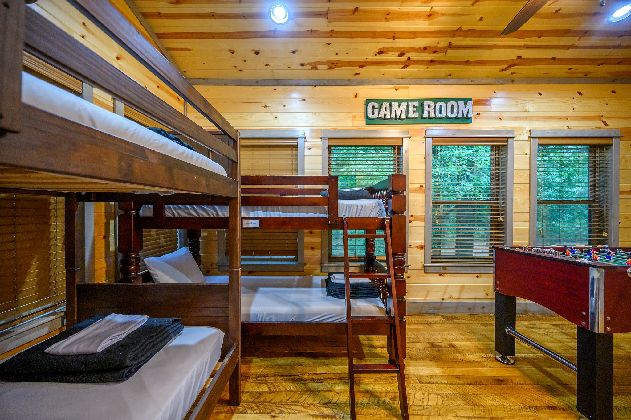Bedroom #4 doubles as a game room and includes 2 sets of twin-over-twin bunk beds, a smart TV, and deck access.