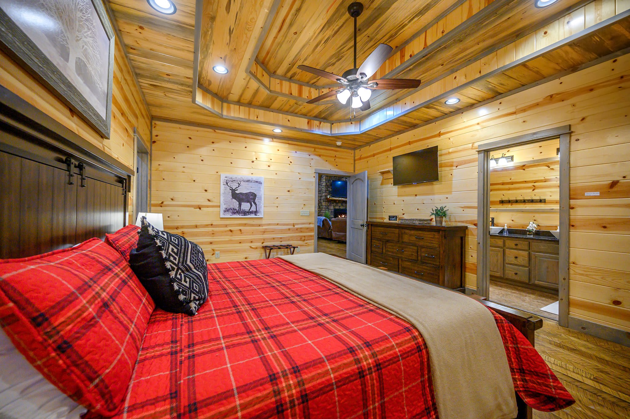 Bedroom #3 includes a king size bed, a smart TV, and an ensuite bathroom with a dual vanity and a walk-in shower.