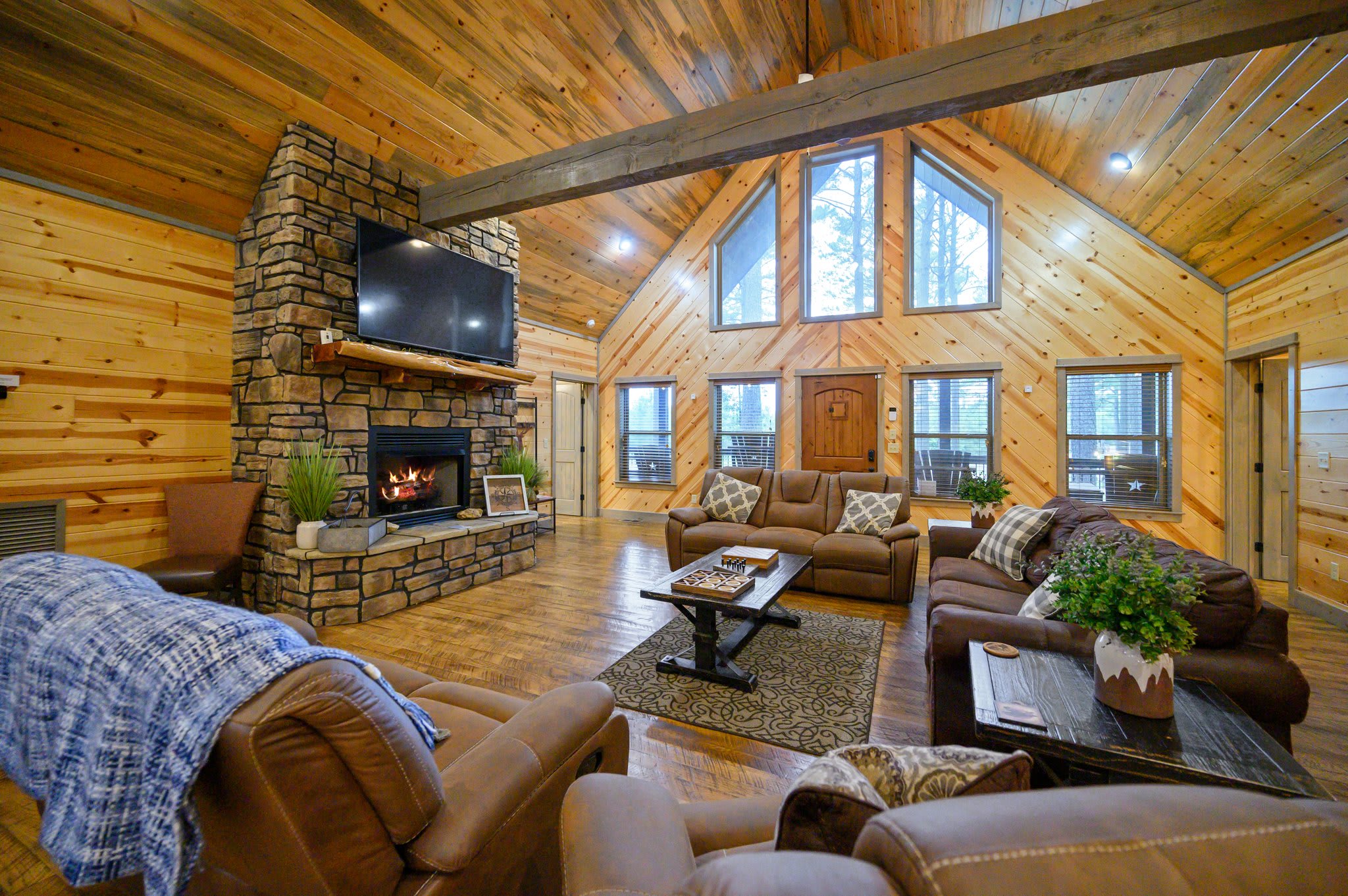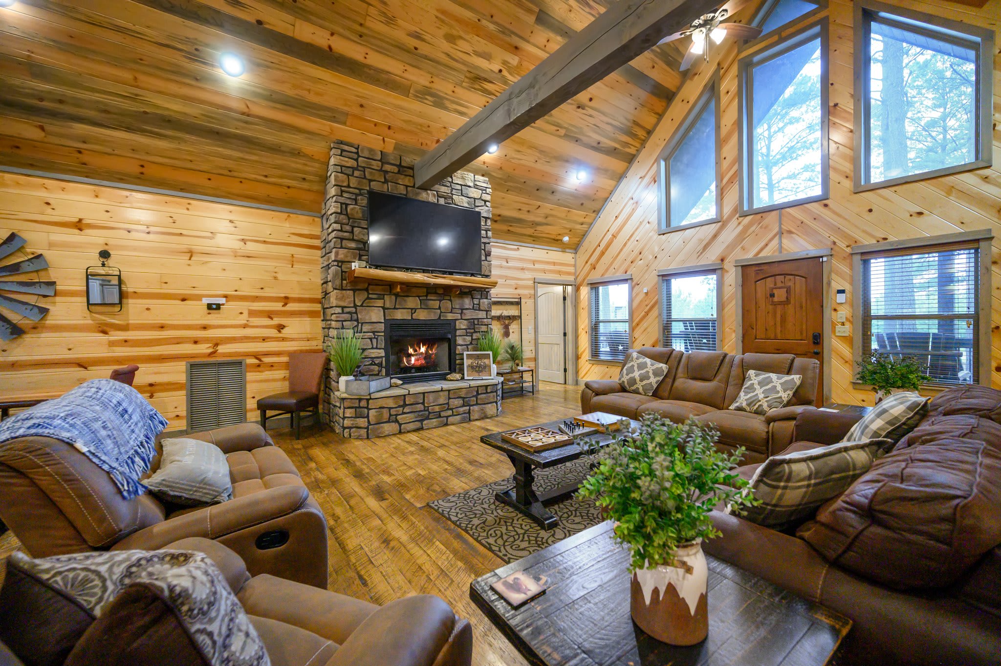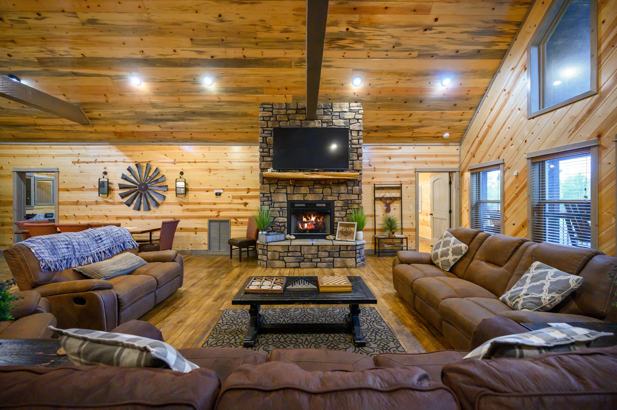 In the living room, you'll find two plush sofas, a love seat, and a recliner arranged around a large gas fireplace, all accented with charming rustic farmhouse décor. Just off the main space, the game room doubles as a bunk room and keeps everyone entertained with a foosball table, retro sit-down arcade machine, and a full collection of board games. This room also leads directly to the back deck—an outdoor hangout complete with cornhole, a bubbling hot tub, gas grill, and a dining table for six.
