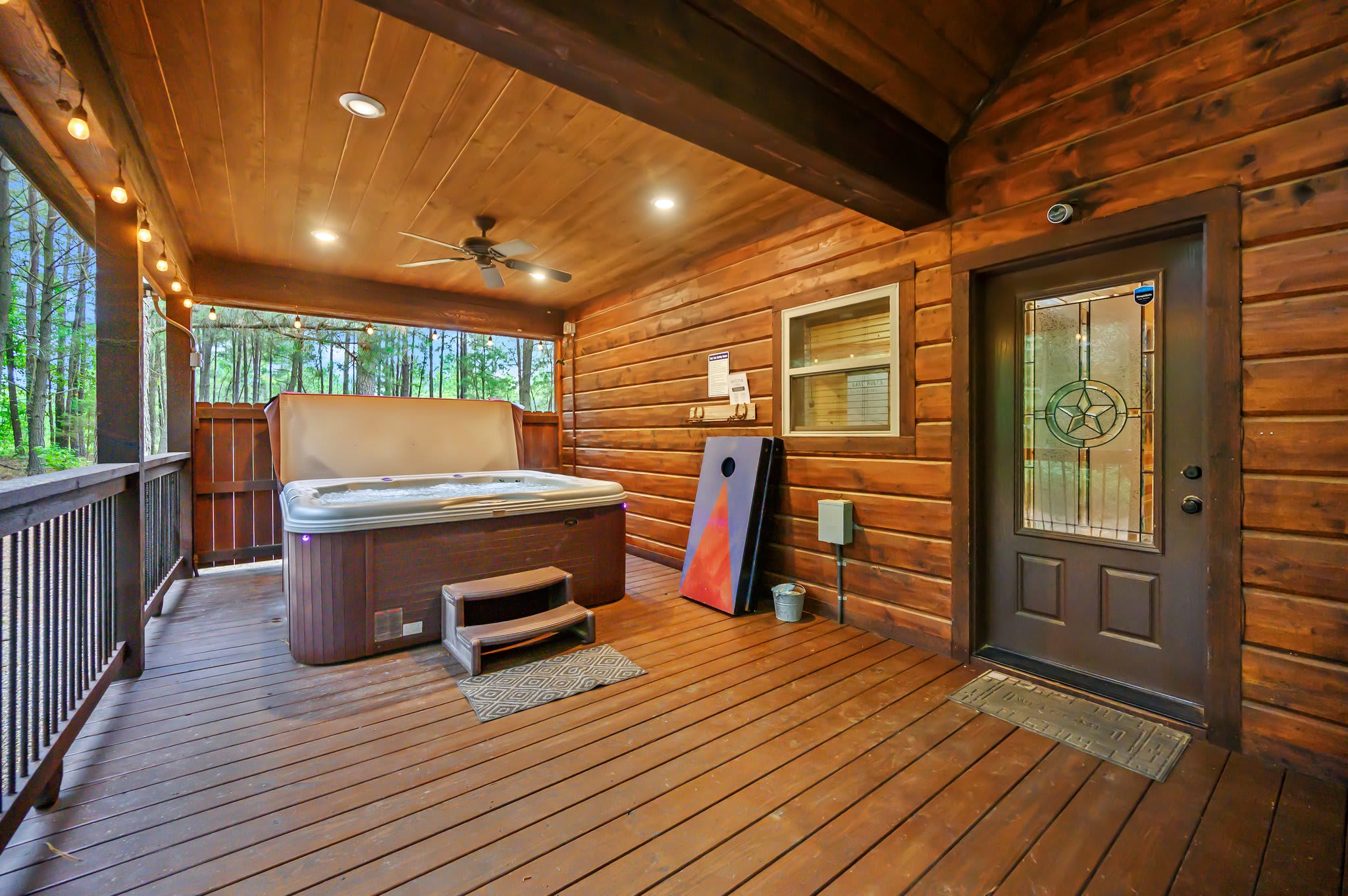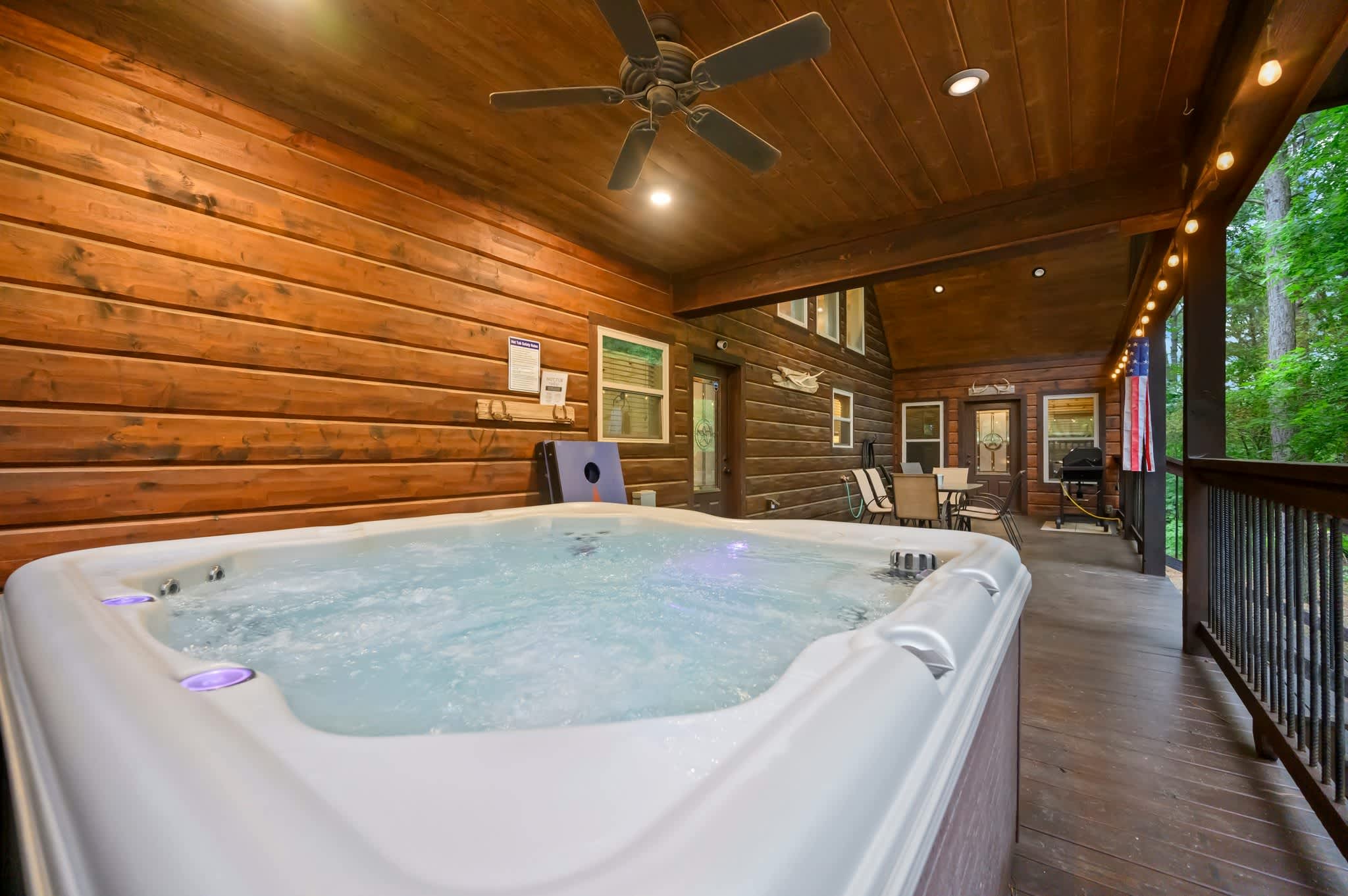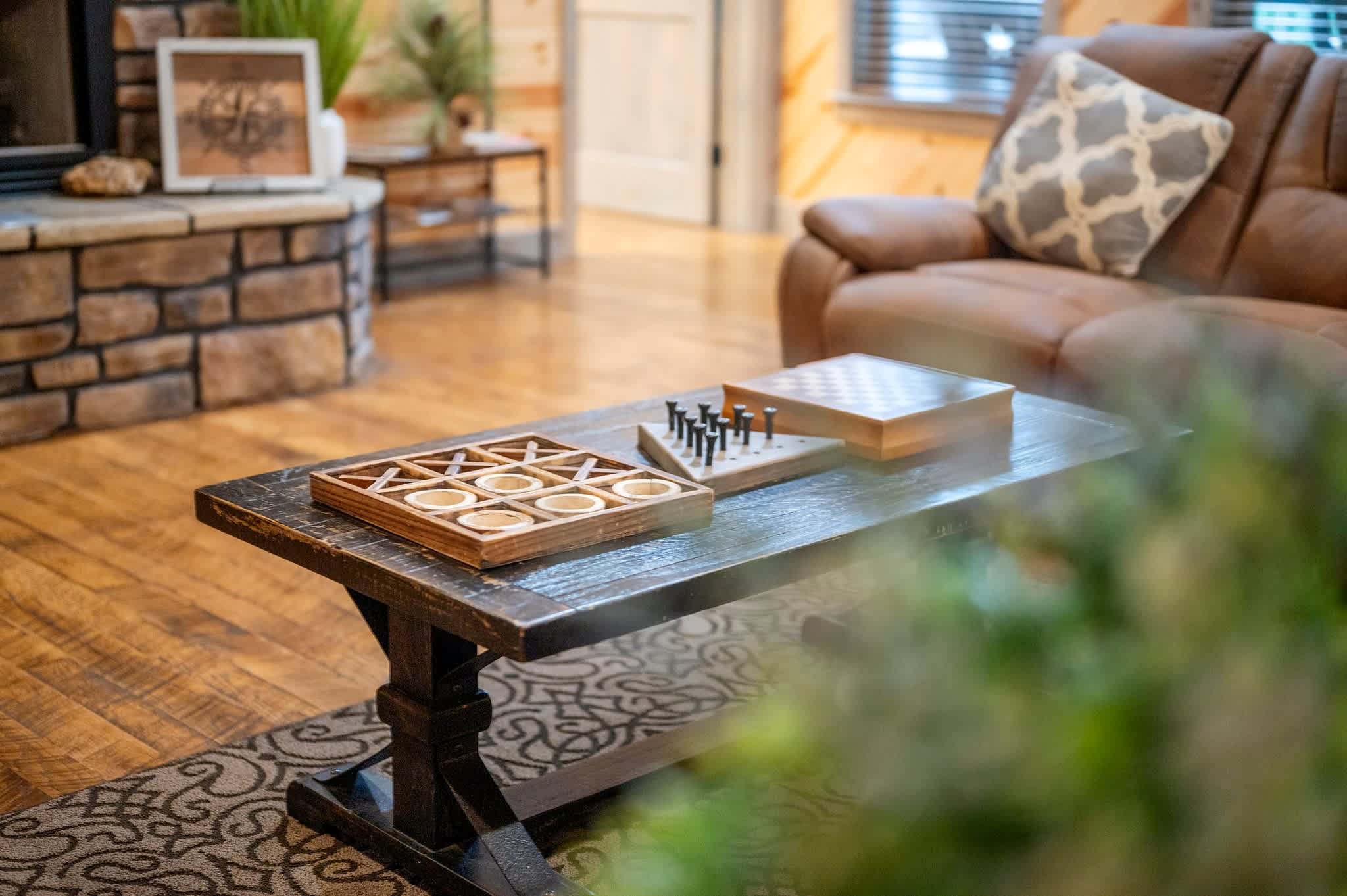 In the living room, you'll find two plush sofas, a love seat, and a recliner arranged around a large gas fireplace, all accented with charming rustic farmhouse décor. Just off the main space, the game room doubles as a bunk room and keeps everyone entertained with a foosball table, retro sit-down arcade machine, and a full collection of board games. This room also leads directly to the back deck—an outdoor hangout complete with cornhole, a bubbling hot tub, gas grill, and a dining table for six.