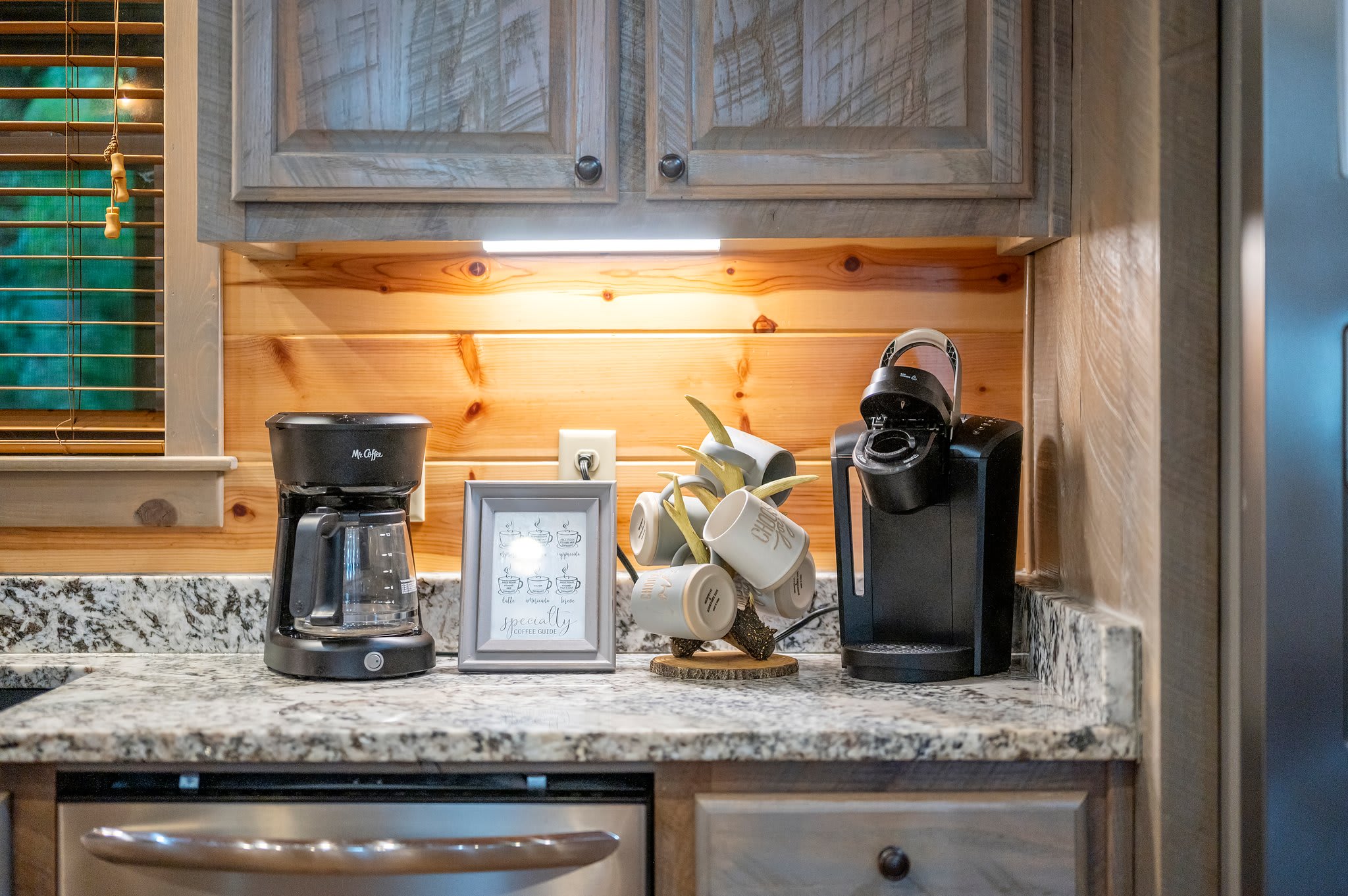 Step onto the welcoming front deck, where plenty of cozy seating invites morning coffee chats or sunset cocktails. Inside, you're greeted by soaring peaked ceilings and a massive open-concept living area that’s as comfortable as it is striking. The heart of the home is the kitchen—complete with a large island, sleek black-and-white granite countertops, gray-washed oak cabinets, and both traditional and Keurig coffee makers. Three counter stools make it easy to gather while cooking, and the nearby dining table comfortably seats eight for shared meals and laughter.