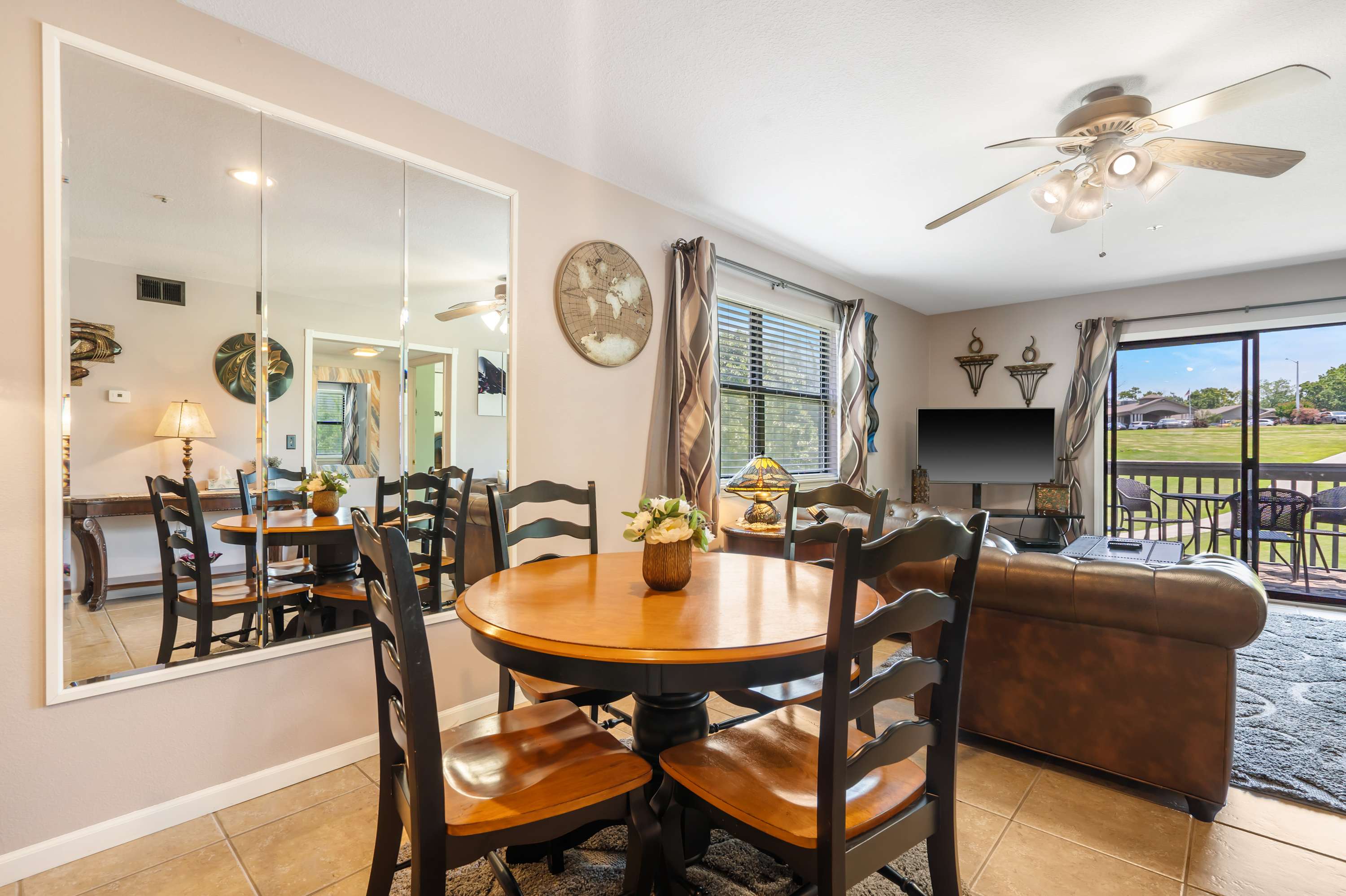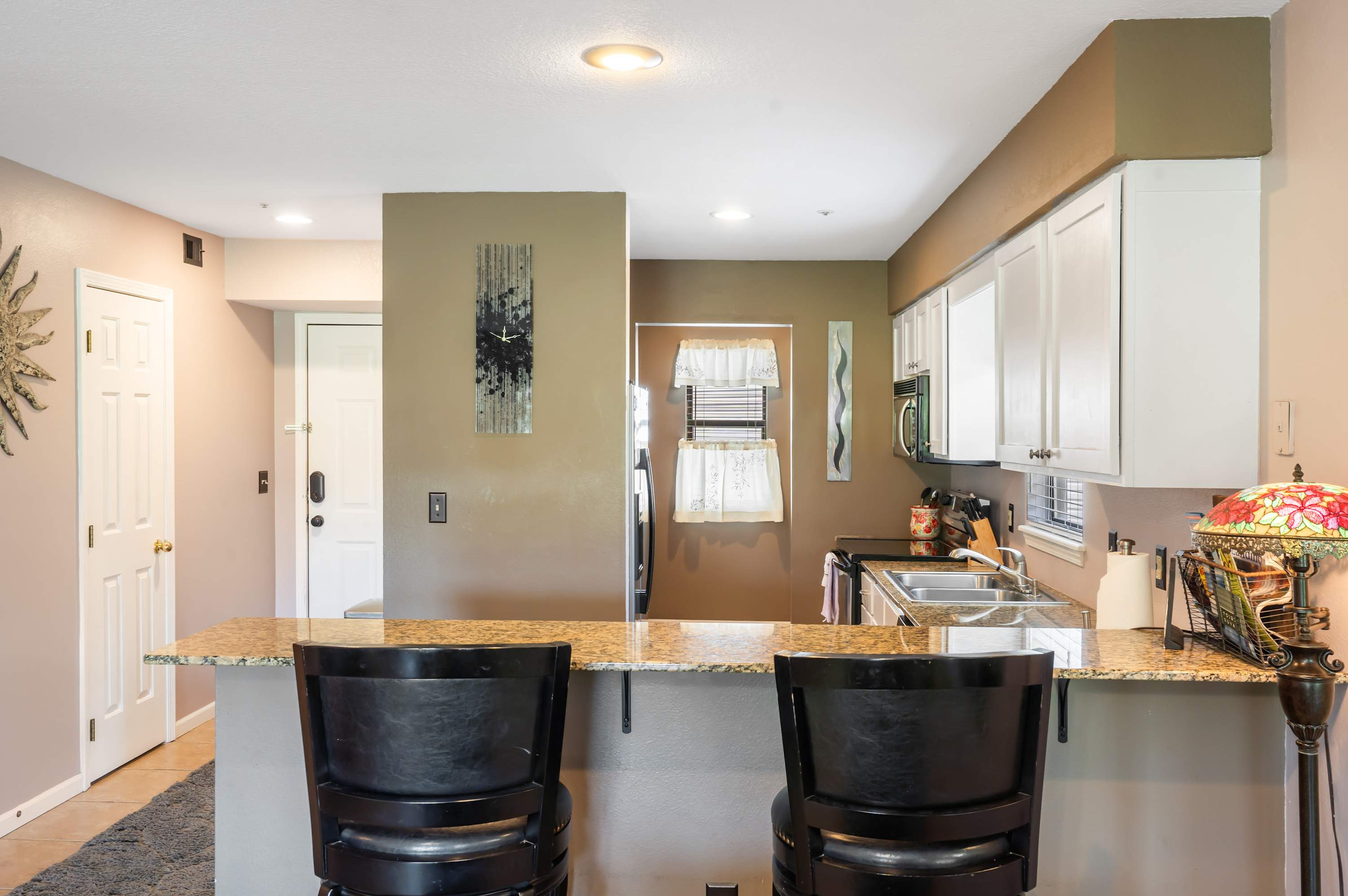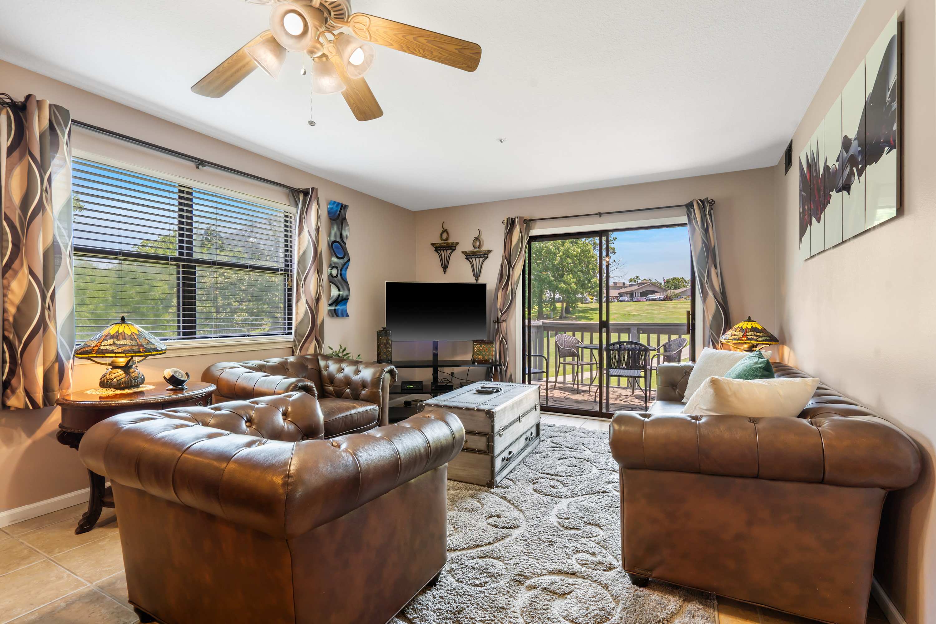 Step inside The Tee Shot and feel instantly at home. The kitchen is both sleek and functional, with white cabinets, stone countertops, and stainless steel appliances. Whether you prefer a fresh drip coffee or a quick Keurig brew, your morning routine is covered. Pull up a stool at the counter seating for two or gather at the dining table for four to enjoy a meal together. The living room invites you to unwind with its cozy couch, two armchairs, and smart TV—perfect for movie nights or lazy afternoons. Sliding glass doors lead to a private balcony, where a dining table for four lets you savor meals outdoors while soaking up sweeping views of the lush fairways.