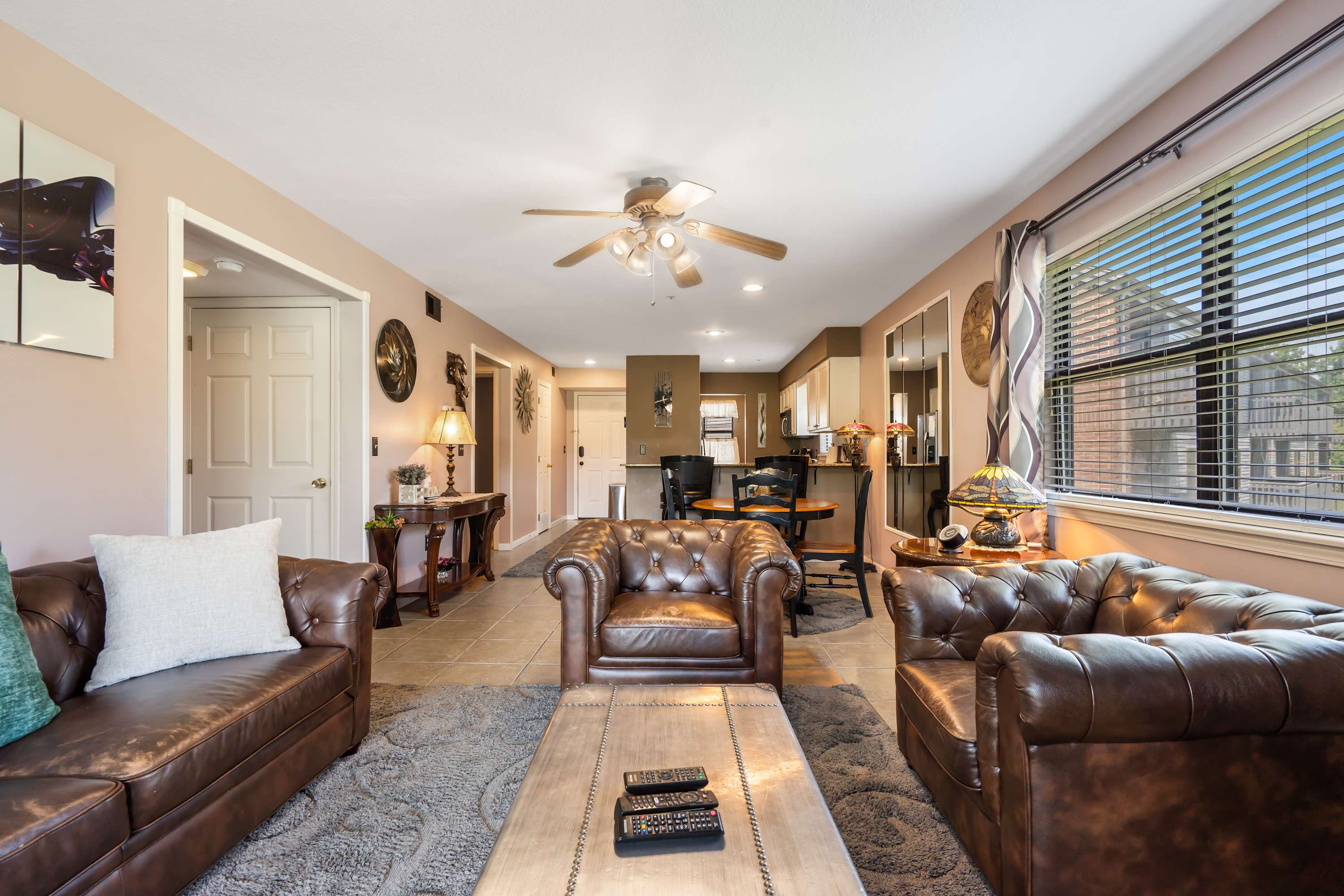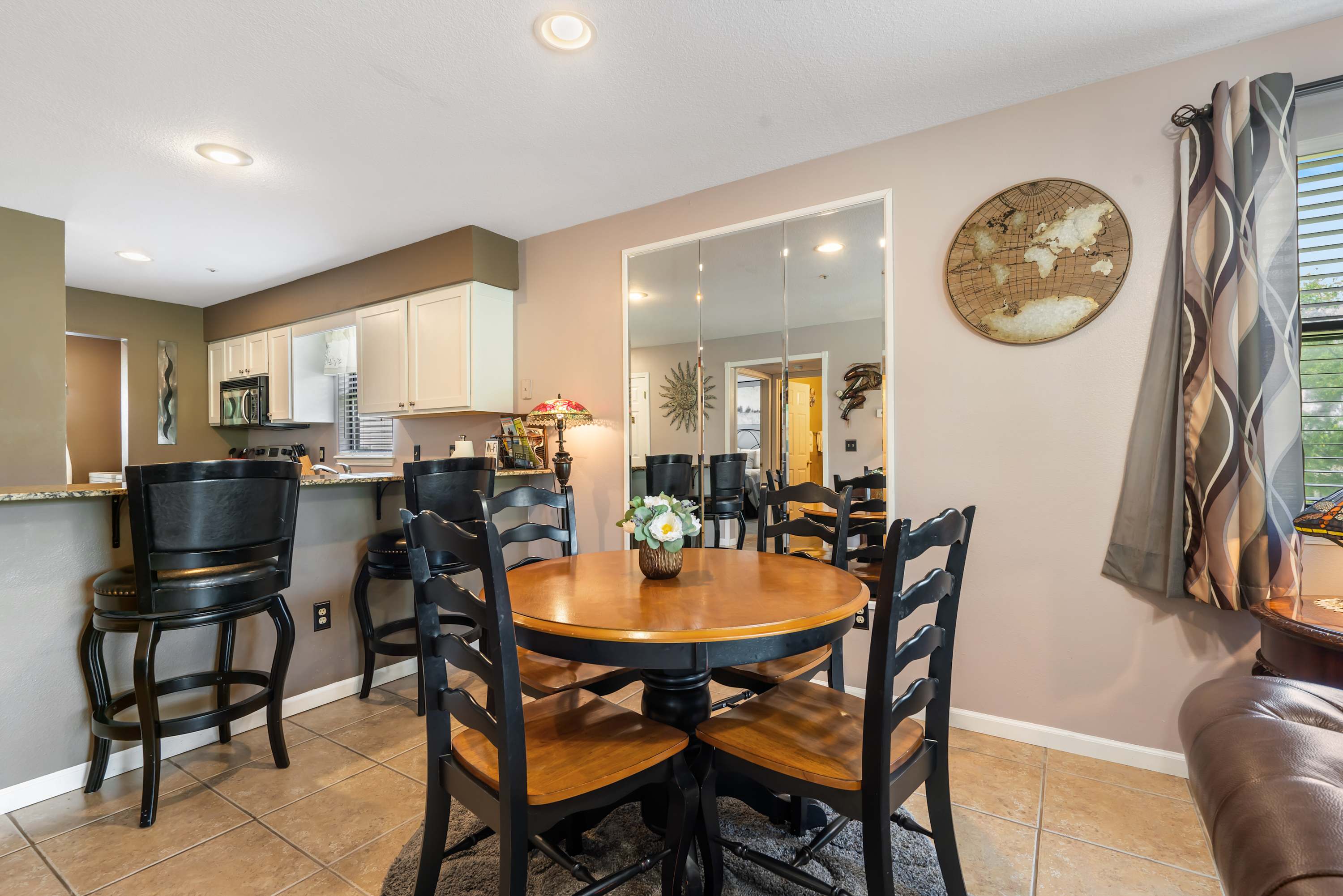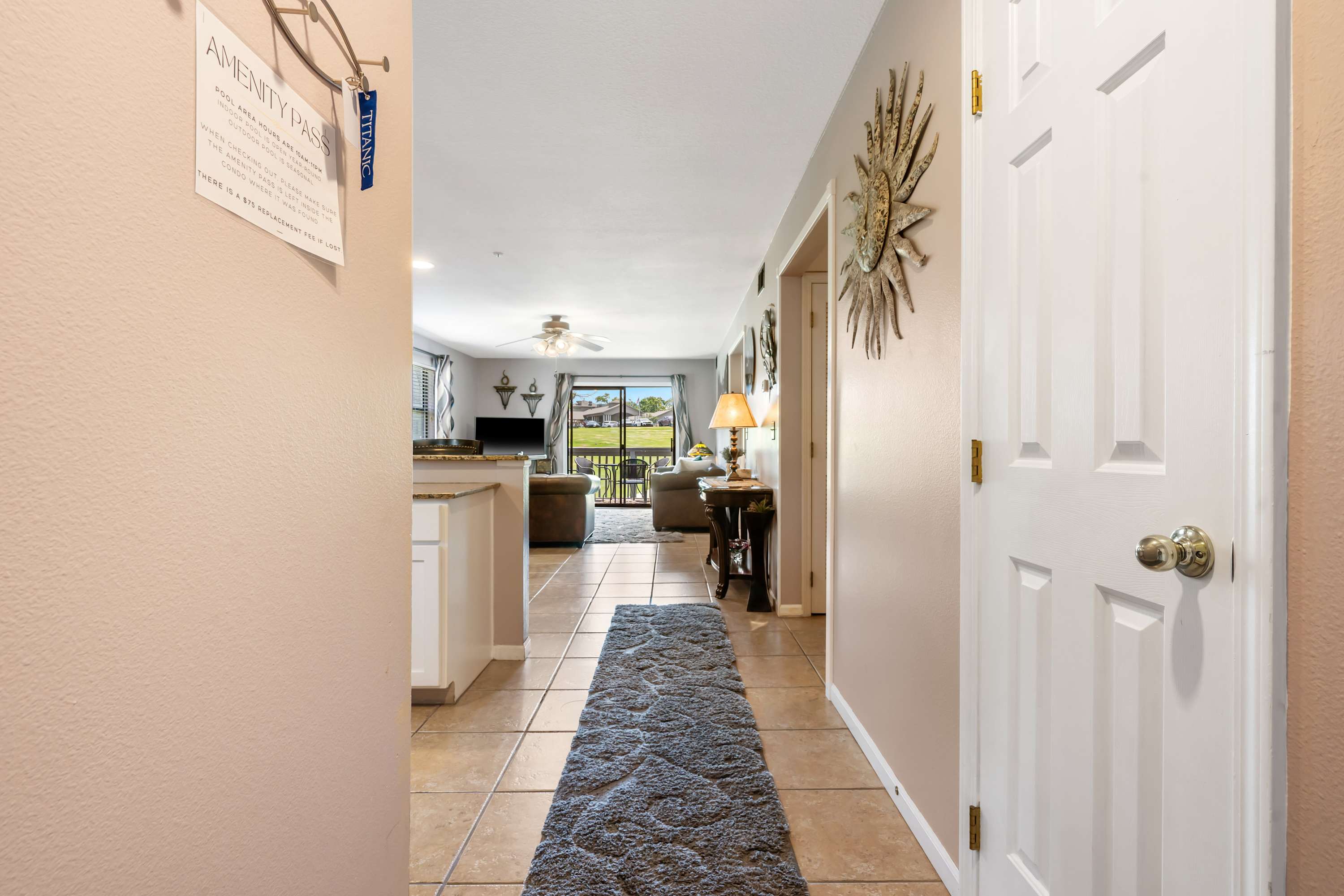 Step inside The Tee Shot and feel instantly at home. The kitchen is both sleek and functional, with white cabinets, stone countertops, and stainless steel appliances. Whether you prefer a fresh drip coffee or a quick Keurig brew, your morning routine is covered. Pull up a stool at the counter seating for two or gather at the dining table for four to enjoy a meal together. The living room invites you to unwind with its cozy couch, two armchairs, and smart TV—perfect for movie nights or lazy afternoons. Sliding glass doors lead to a private balcony, where a dining table for four lets you savor meals outdoors while soaking up sweeping views of the lush fairways.