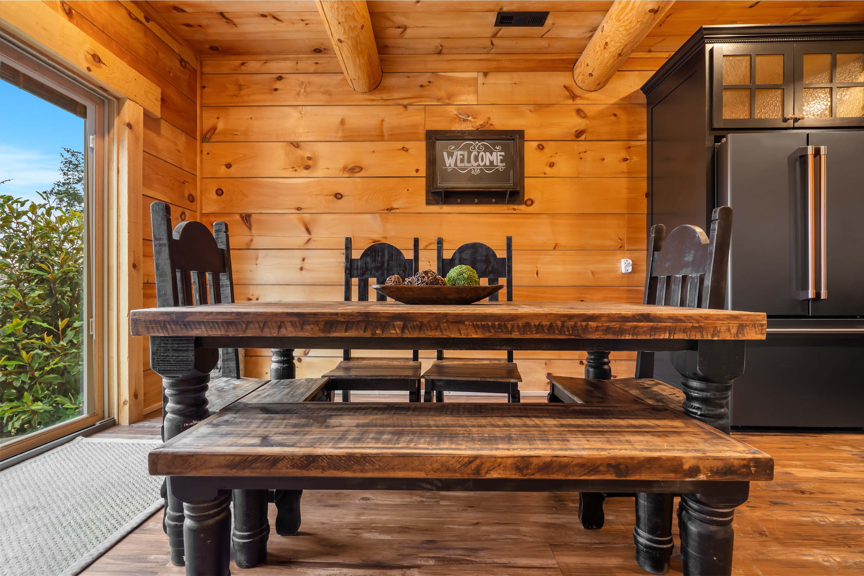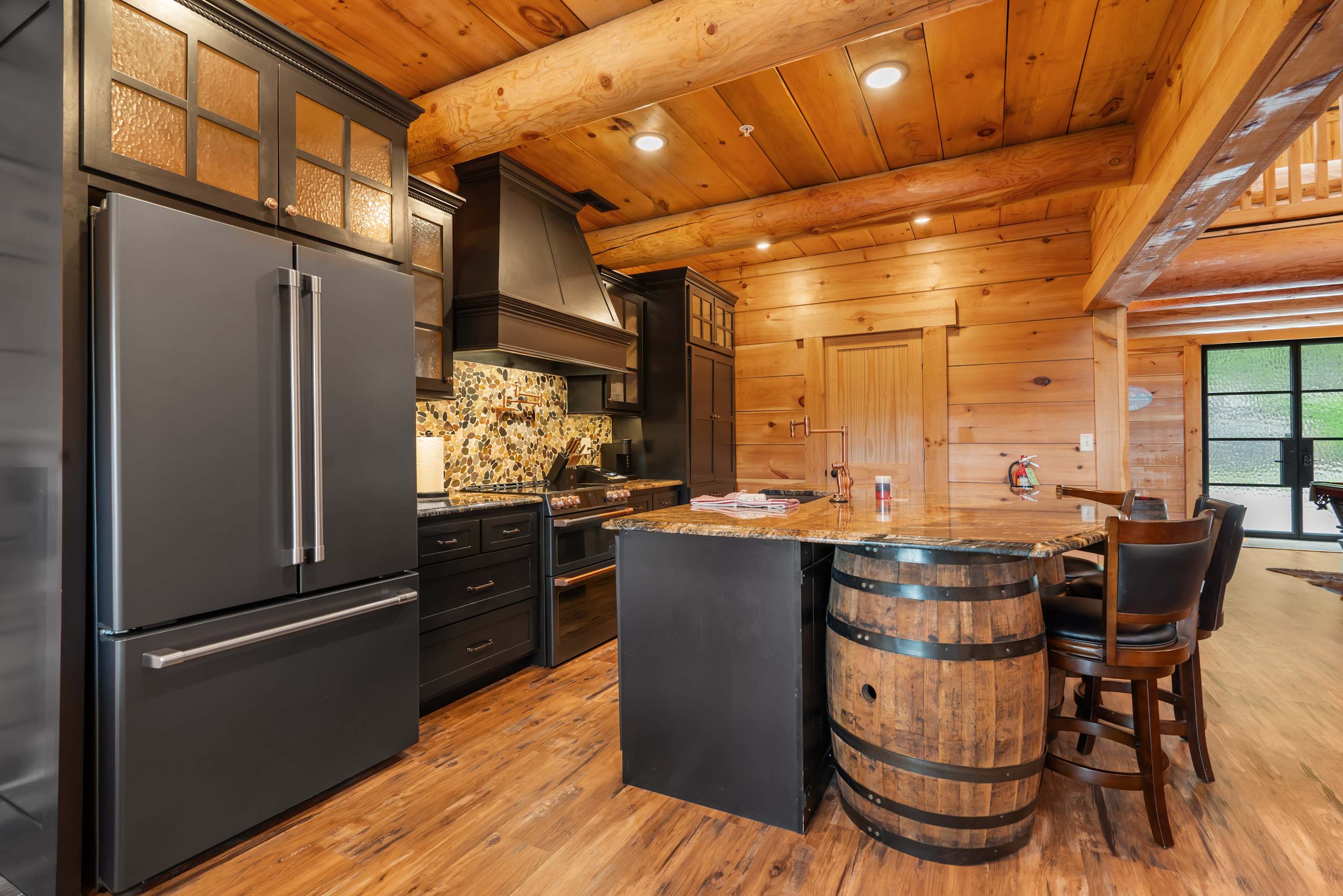 For larger gatherings or evening hangouts, Buffalo Lodge (#154) delivers with style and space. Towering ceilings and massive windows flood the home with natural light and frame incredible natural views. The living room is designed for comfort with plush seating and a fireplace, while the adjacent pool table adds a fun, social touch. Cook with ease in the fully equipped kitchen featuring dark cabinetry, stone counters, and counter seating for three, then gather at the dining table for six or move outside to the spacious patio for grilling, lounging, and soaking in the hot tub.