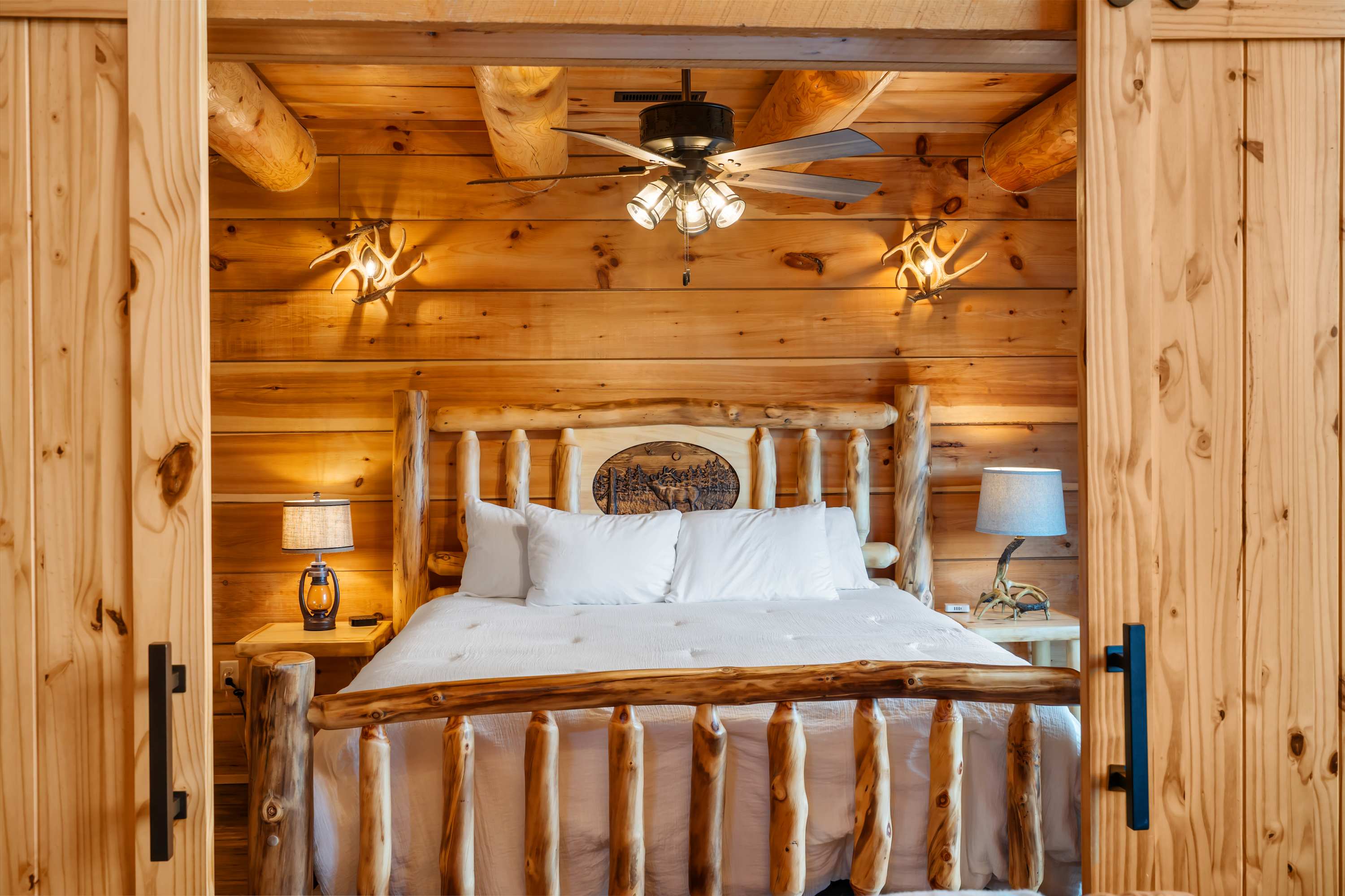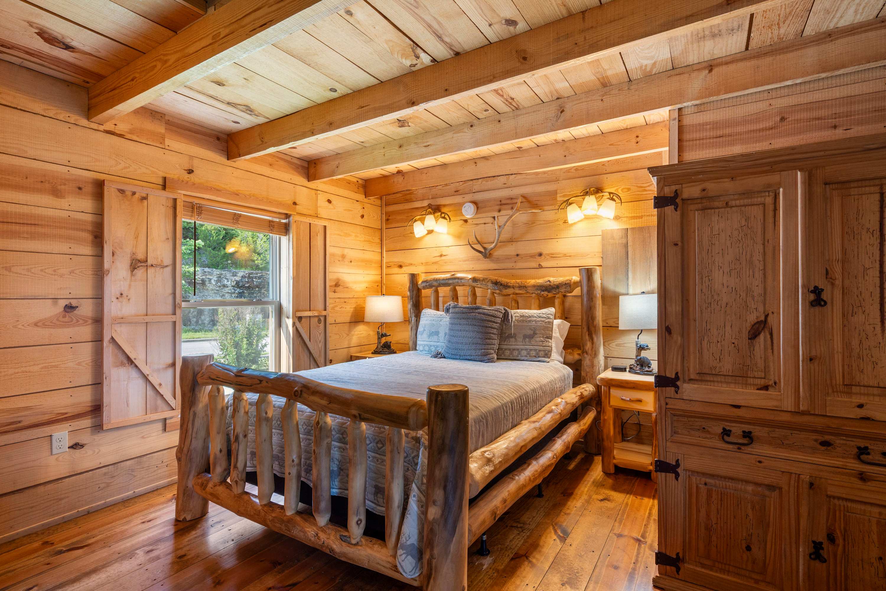 Antlers Lodge (#150) comfortably sleeps 4 guests between an open-concept bedroom and a queen-size sleeper sofa in the living room.