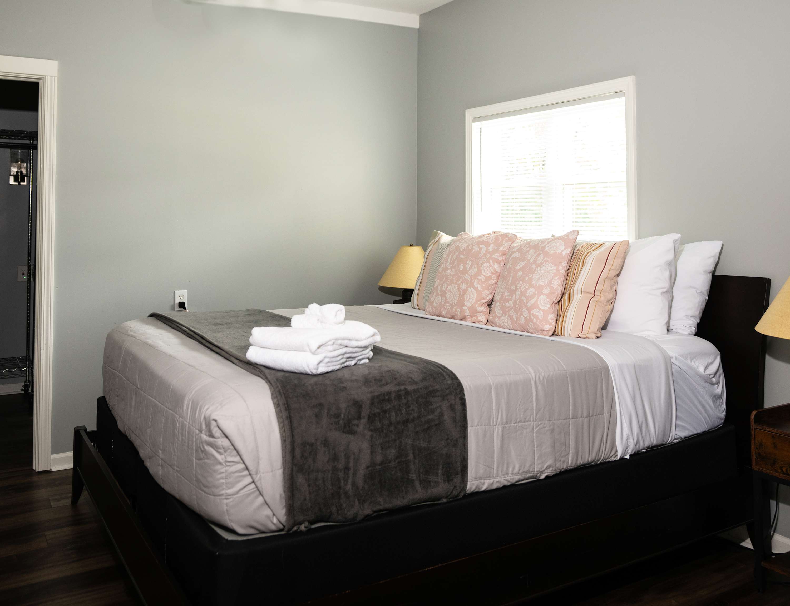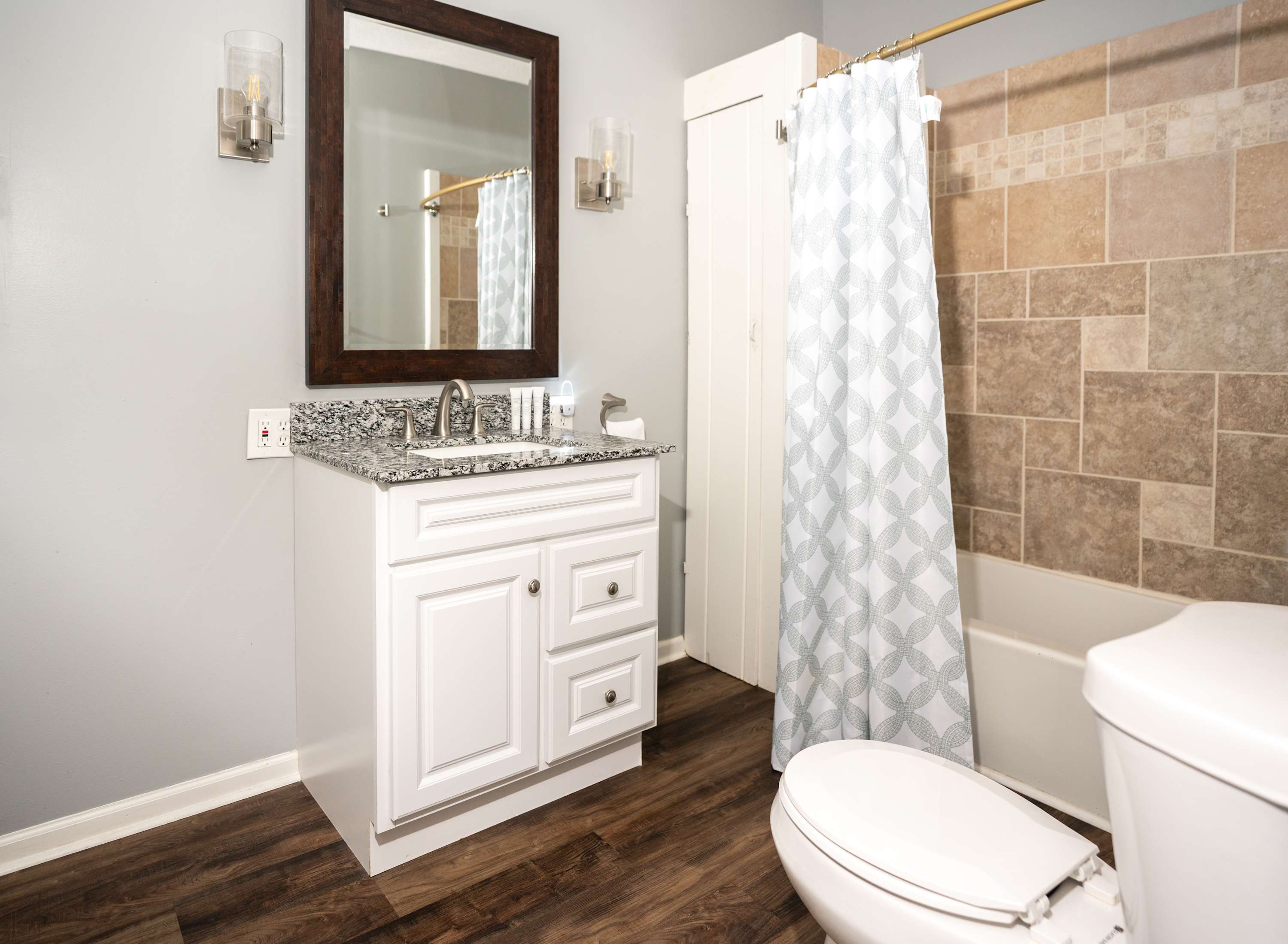 Bedroom #1 includes a king size bed, a smart TV, and an ensuite bathroom with a single vanity and a shower/tub combo.