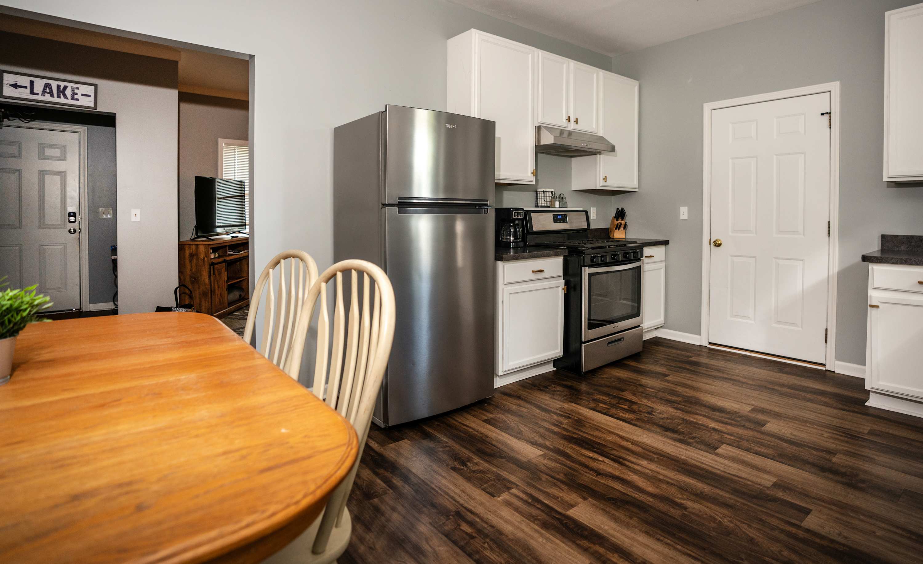 Step inside Three Blocks from Paradise and feel instantly at home. The open-concept living room invites relaxation with a plush sectional and ottoman set perfectly in front of a smart TV—ideal for cozy movie nights or lazy mornings. The kitchen is bright and stylish, featuring crisp white cabinetry, sleek dark countertops, stainless steel appliances, and a Keurig to jumpstart your mornings. Gather around the dining table for six to share meals, play games, or plan your next day’s adventures. When the weather calls, step out onto the deck—complete with a grill—where you can cook up your favorites and enjoy dinner under the open sky.