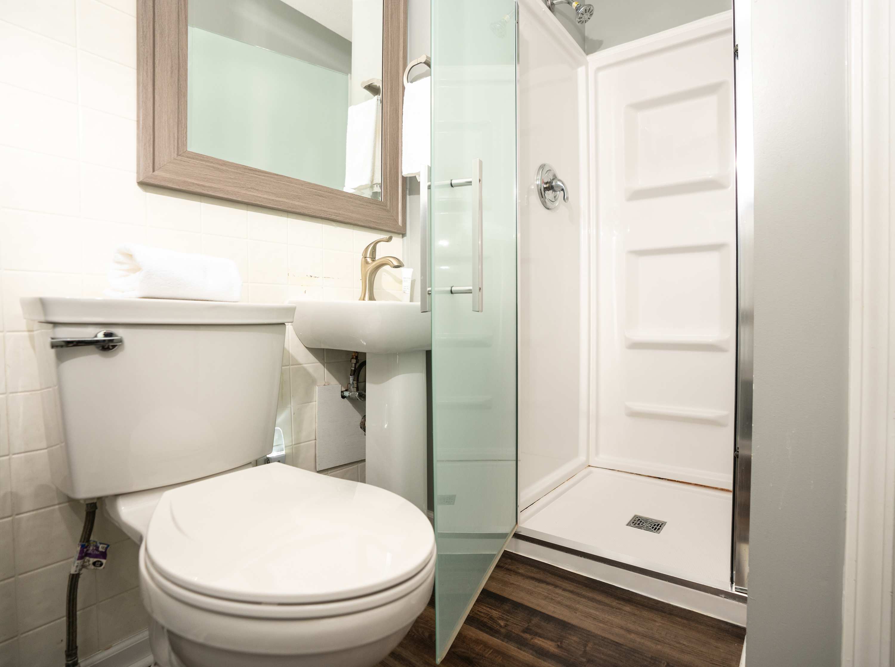 This home also includes an additional full bathroom with a pedestal sink and a walk-in shower.