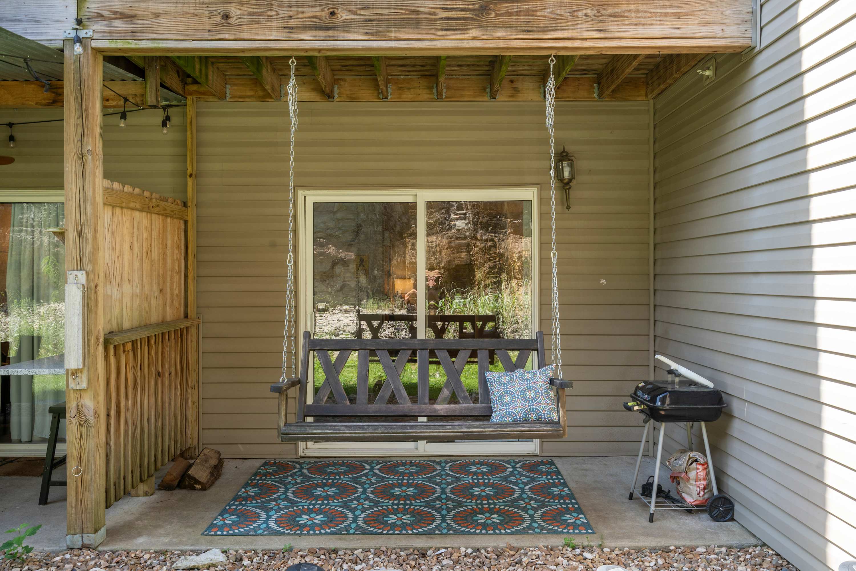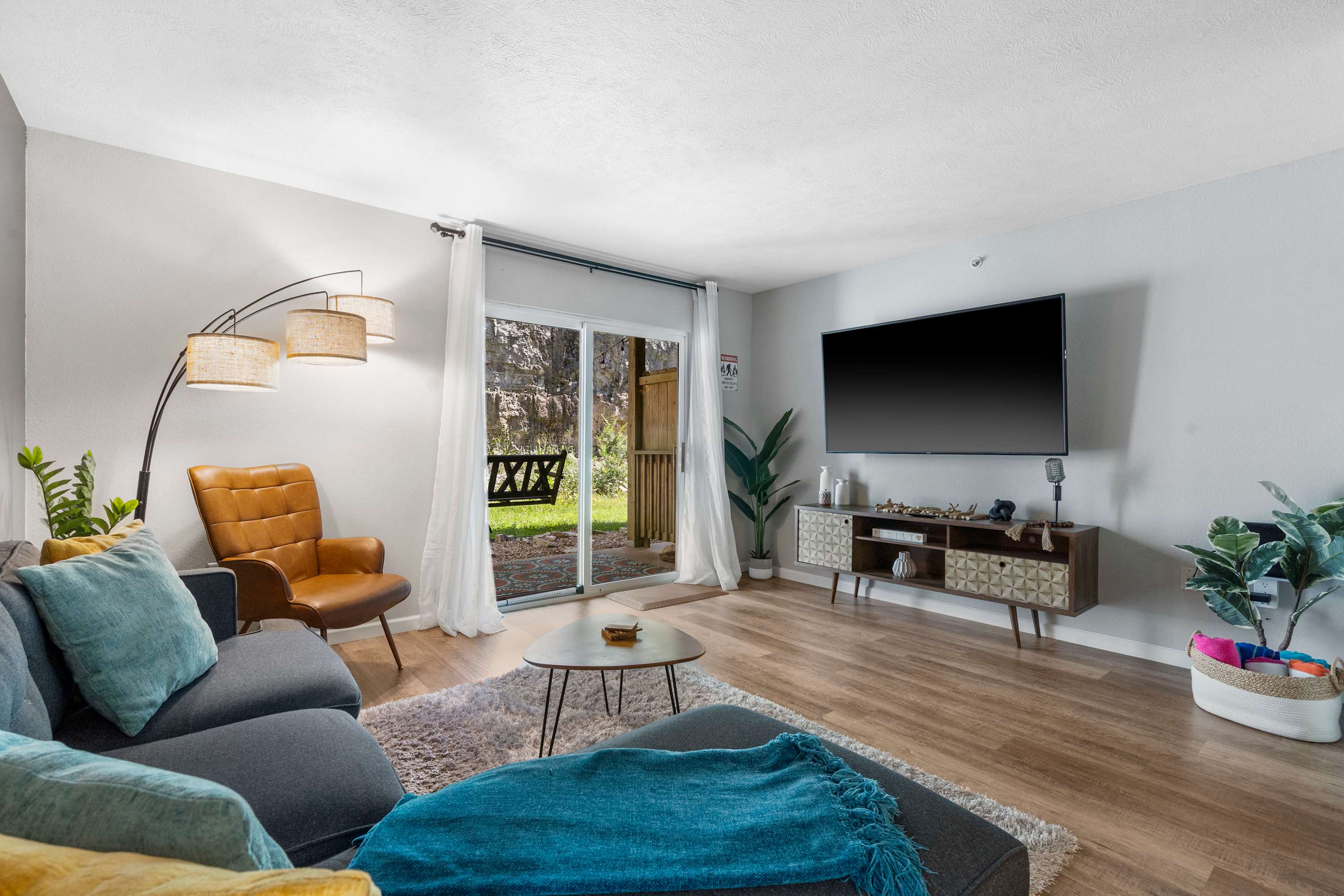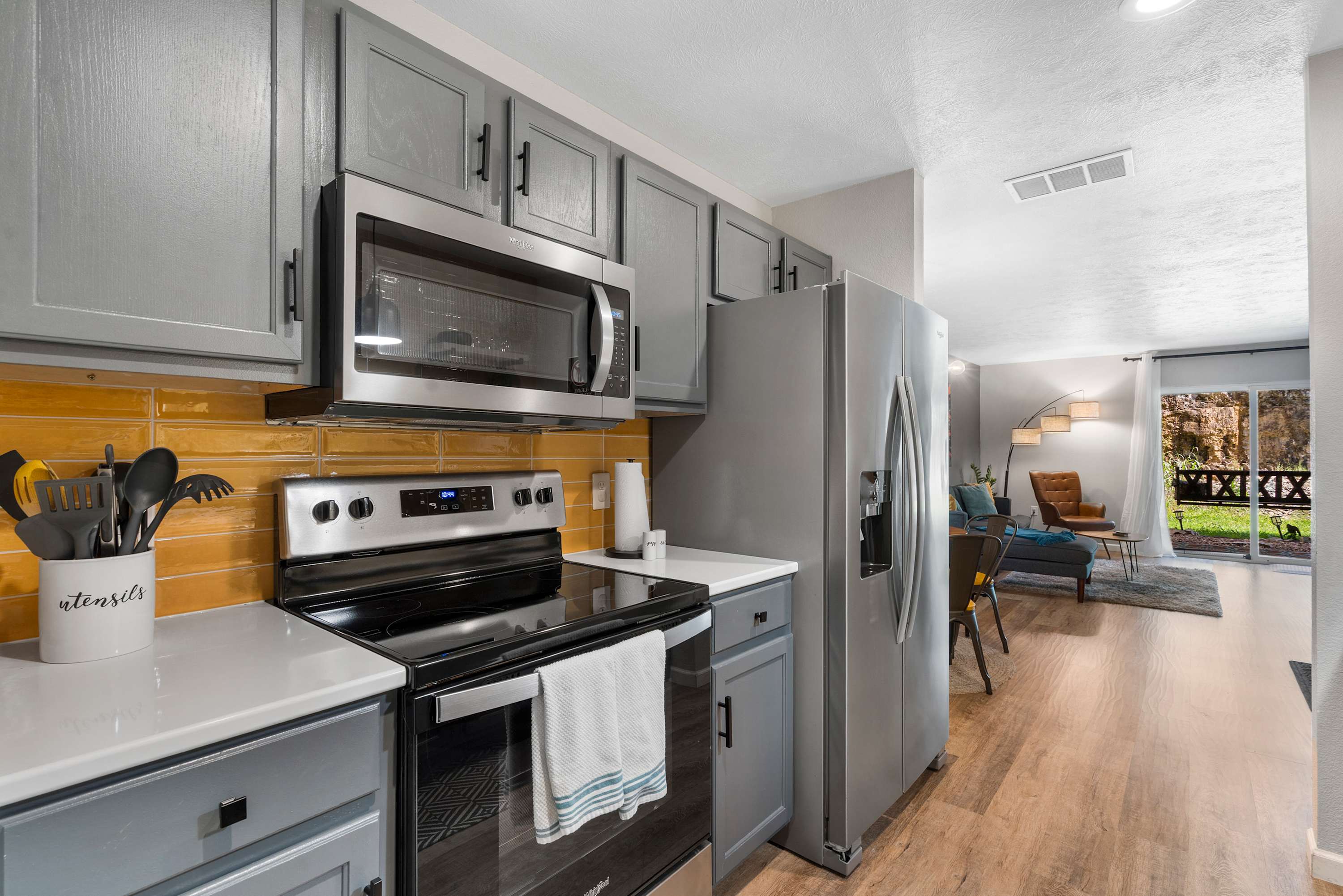 Step inside this inviting condo and discover a space designed for comfort and simplicity. The kitchen is a stylish standout with slate blue cabinetry, crisp white countertops, and gleaming stainless steel appliances—whether you’re brewing your morning cup with the Keurig or drip coffee maker, or preparing a casual dinner, everything you need is right at your fingertips. The dining table for four sits between the kitchen and living room, perfect for meals or game nights. At the end of your days exploring, curl up on the plush couch in the living room and stream your favorites on the smart TV. Head out through the sliding glass doors that lead to your private patio where you can enjoy the quiet breeze from the hanging bench swing or sip a glass of wine as the sun dips behind the Ozark hills.