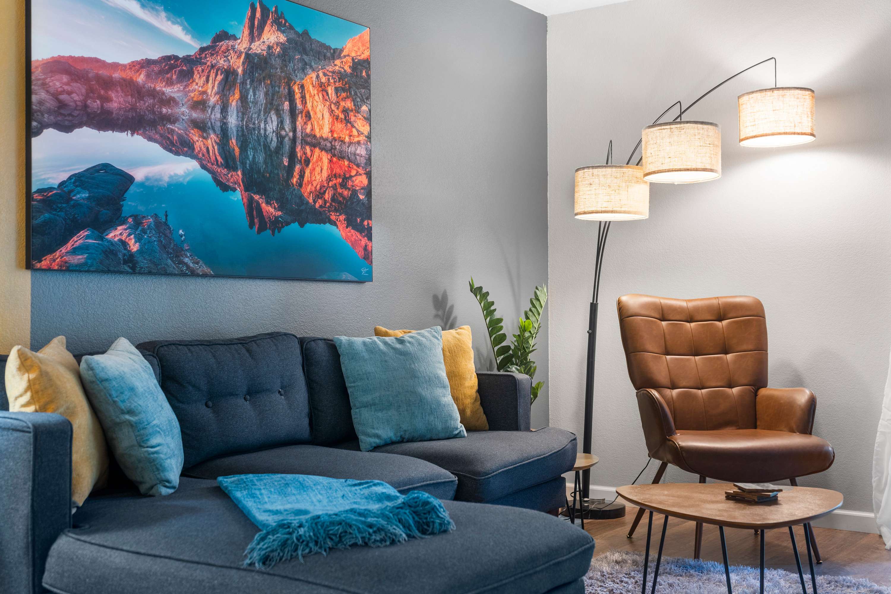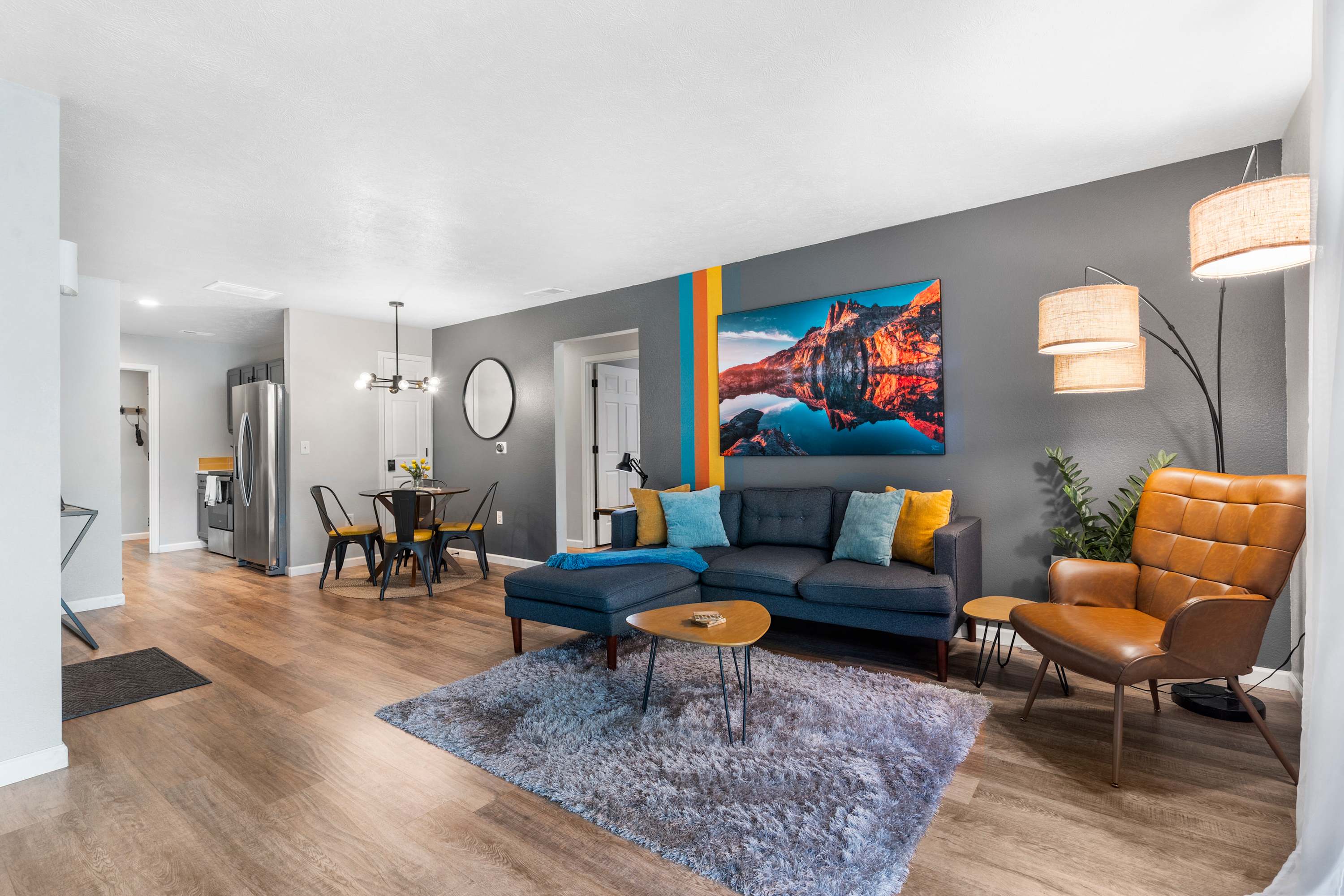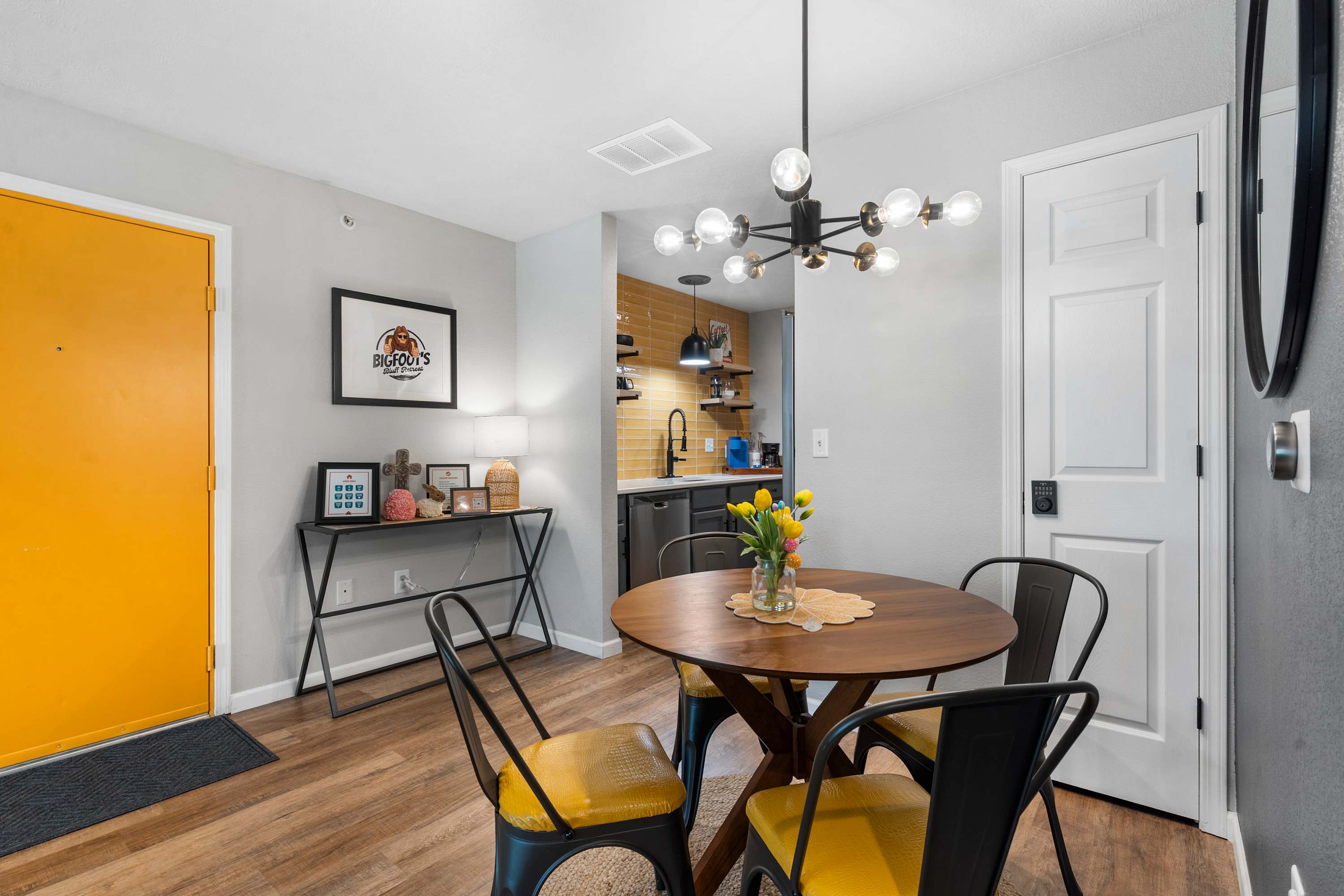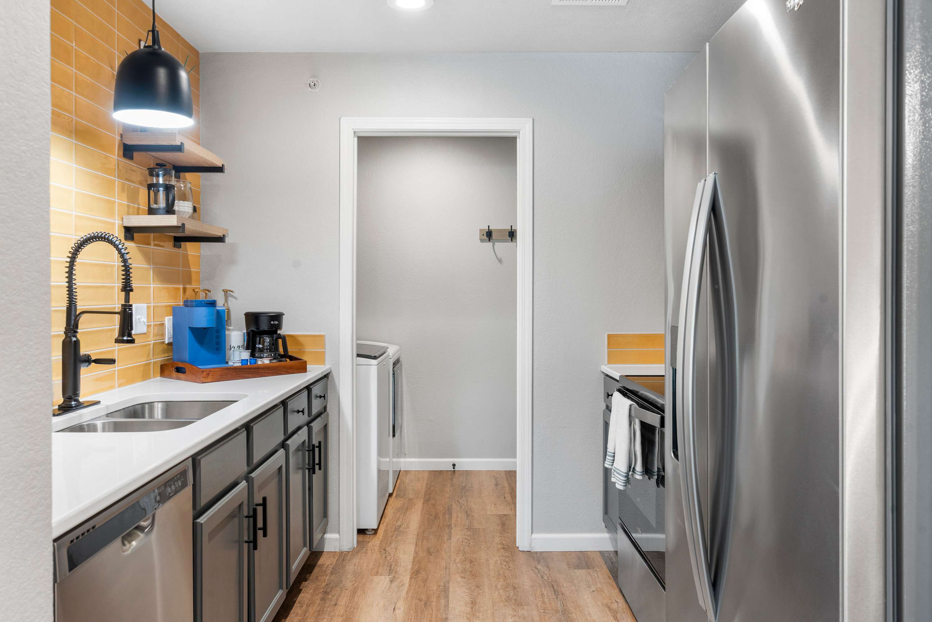 Step inside this inviting condo and discover a space designed for comfort and simplicity. The kitchen is a stylish standout with slate blue cabinetry, crisp white countertops, and gleaming stainless steel appliances—whether you’re brewing your morning cup with the Keurig or drip coffee maker, or preparing a casual dinner, everything you need is right at your fingertips. The dining table for four sits between the kitchen and living room, perfect for meals or game nights. At the end of your days exploring, curl up on the plush couch in the living room and stream your favorites on the smart TV. Head out through the sliding glass doors that lead to your private patio where you can enjoy the quiet breeze from the hanging bench swing or sip a glass of wine as the sun dips behind the Ozark hills.
