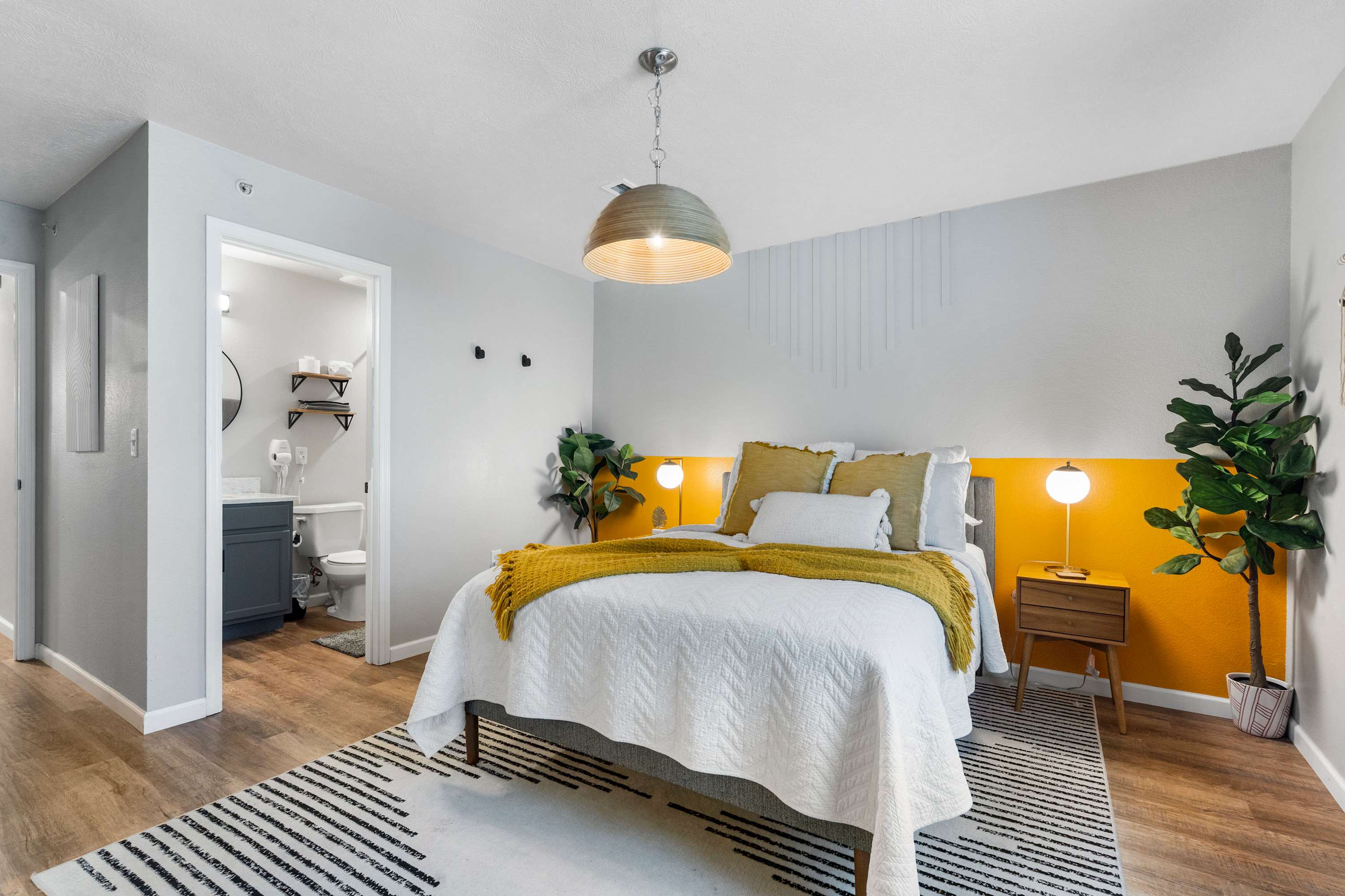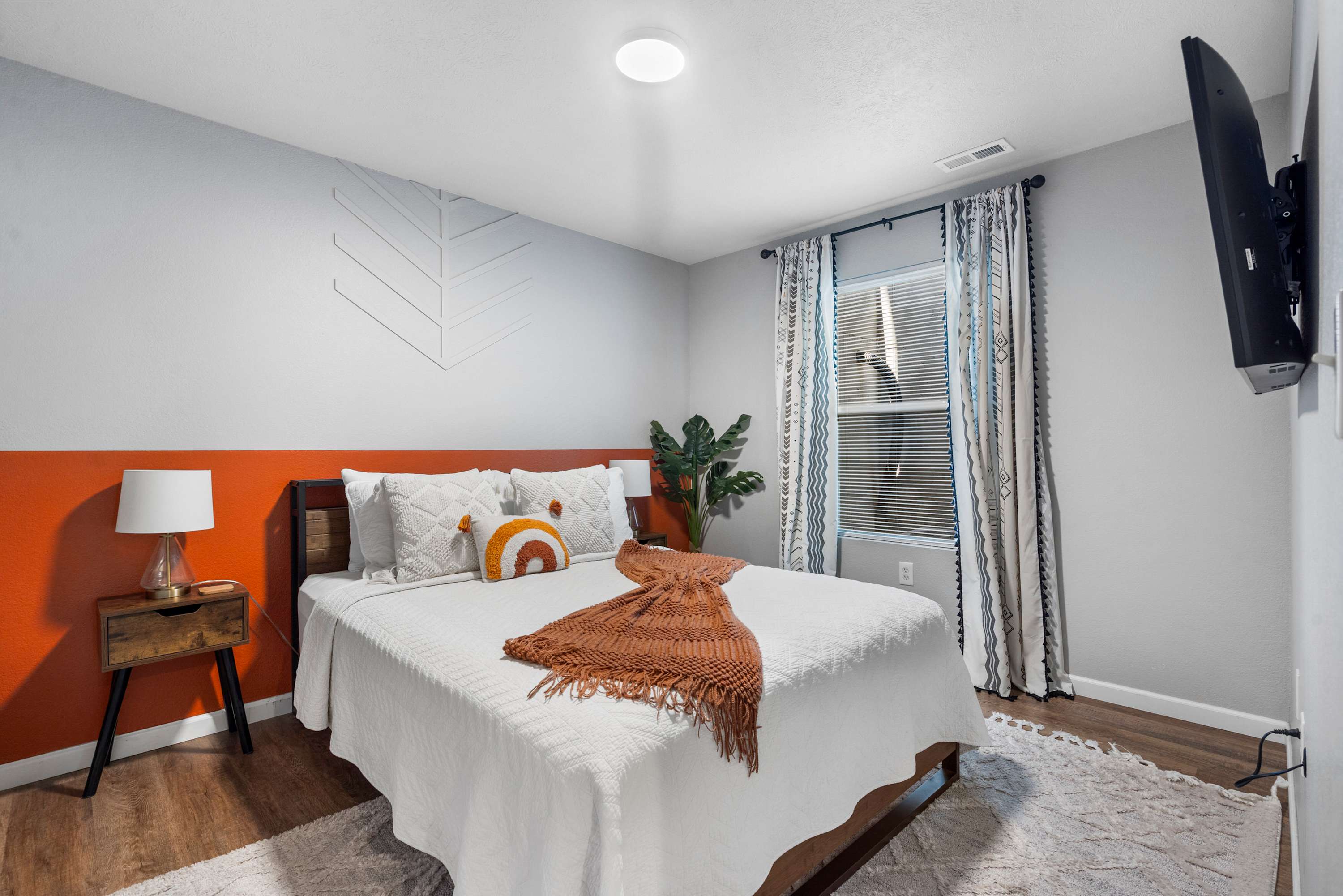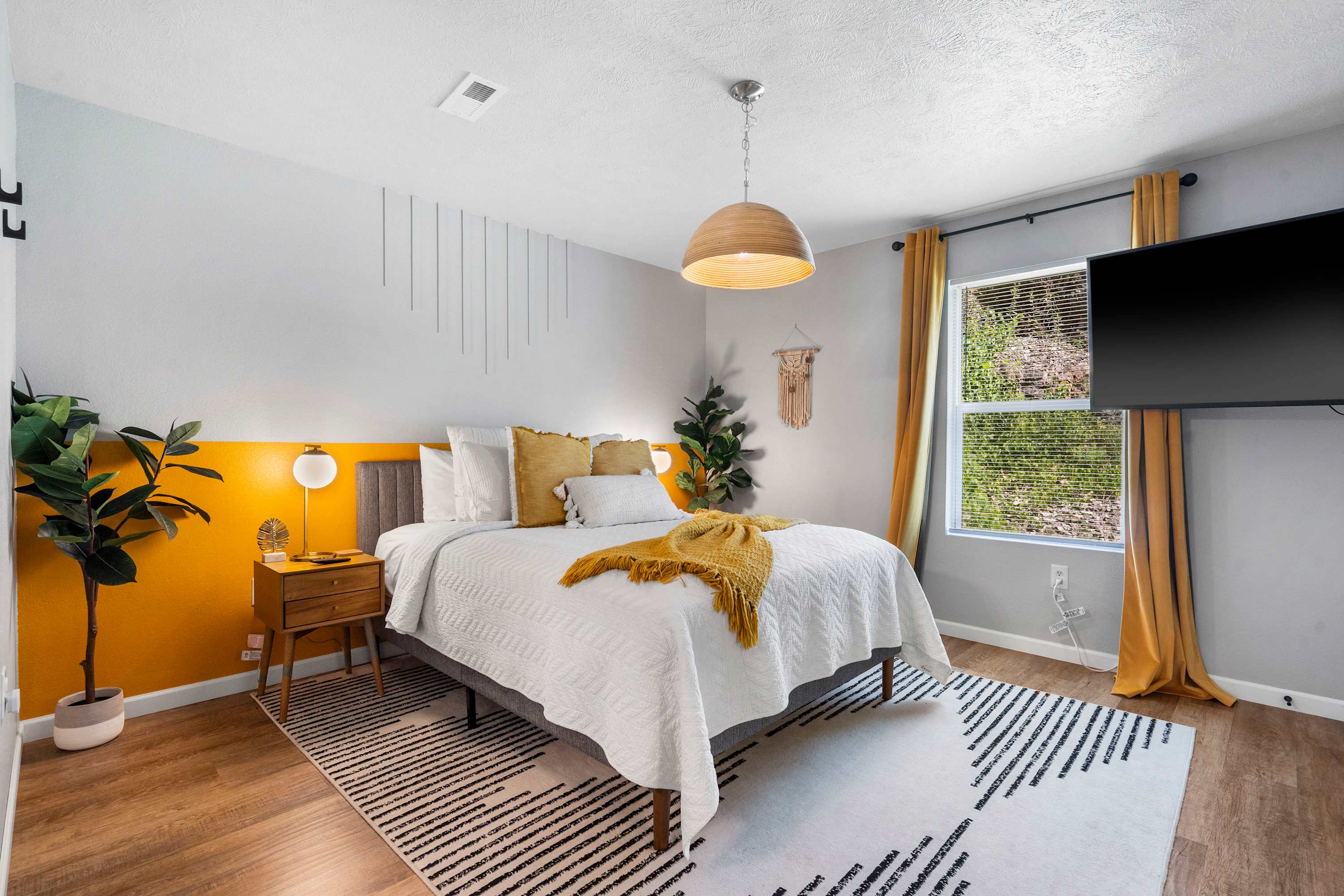 Bedroom #1 includes a queen size bed, a smart TV, and an ensuite bathroom with a single vanity and a shower/tub combo.