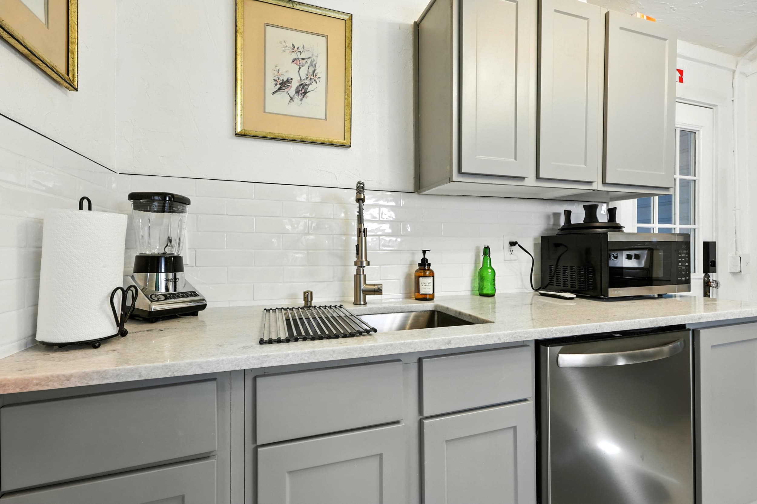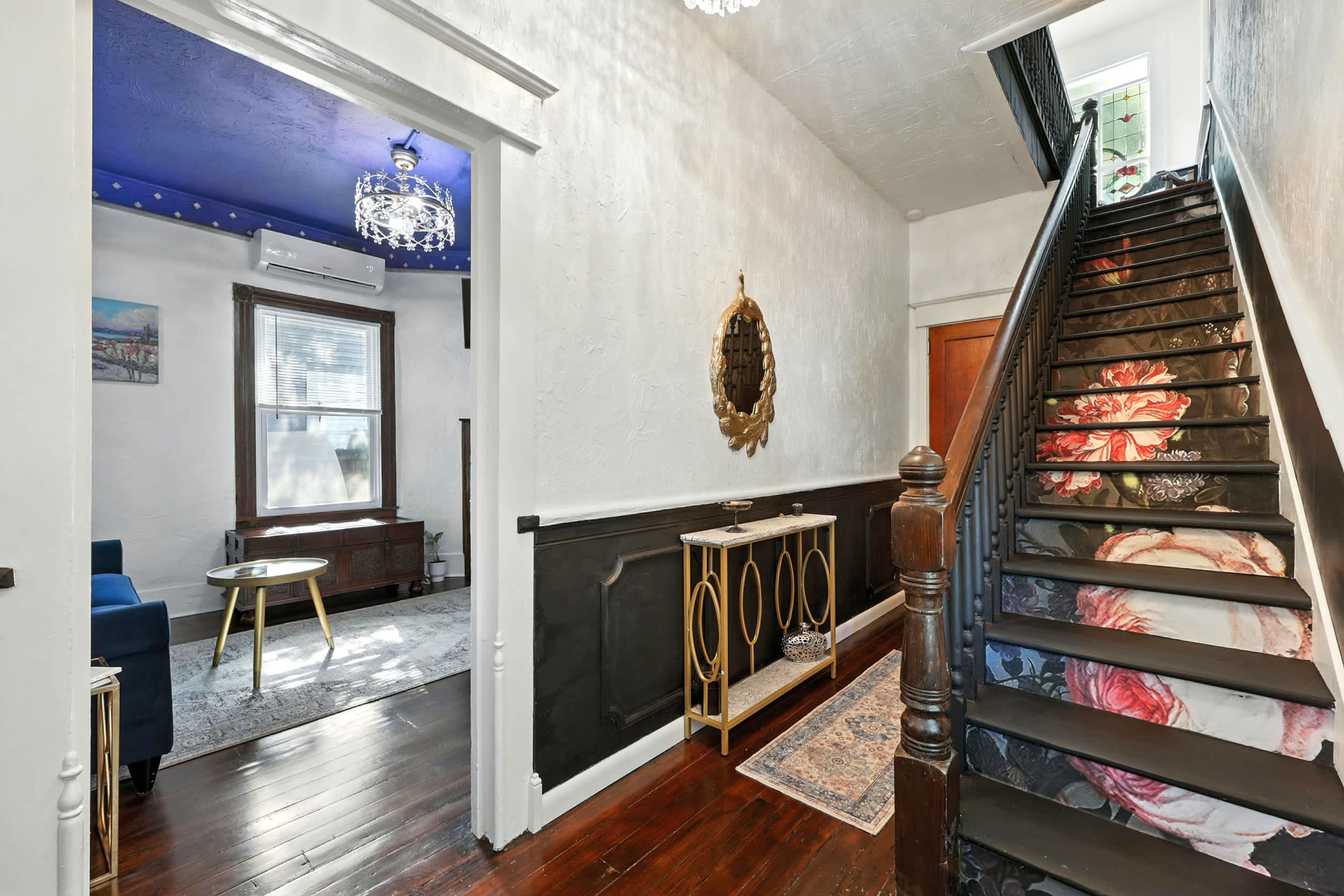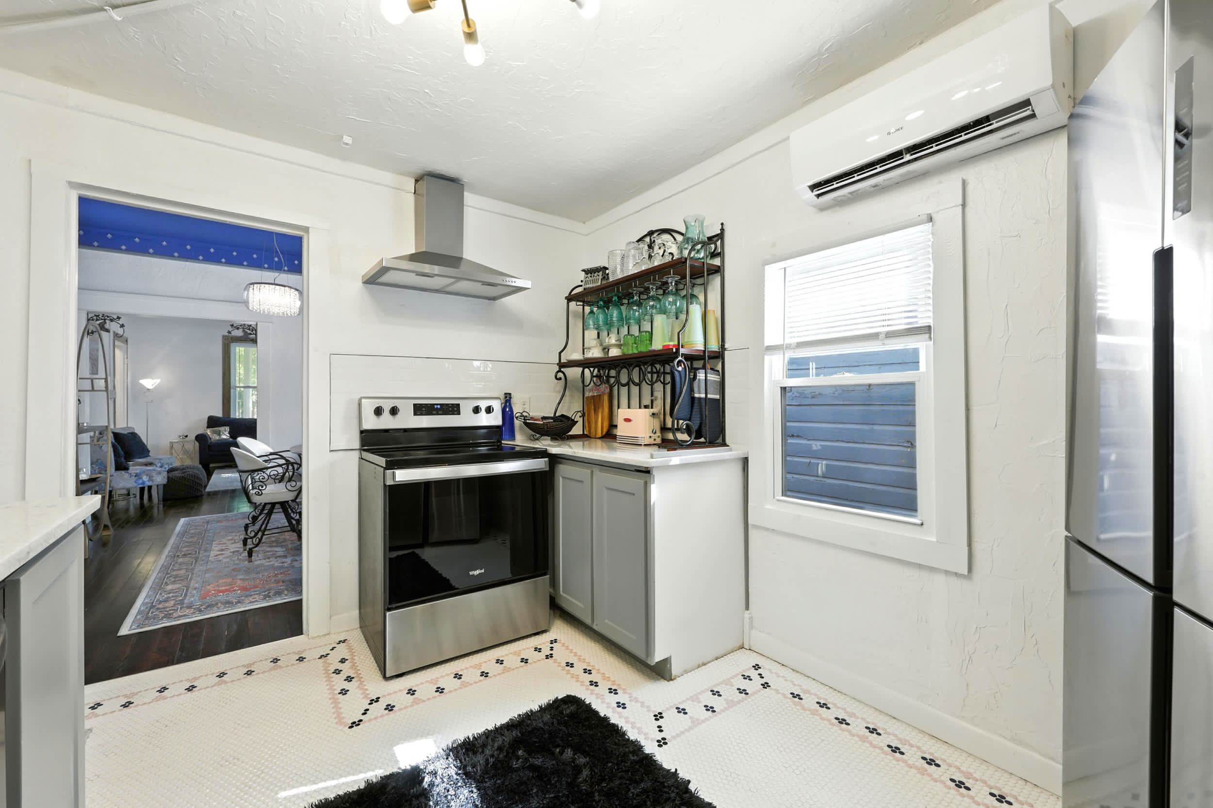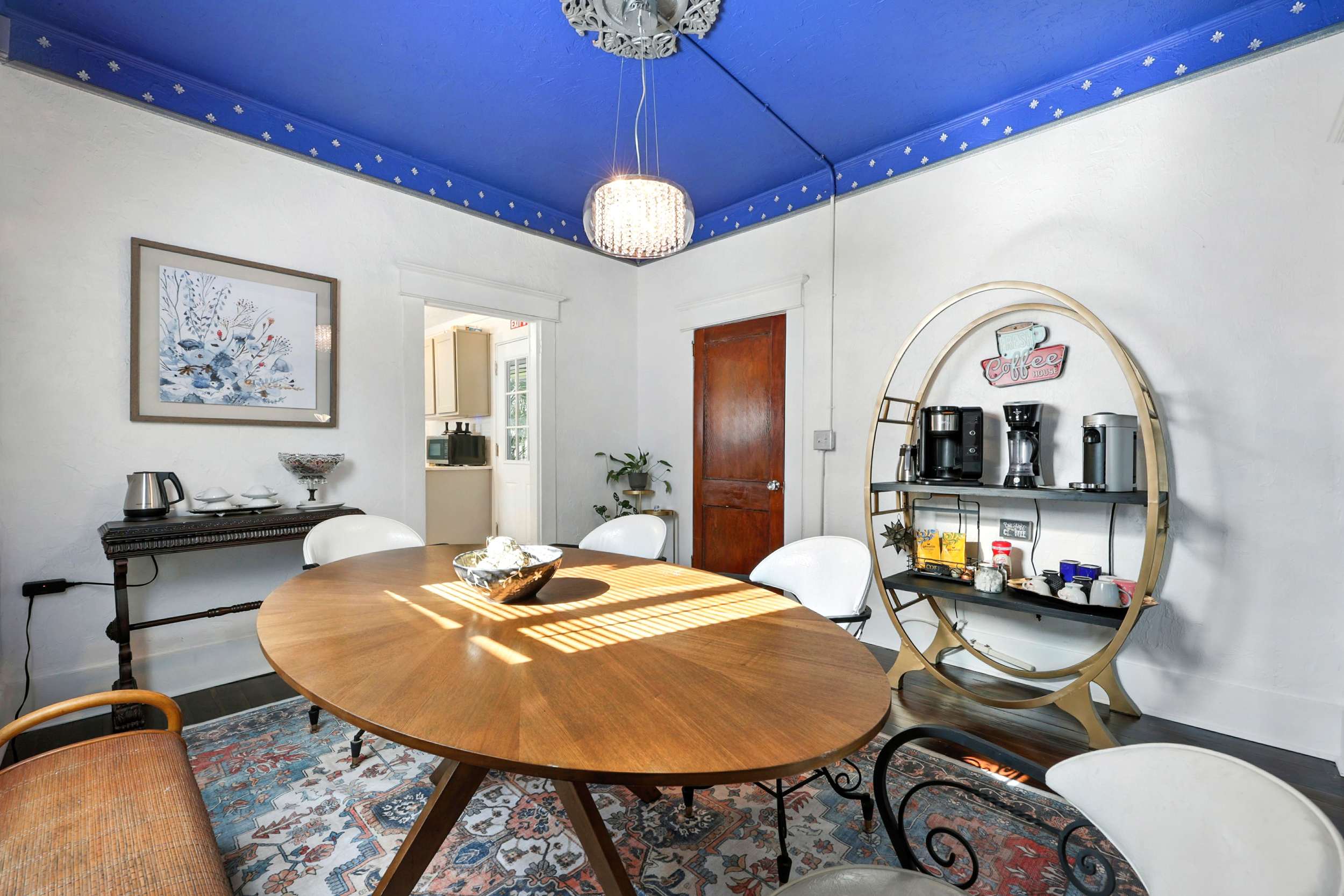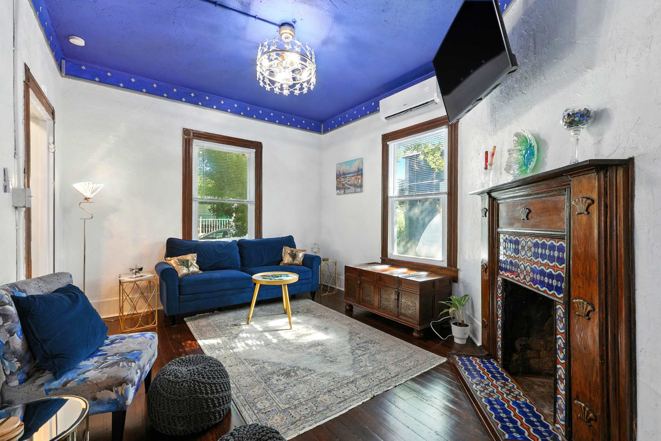 Inside, Periwinkle Perch blends timeless charm with modern comforts. Step into the formal living room, where a cozy couch, inviting accent chair, and smart TV surround a decorative fireplace that pays tribute to the home’s past. The kitchen is a unique blend of old and new, featuring antique dining chairs reupholstered in fresh fabric, stainless steel appliances, and a thoughtfully curated coffee bar with a Nespresso, Keurig, and drip coffee maker to suit every caffeine craving. Share meals at the dining table for six, or start your day with coffee on the front porch, enjoying the quiet energy of the neighborhood.